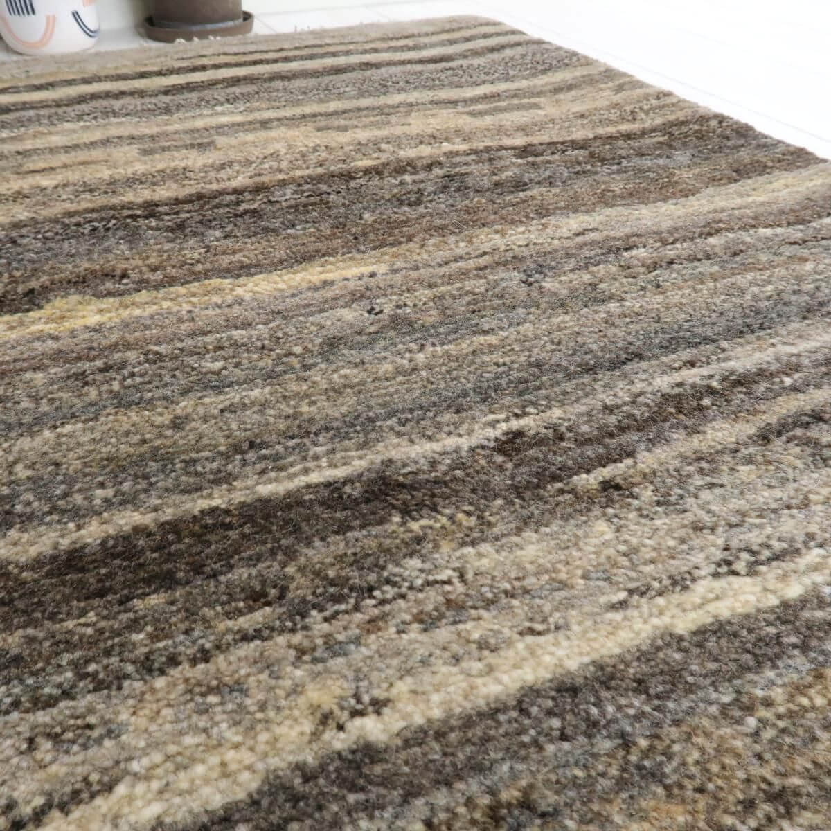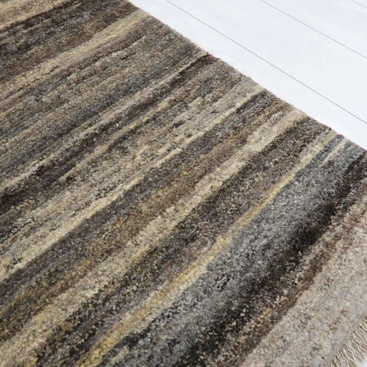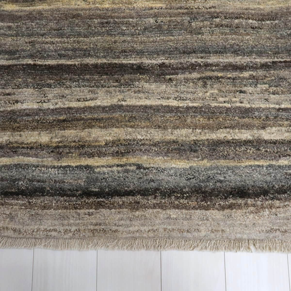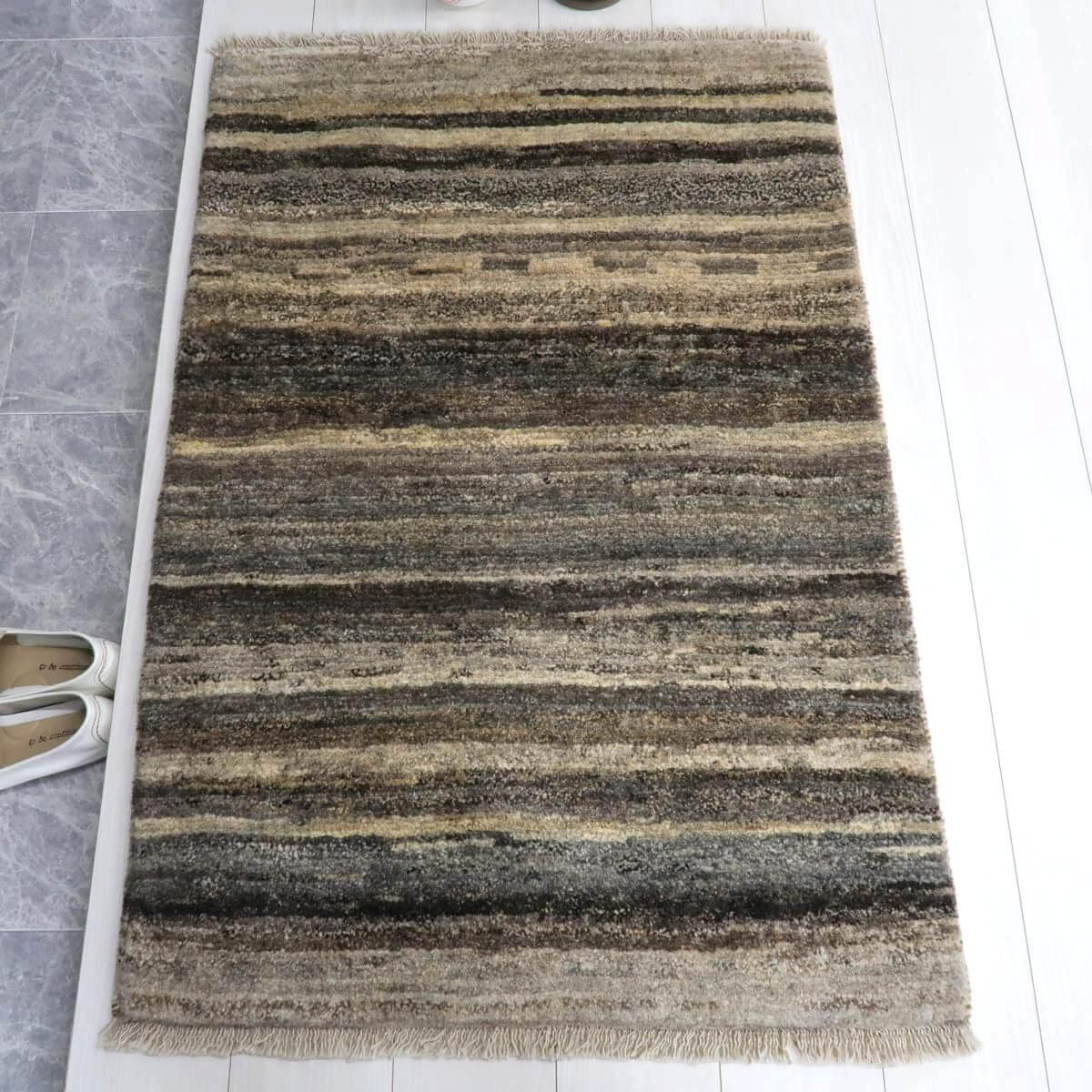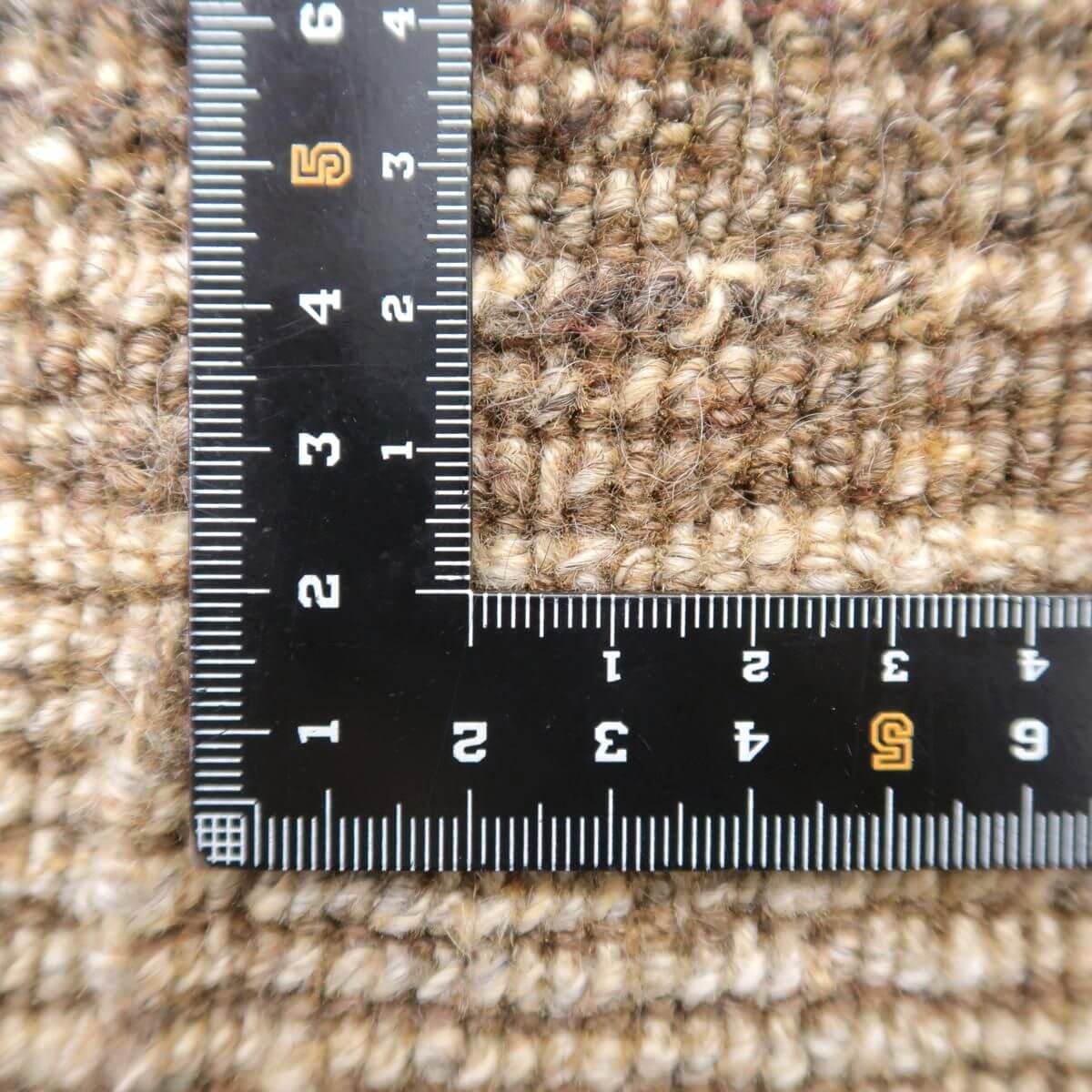 このギャッベは茶色を特徴とし、青や灰色が配置されているデザインです。