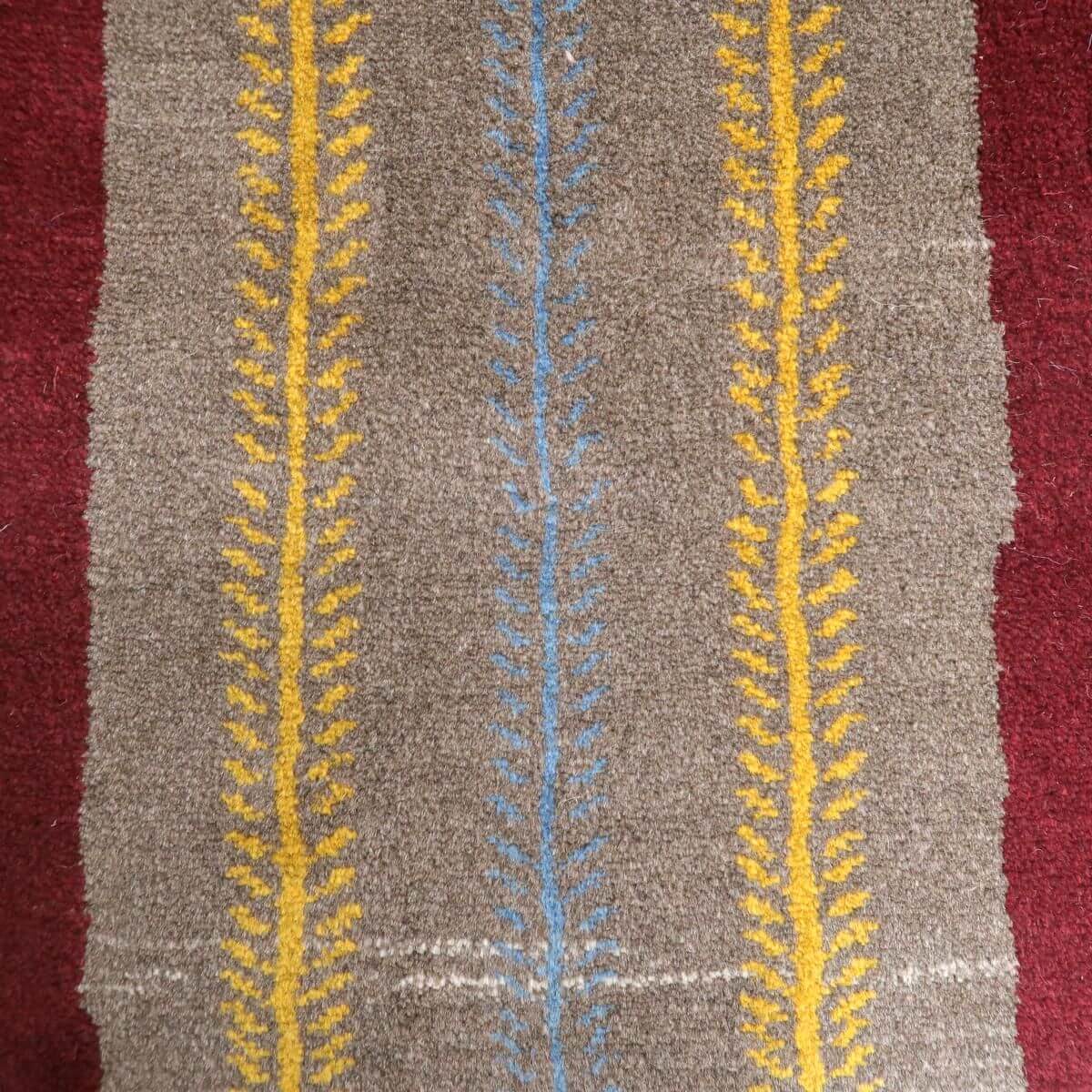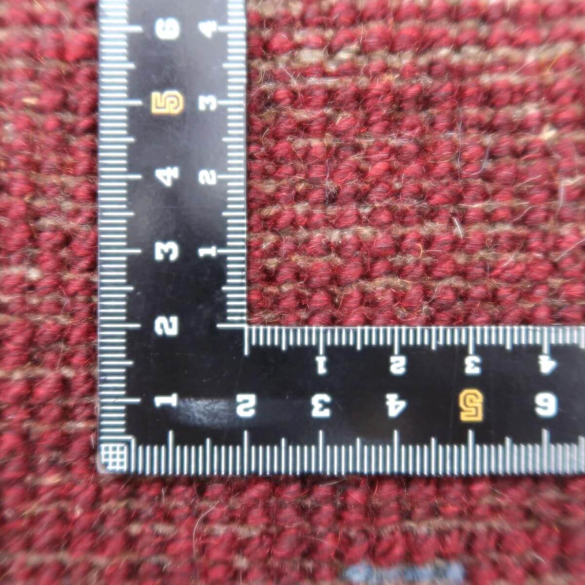 深みのある赤が特徴で、中央には灰色と黄色の線があるモチーフがあります。四角の模様には青、橙、赤、黄色の小さな色彩が描かれており、それぞれが美しさを感じさせます。