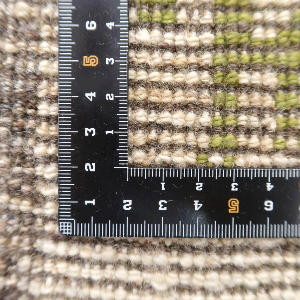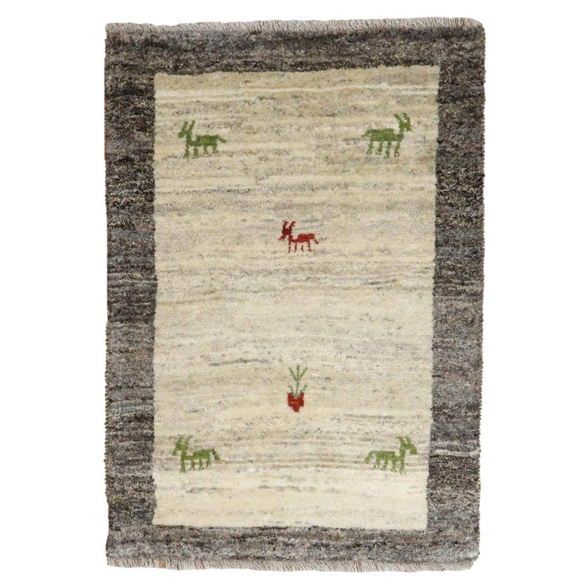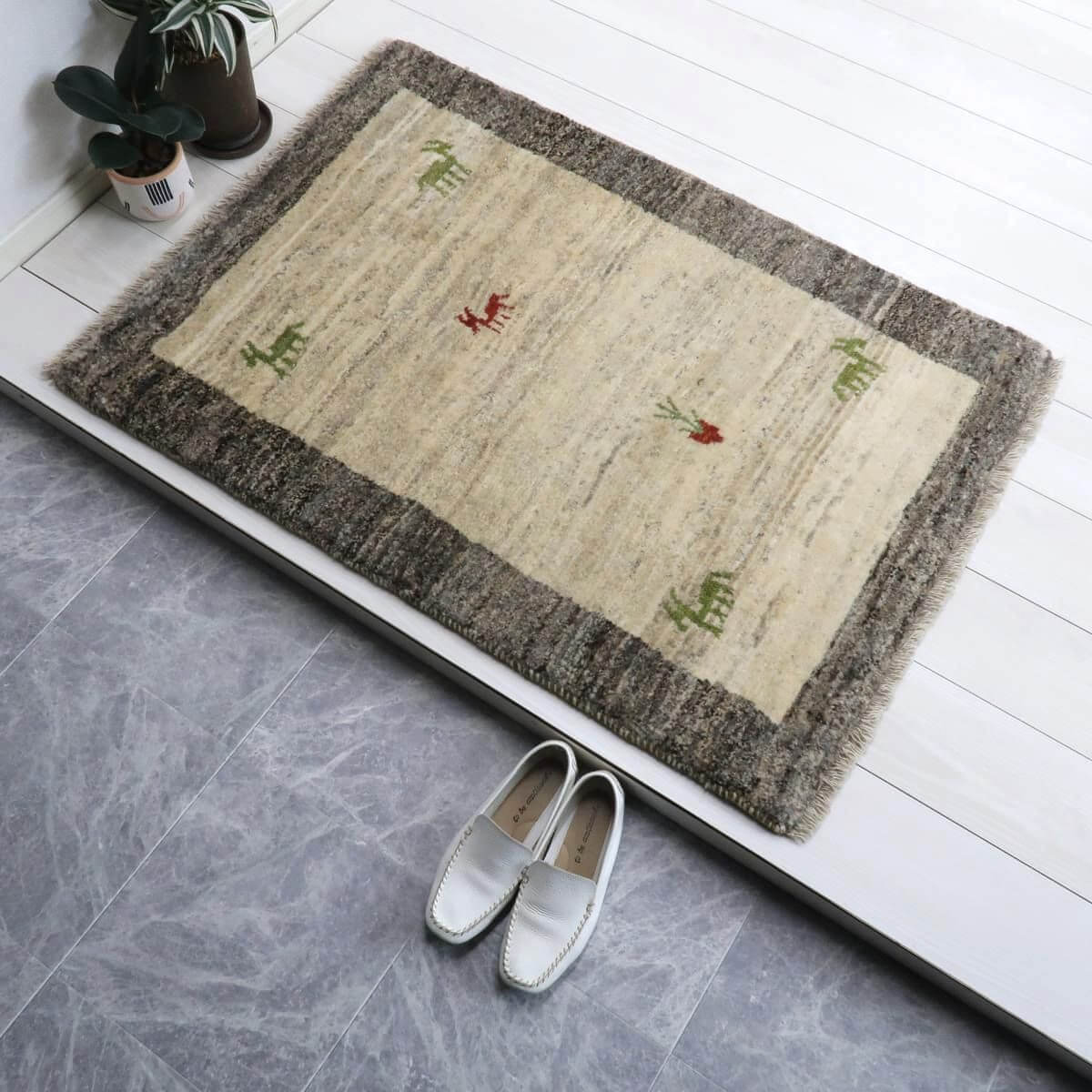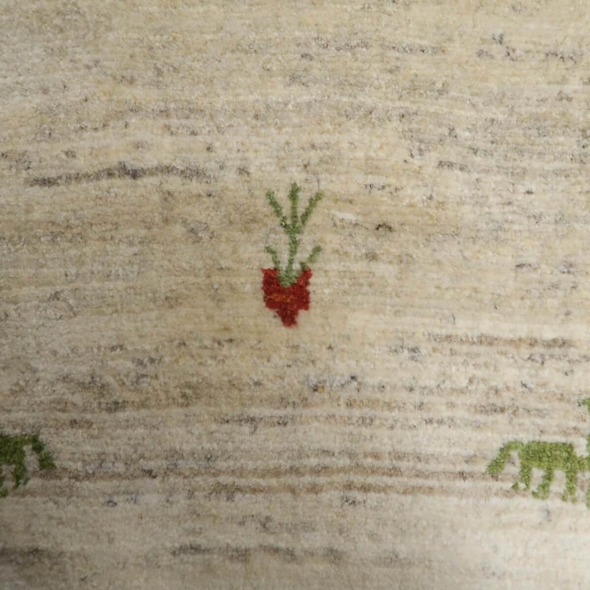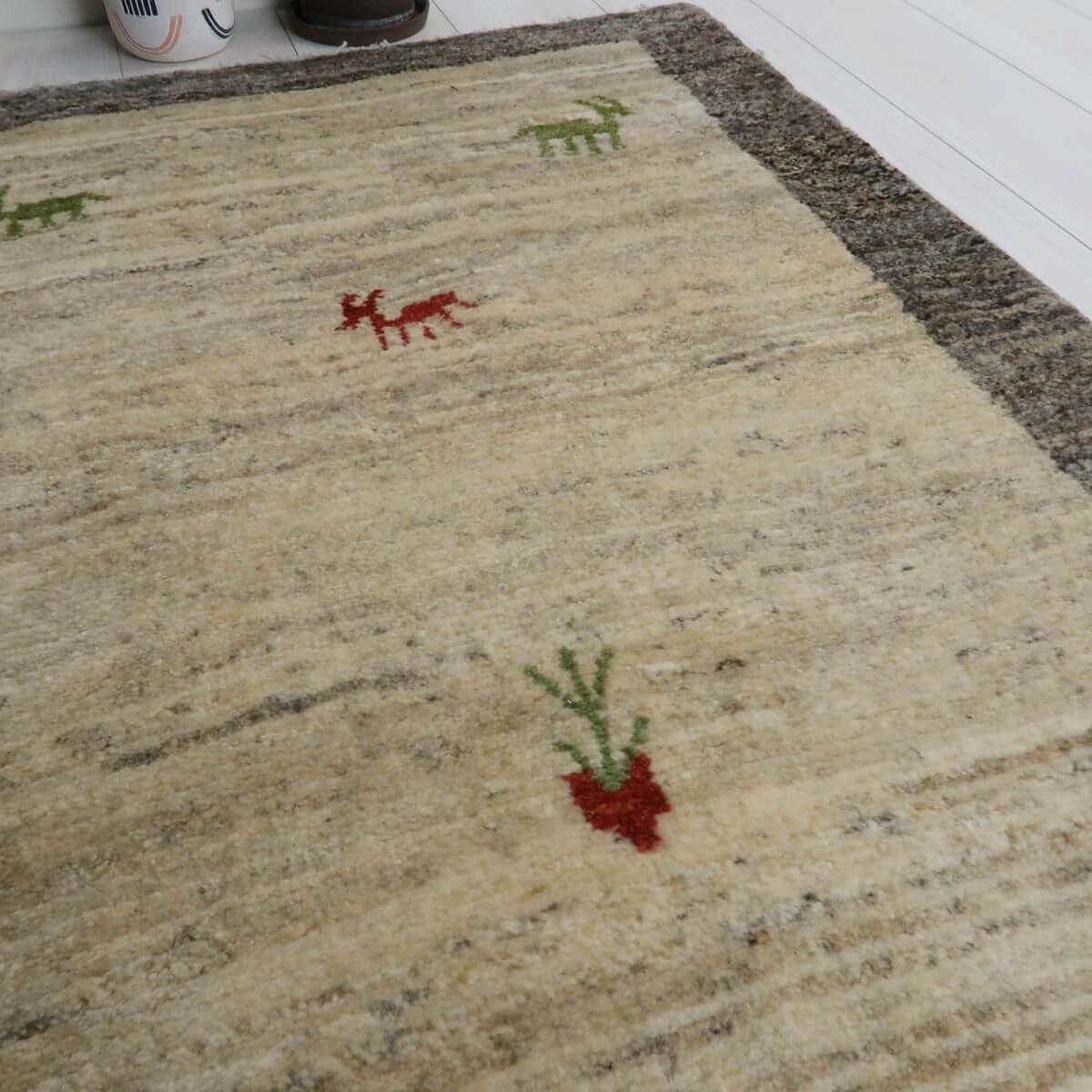 この絨毯は、生成りと灰色が特徴で、その上に赤や緑のモチーフが描かれており、柔らかな色合いで温もりを感じさせるデザインになっています。