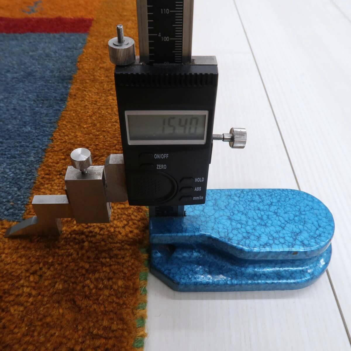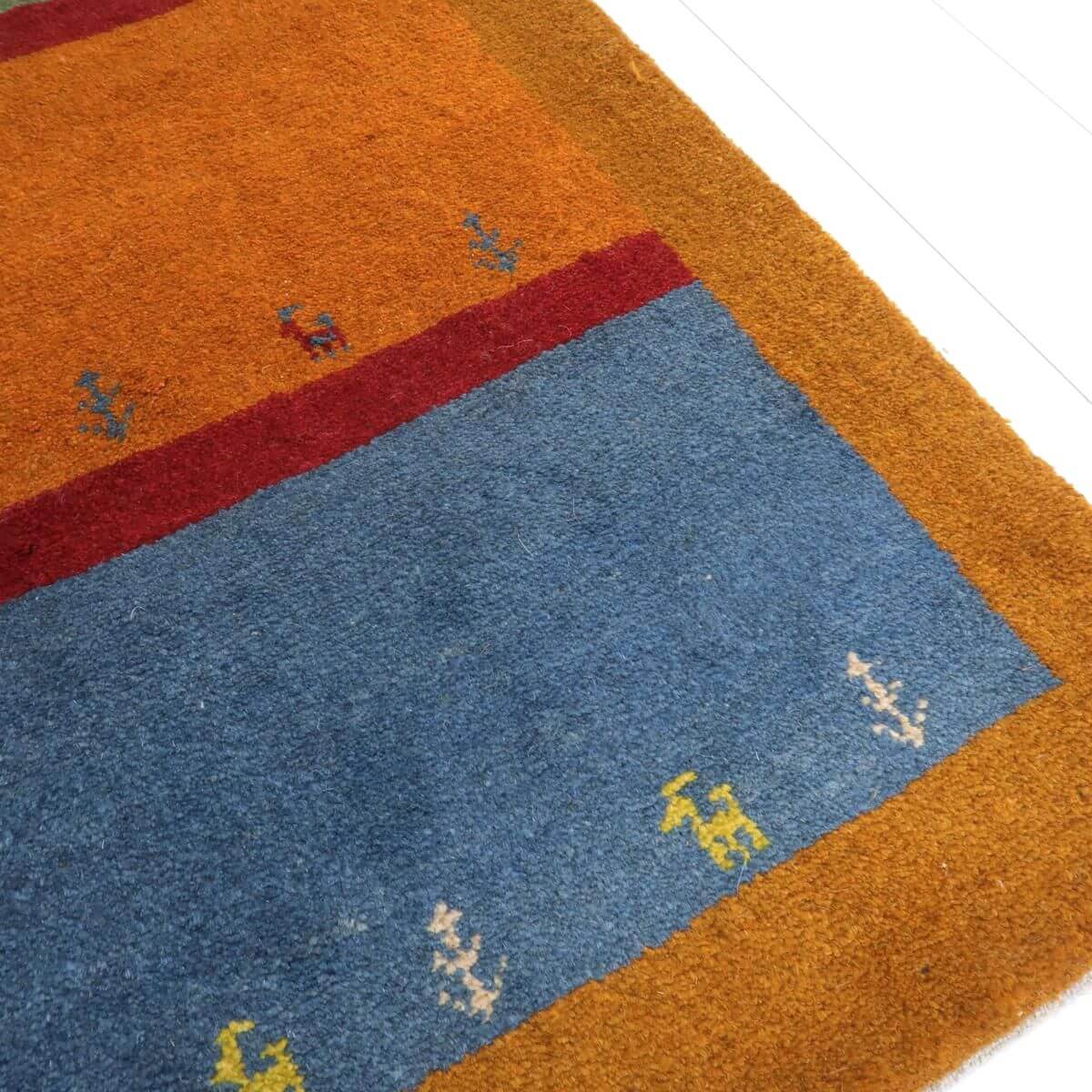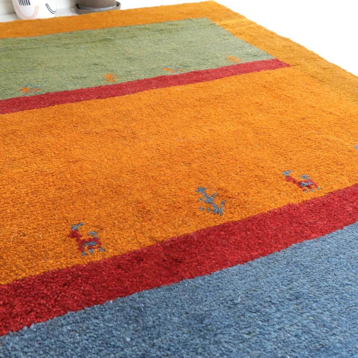 鮮やかな色彩で目を引くこの絨毯には、橙、緑、青といった豊かな色の層が積み重ねられ、それぞれに小さなモチーフが描かれています。
