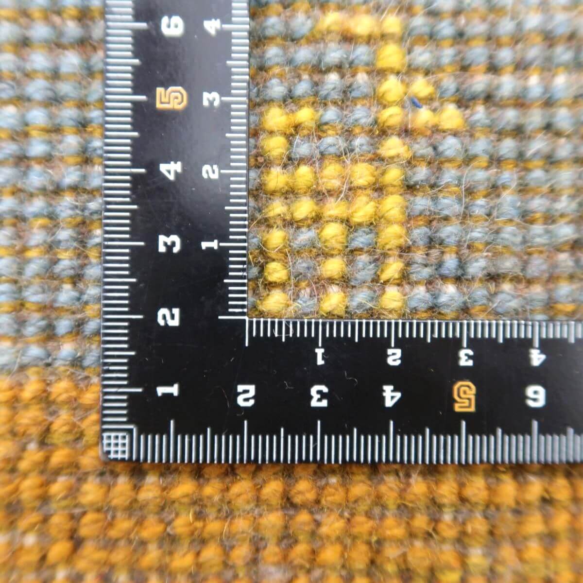 赤い線がアクセントとなり、絨毯全体に暖かさを与えています。黄色い四角の模様が目立っており、全体に明るく温かみのある印象を感じさせるデザインです。