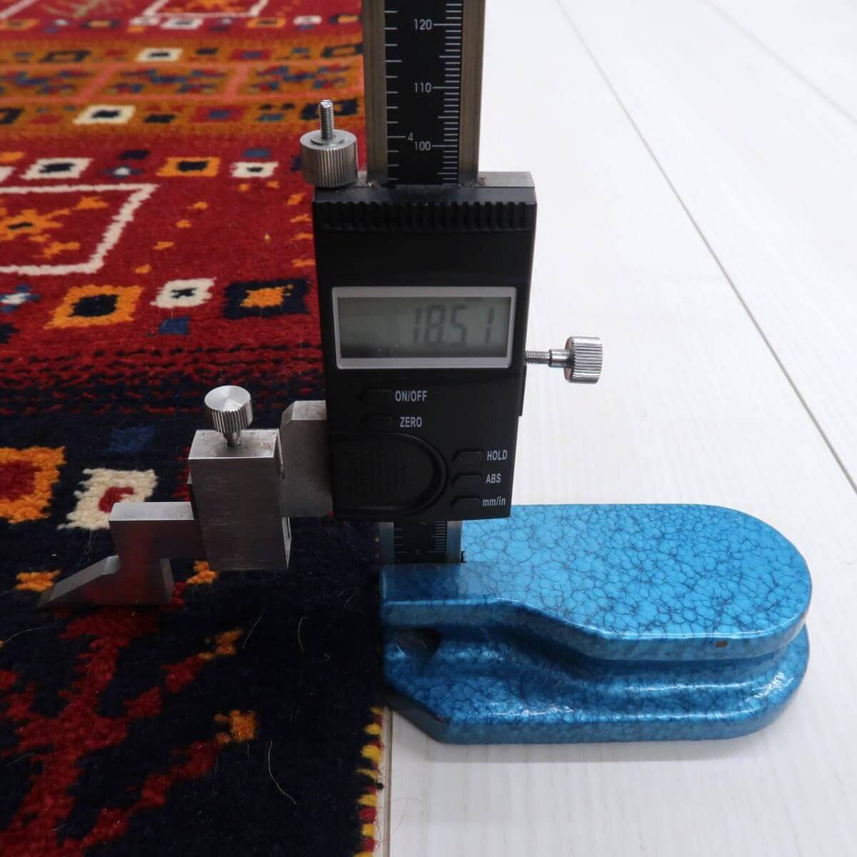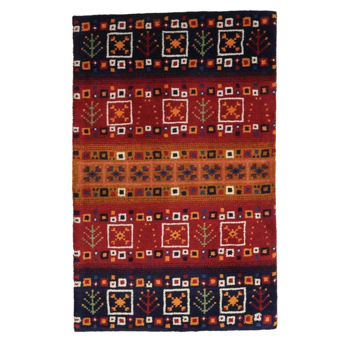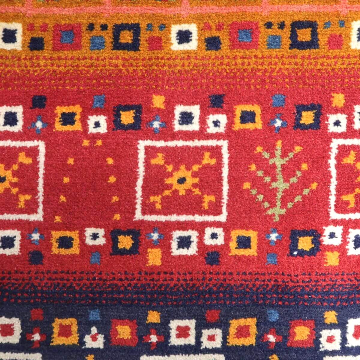 この絨毯は深い赤を中心に、四角の模様とモチーフが描かれた、力強い色彩のデザインです。