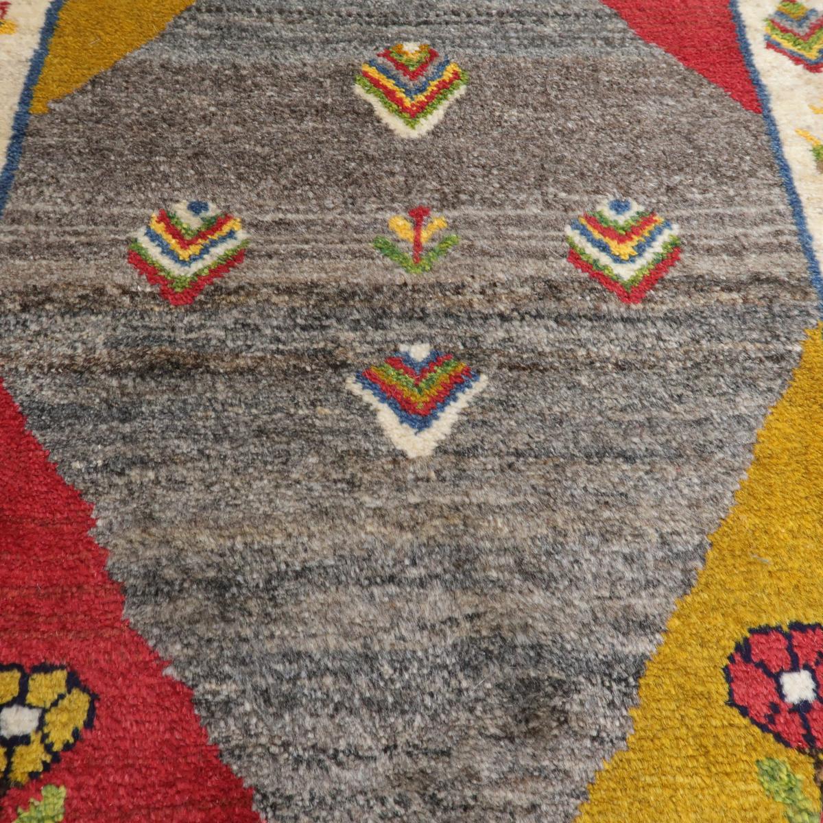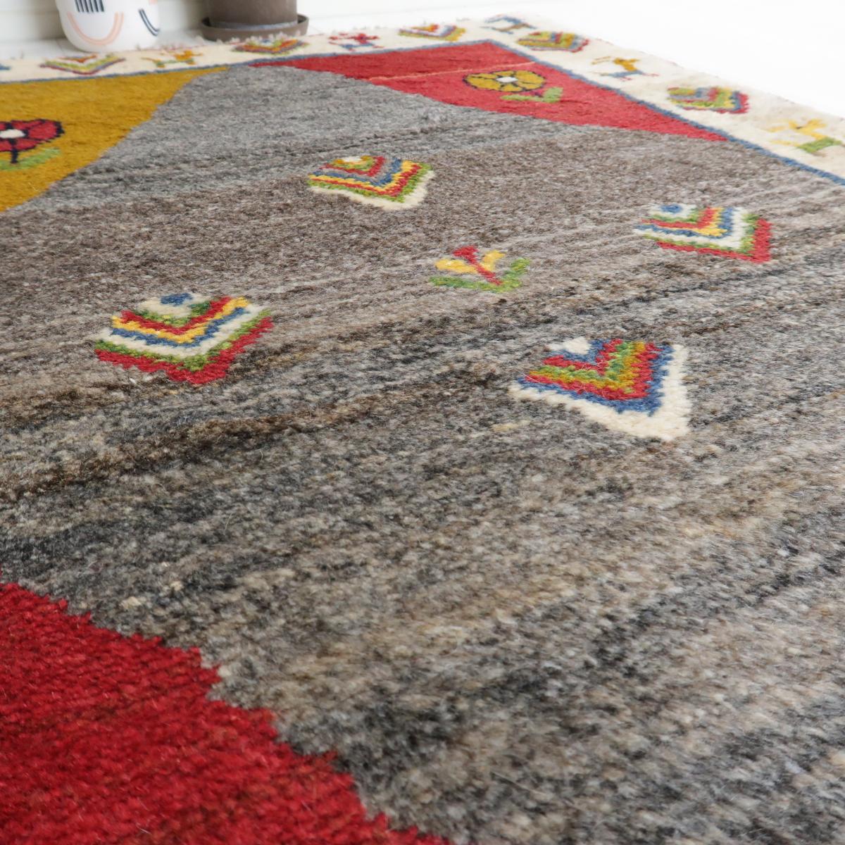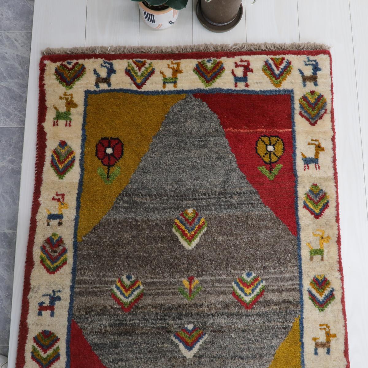 自然で温かみのある茶色のギャッベです。生命の木が幾何学的なモチーフを形成し、様々な色が織り交ぜられています。特に、赤、青、黄色の色彩が生成りの背景に対して鮮やかに描かれており、洗練された美しさを感じさせます。各色が繊細に配され、このギャッベの独特の魅力を引き立てています。