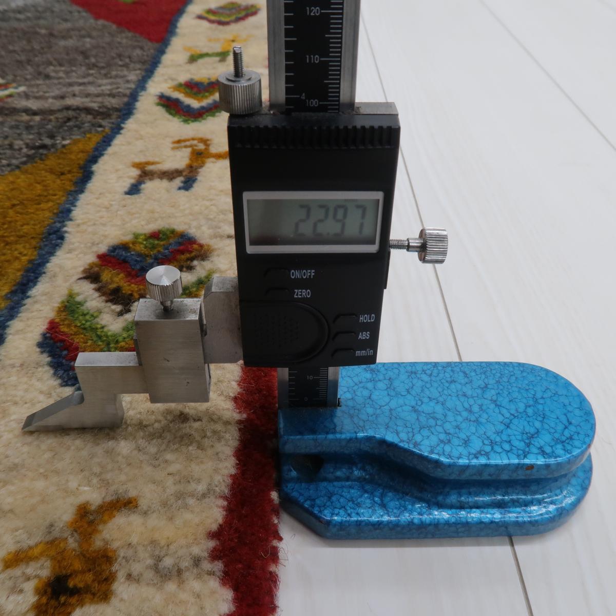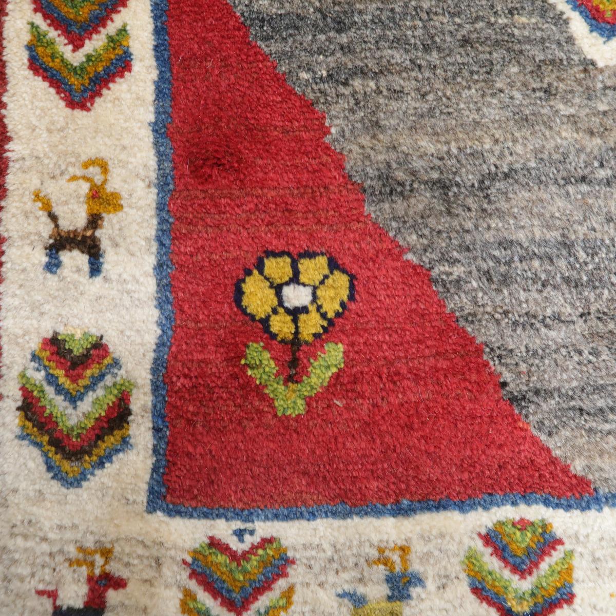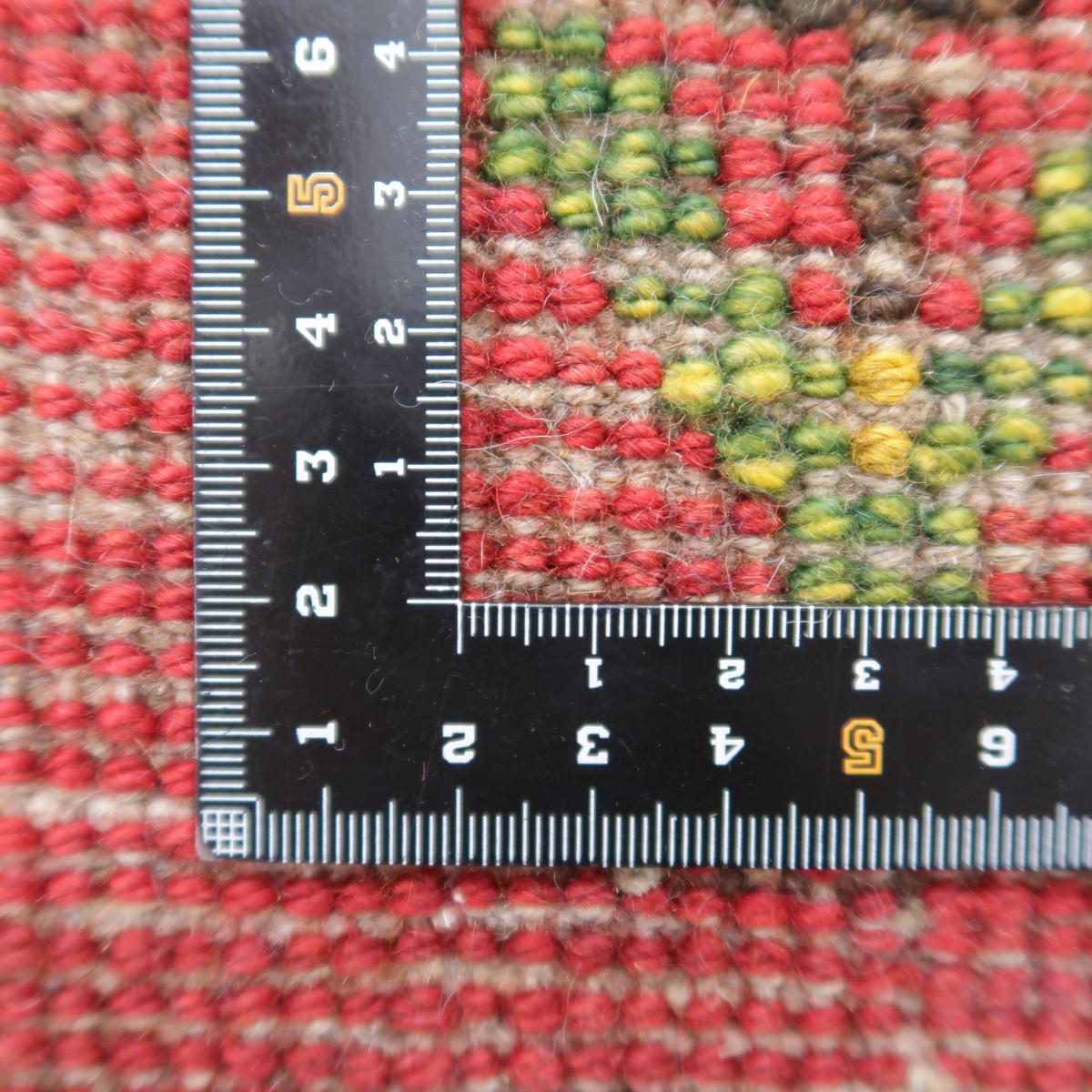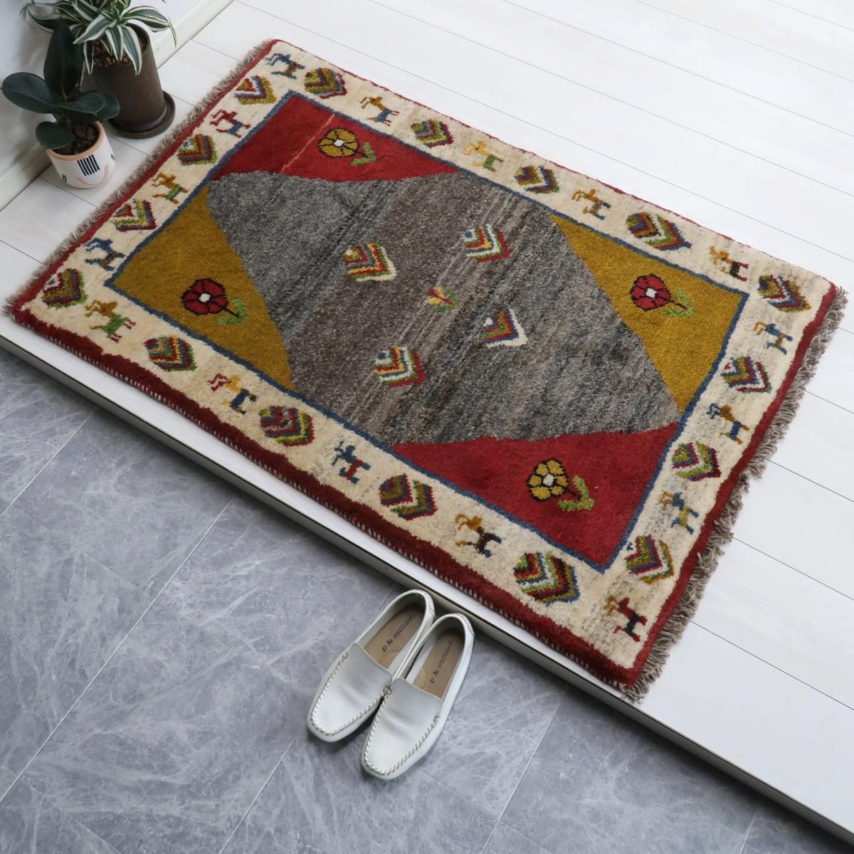 自然で温かみのある茶色のギャッベです。生命の木が幾何学的なモチーフを形成し、様々な色が織り交ぜられています。特に、赤、青、黄色の色彩が生成りの背景に対して鮮やかに描かれており、洗練された美しさを感じさせます。各色が繊細に配され、このギャッベの独特の魅力を引き立てています。