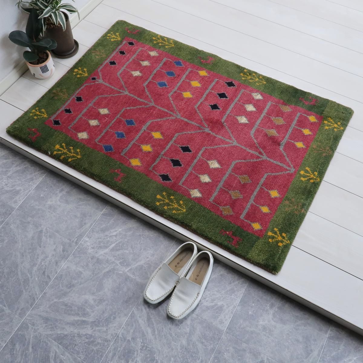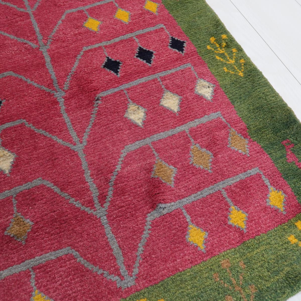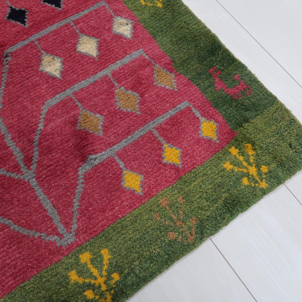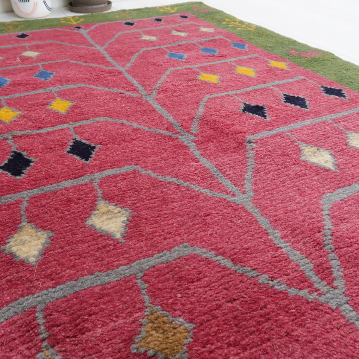 優しい赤と緑の背景が特徴的で、その上に黄色や青などの幾何学的モチーフが織り込まれています。各モチーフはシンプルながらも鮮明に表現されており、どの空間にも明るさと楽しい雰囲気をもたらします。
