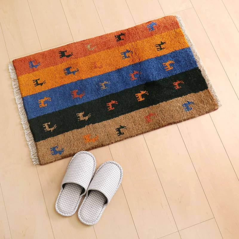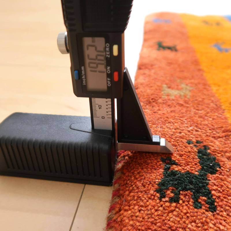 開封すぐの撮影でシワが見える写真があります。照明の違いで色合いが多少違って見えます。また、ギャッベは毛足に向きがあるので、見る方向で、明るかったり暗かったりも見えます。