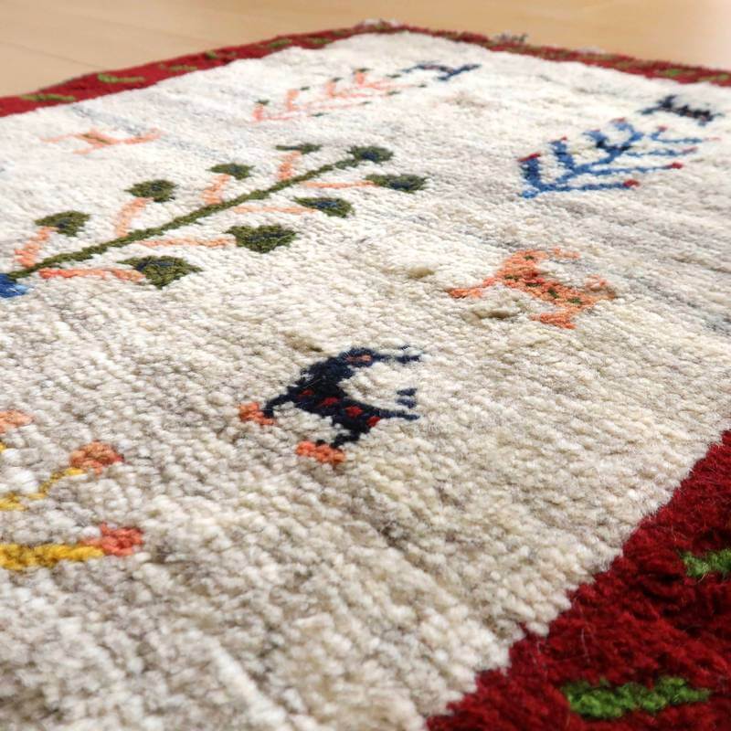 生成りやグレーベージュなどの無染色の羊色をベースに、柔らかな色合いで生命の木と動物たちが織り込まれた可愛らしいデザイン。黄緑色の模様が入った赤色の外枠がアクセントとなっています。