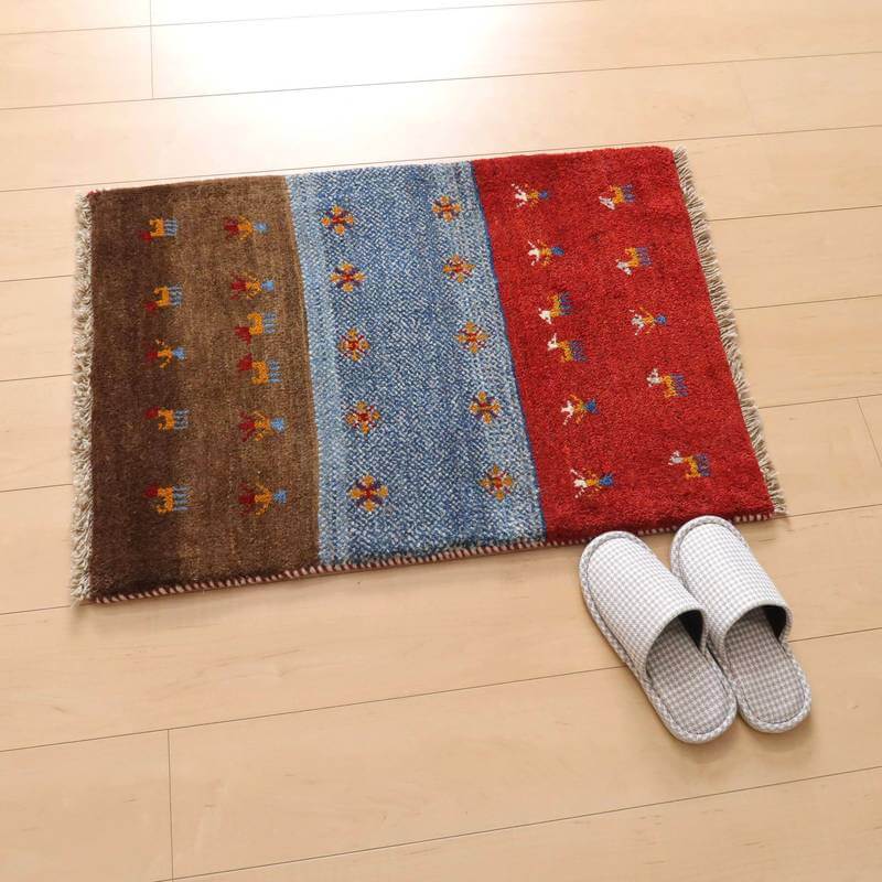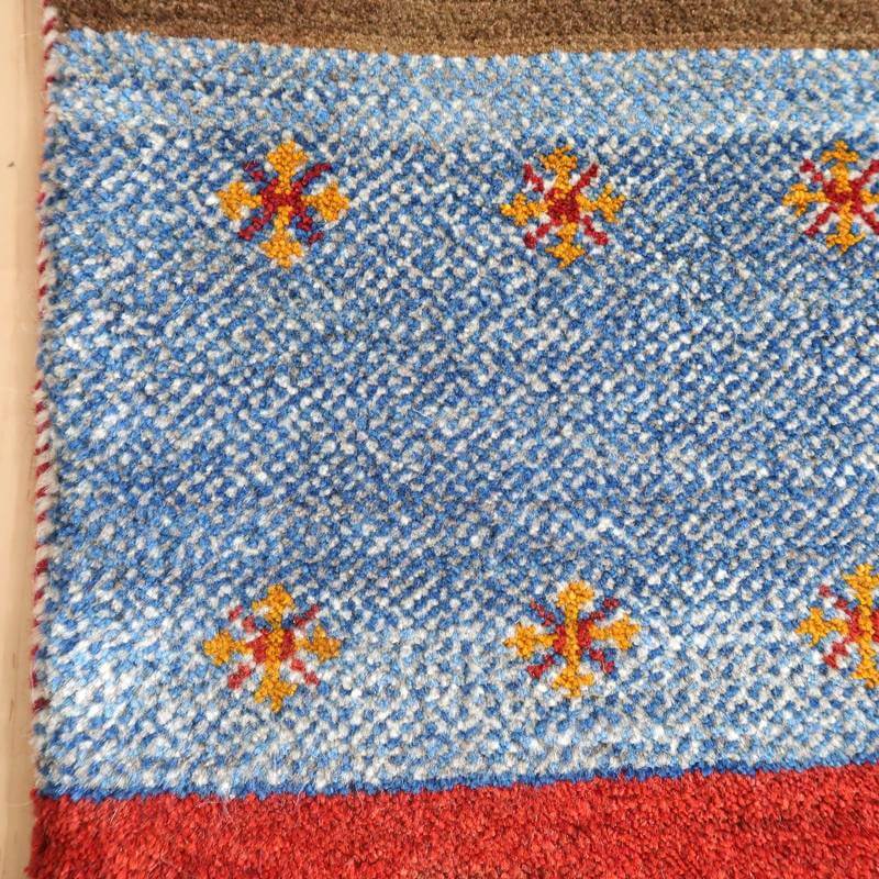 開封すぐの撮影でシワが見える写真があります。照明の違いで色合いが多少違って見えます。また、ギャッベは毛足に向きがあるので、見る方向で、明るかったり暗かったりも見えます。