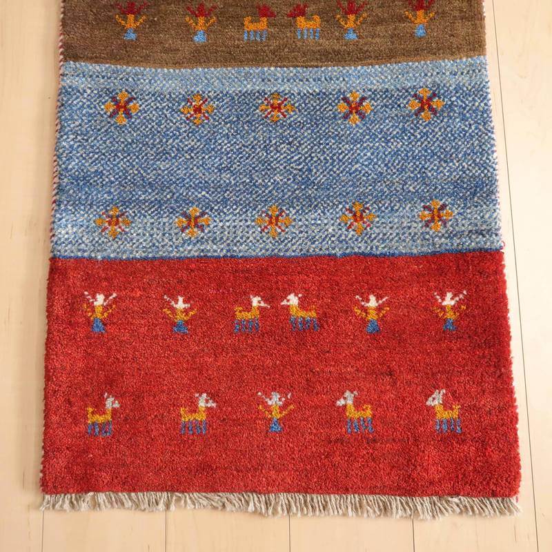 エンジ、こげ茶と、ブルーやグレーなどのドット柄の落ち着いた色づかいボーダーに動物や生命の木などのモチーフが並んで可愛らしい雰囲気。むっくりと厚手で、目の詰まった毛足です。