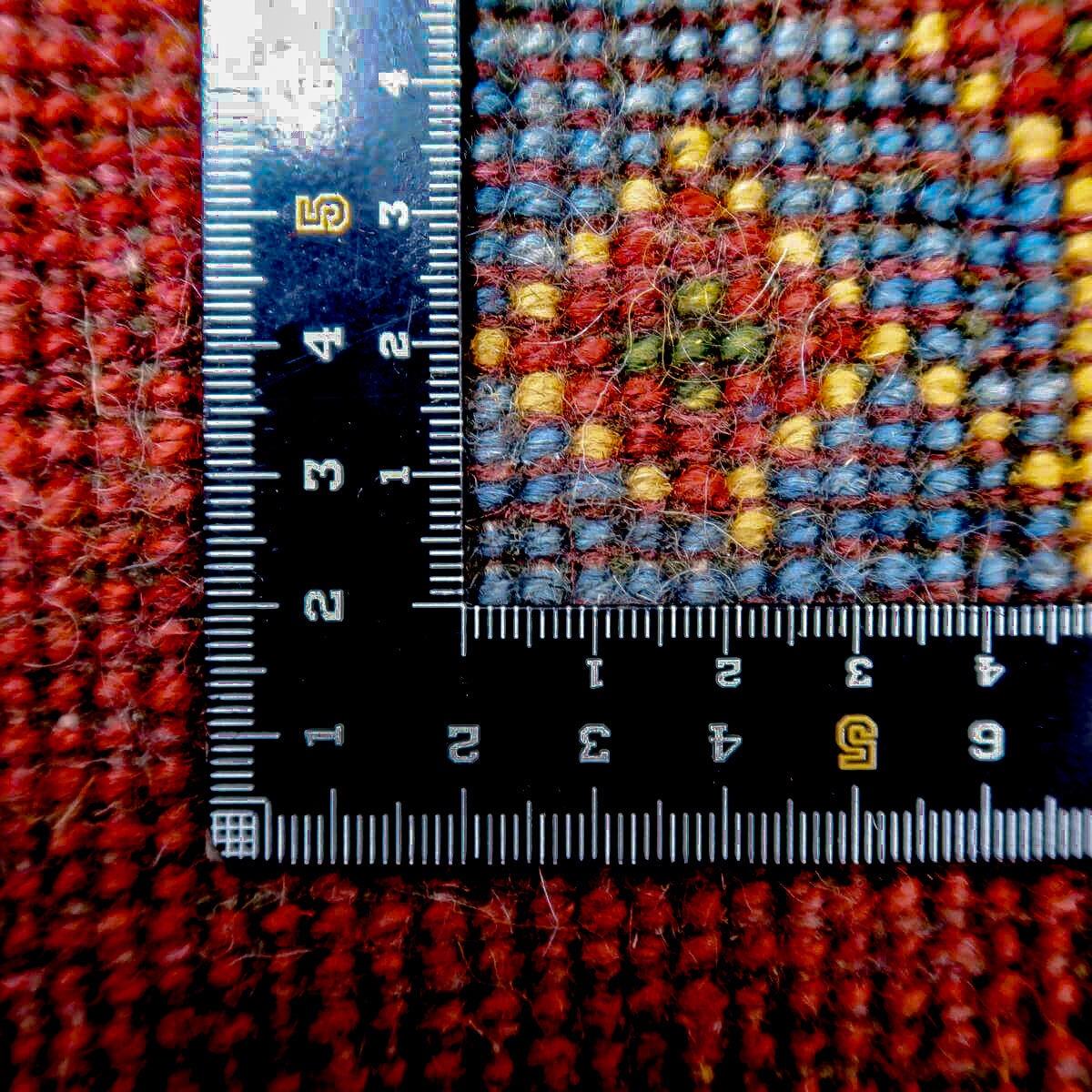 赤を基調としたデザインで、その深い色合いが温かみを感じさせます。四角の模様には、青や黄色、橙などの色彩がバランスよく描かれており、それぞれに動物や植物のモチーフが配置されています。色鮮やかな模様が全体にリズムと調和をもたらしています。