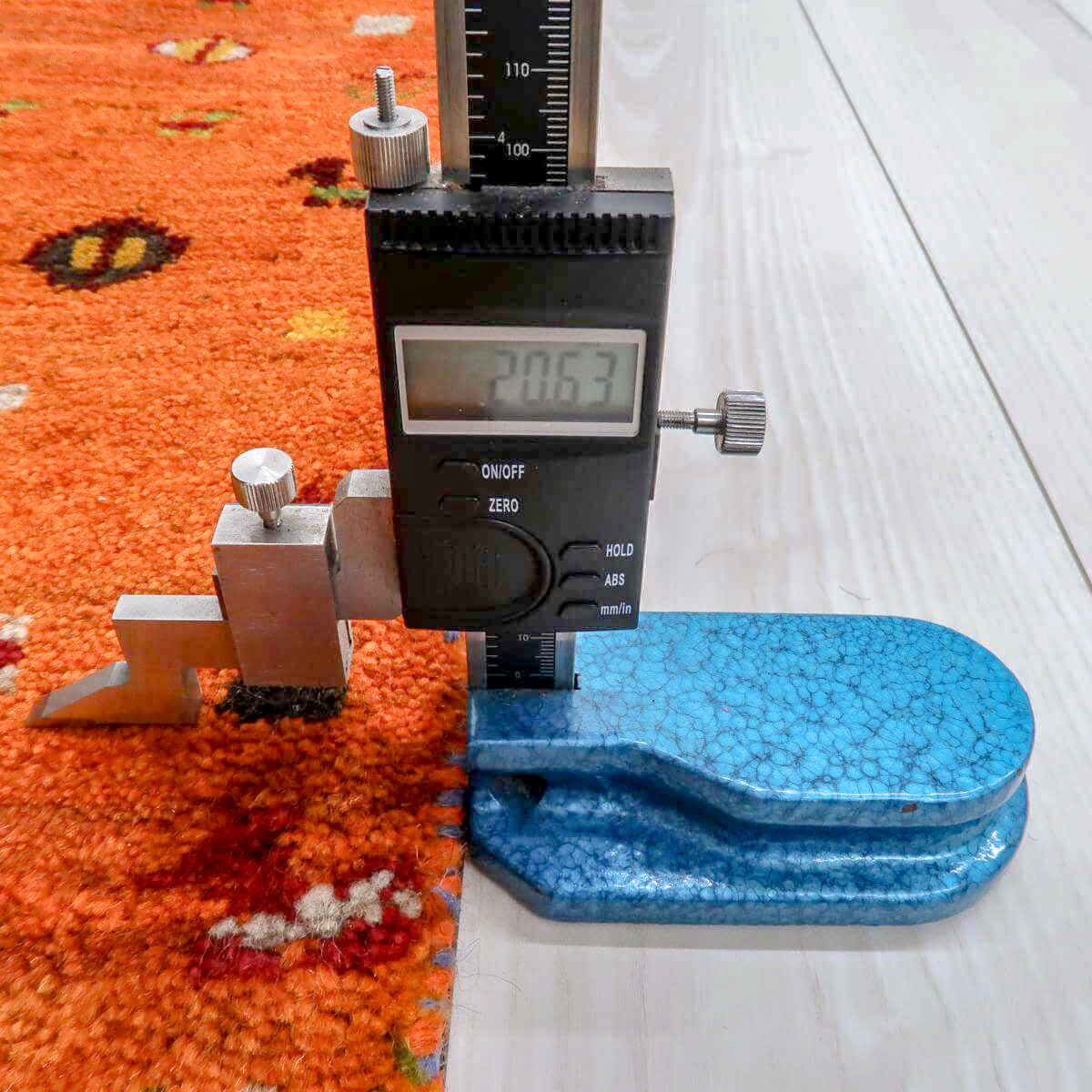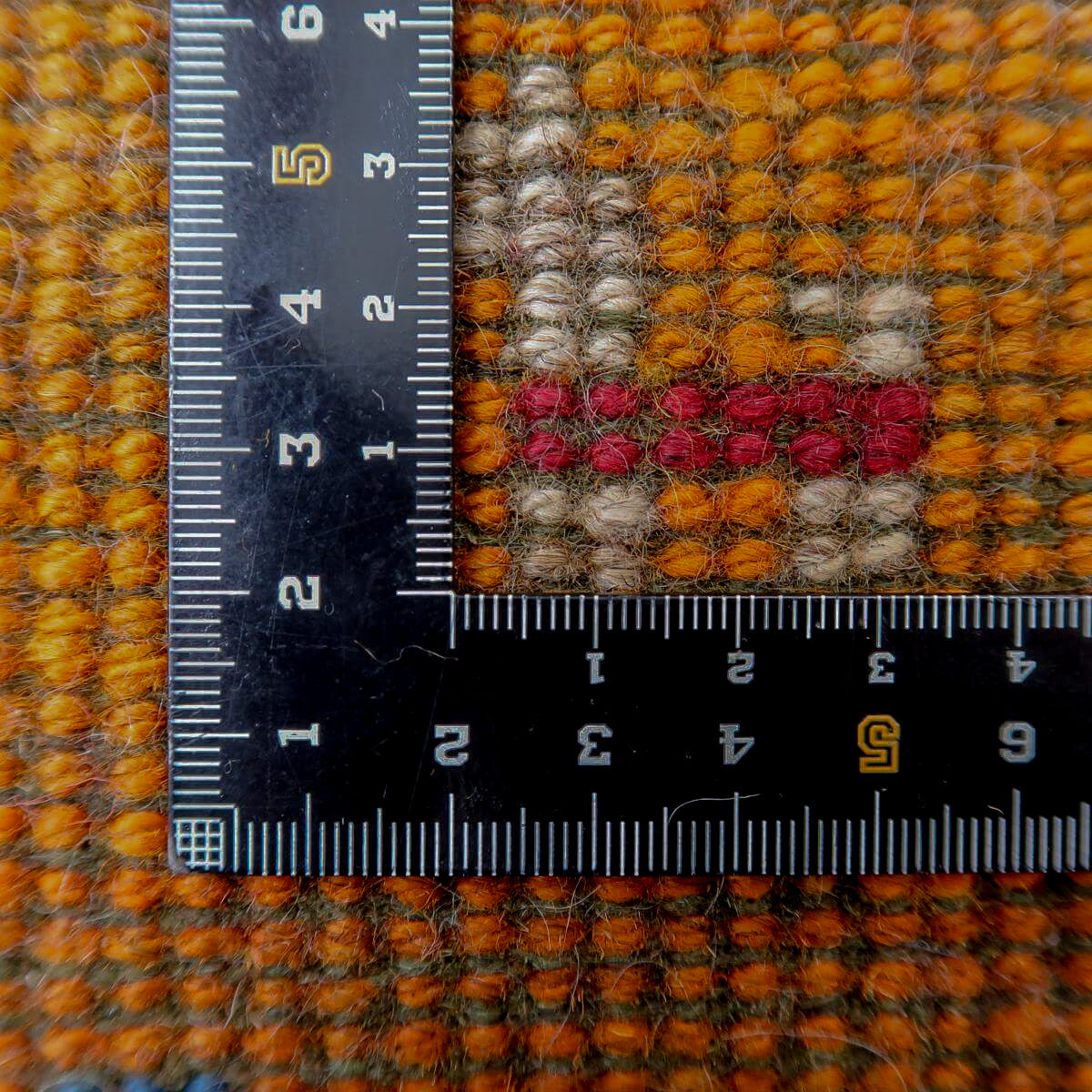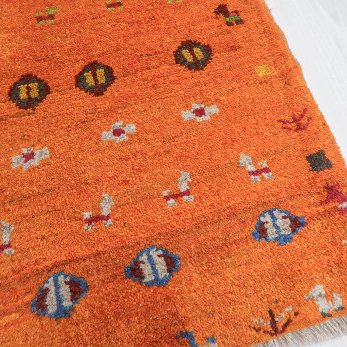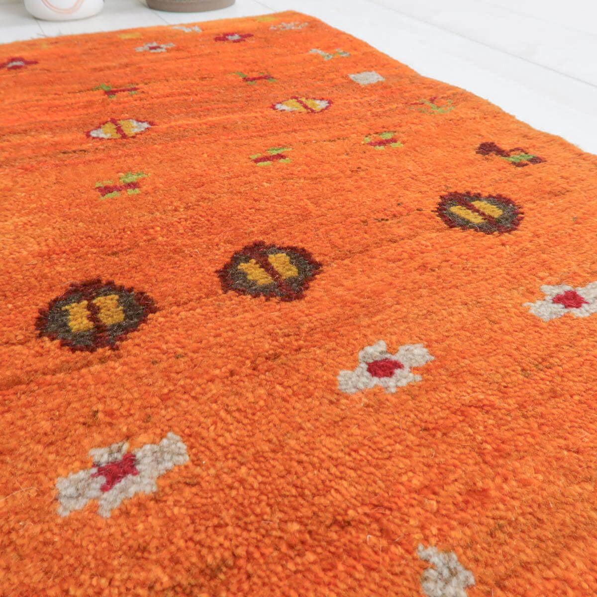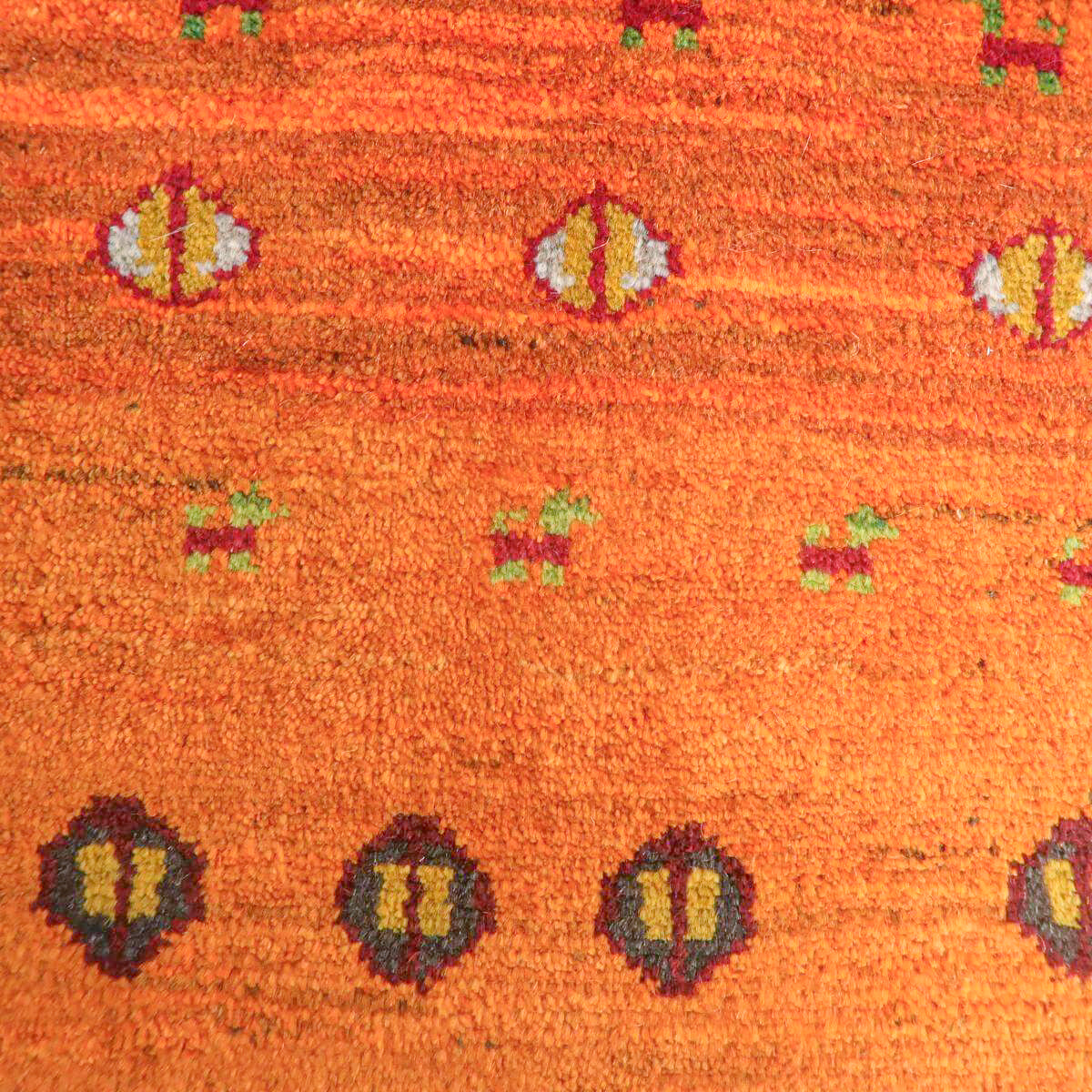 橙色を基調としたデザインに、黄色、青、赤、生成りなどの様々な動物や幾何学模様が描かれています。伝統的なデザインと個性的な色使いの、独特の魅力を持った一品です。
