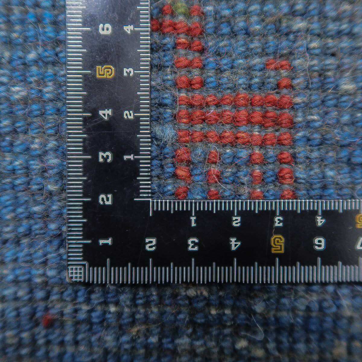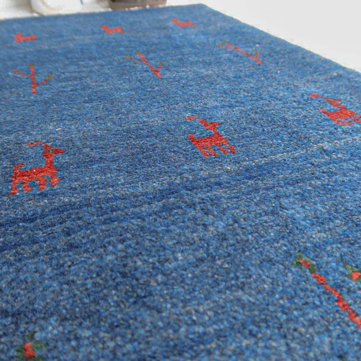 青を基調としたデザインに、赤い動物と植物のモチーフが描かれています。規則的に配置されたモチーフで、シンプルながらも豊かな表情。青の深い色合いが落ち着きを与え、赤いモチーフが鮮やかなアクセントとなっています。お部屋に静かな美しさと温かみをもたらします。