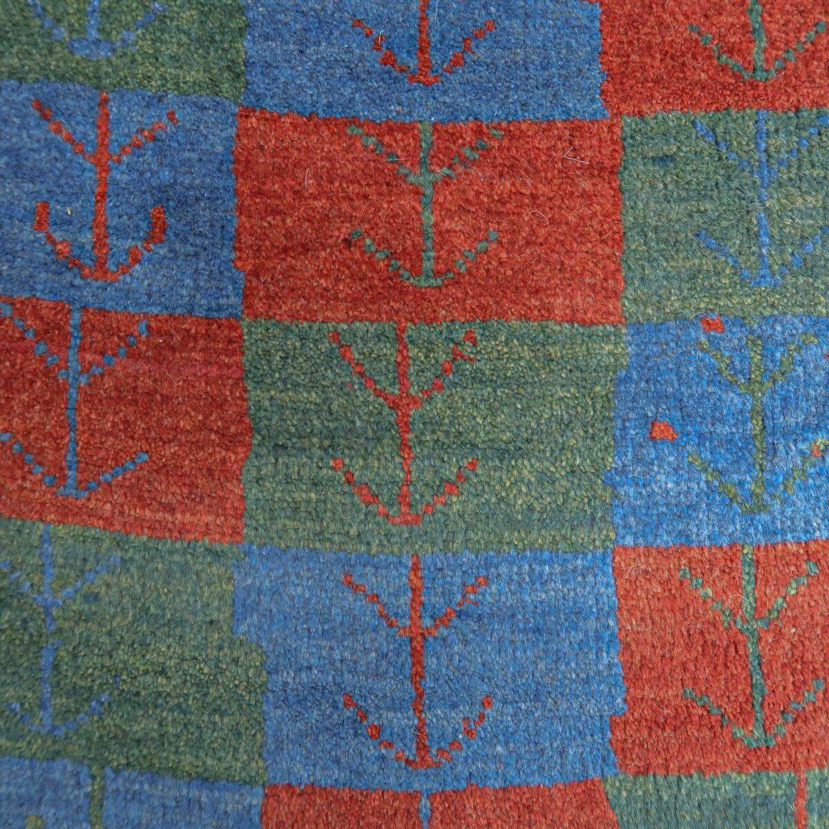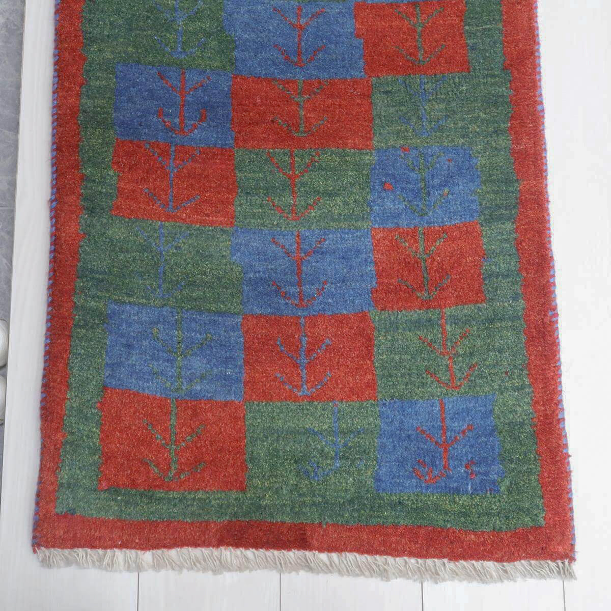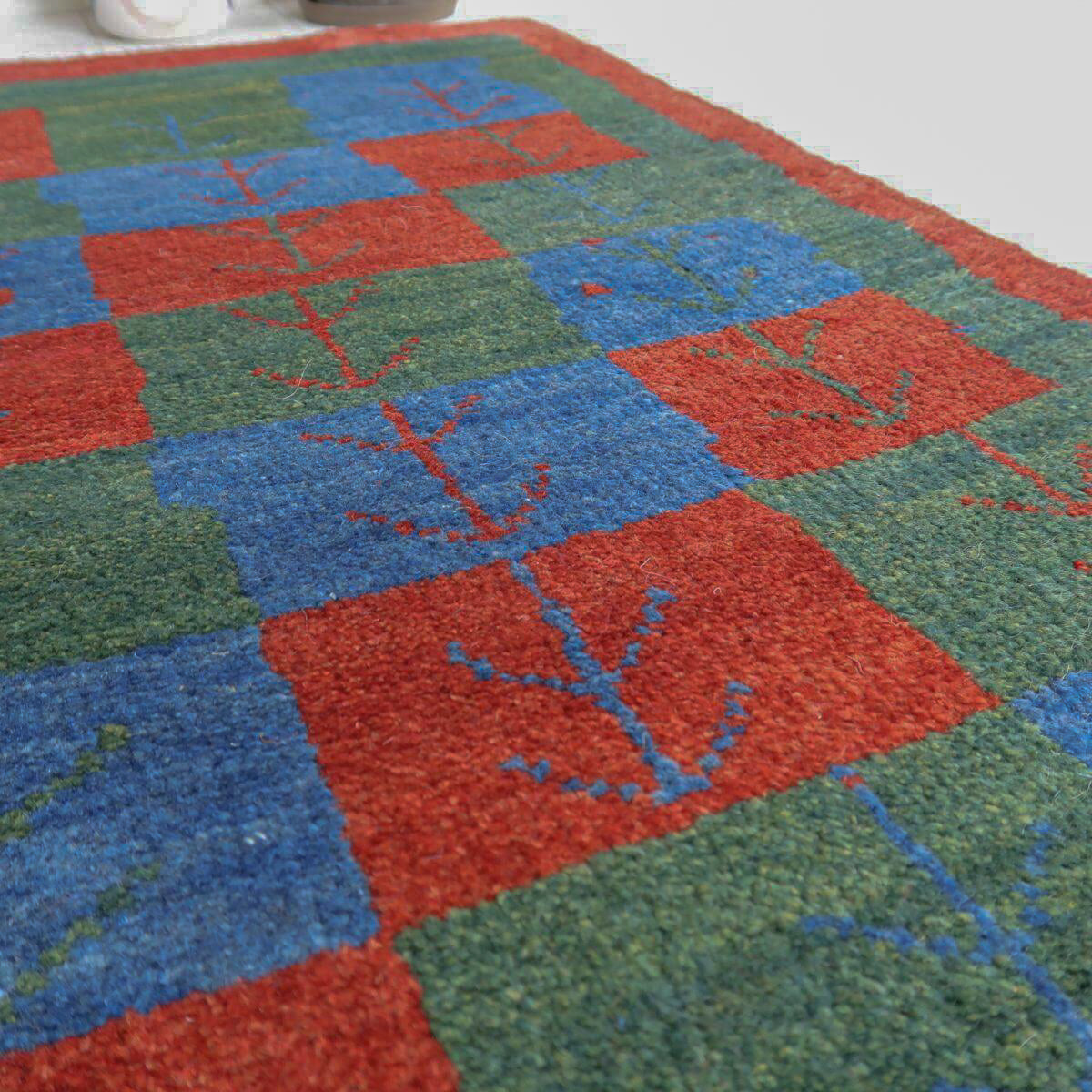 青、赤、緑の四角の模様が交互に配置されており、それぞれに赤や青のモチーフが描かれています。四角の模様が規則正しく並び、魅力的なパターンを形成しています。赤の縁取りが全体を引き締め、色彩のバランスがとれたデザインとなっています。お部屋に鮮やかさと温かみをもたらす一品です。