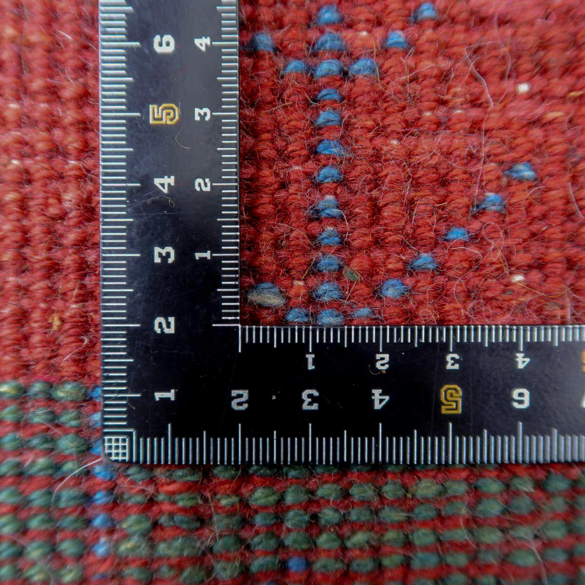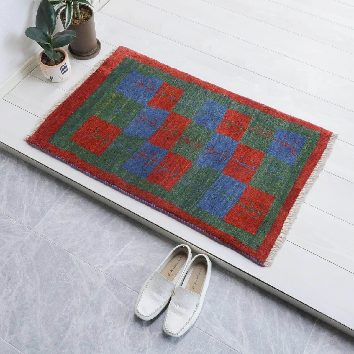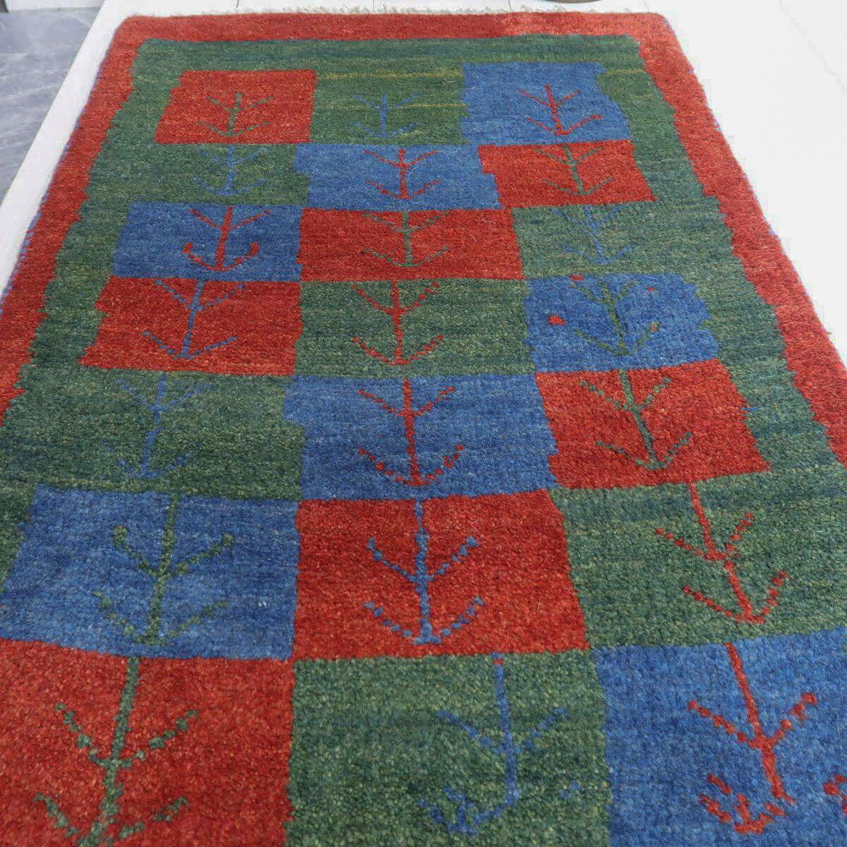 青、赤、緑の四角の模様が交互に配置されており、それぞれに赤や青のモチーフが描かれています。四角の模様が規則正しく並び、魅力的なパターンを形成しています。赤の縁取りが全体を引き締め、色彩のバランスがとれたデザインとなっています。お部屋に鮮やかさと温かみをもたらす一品です。