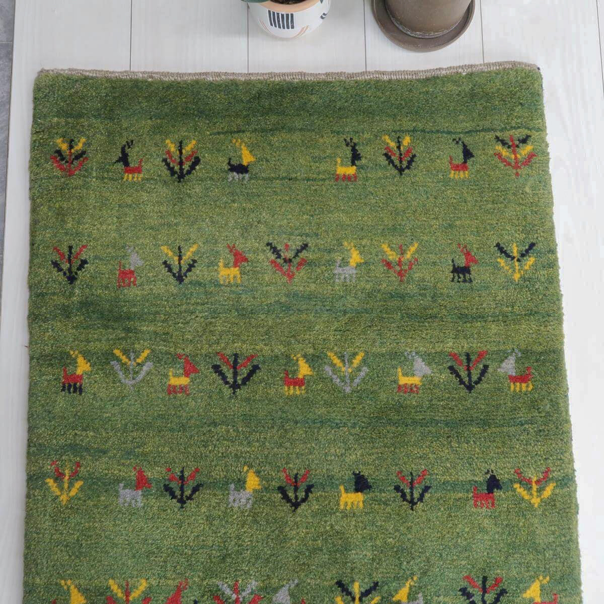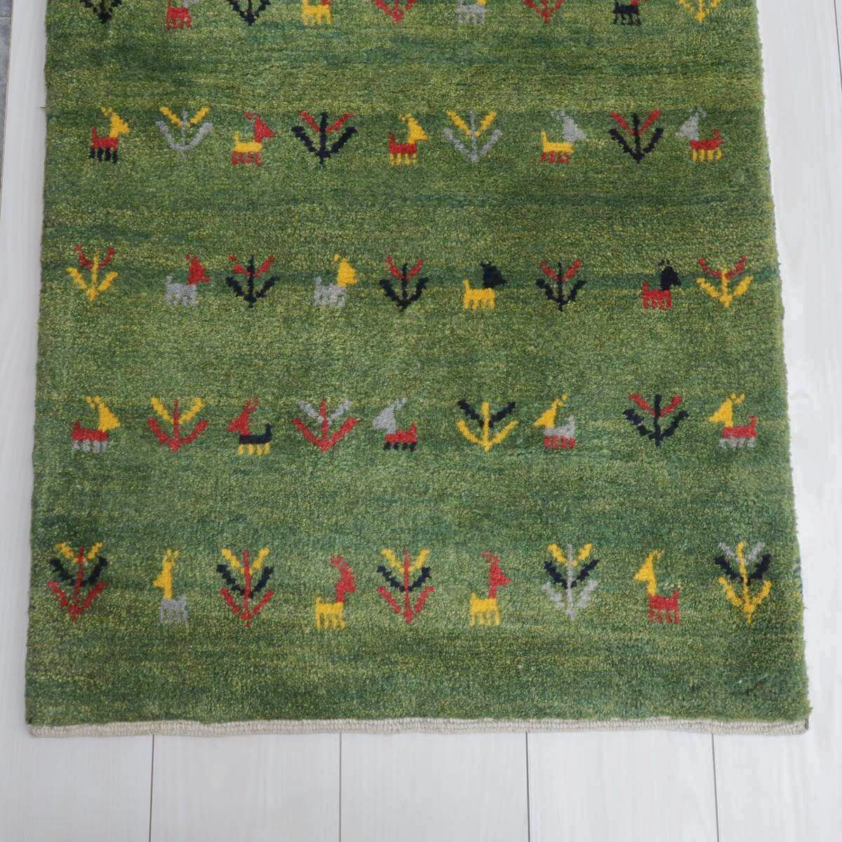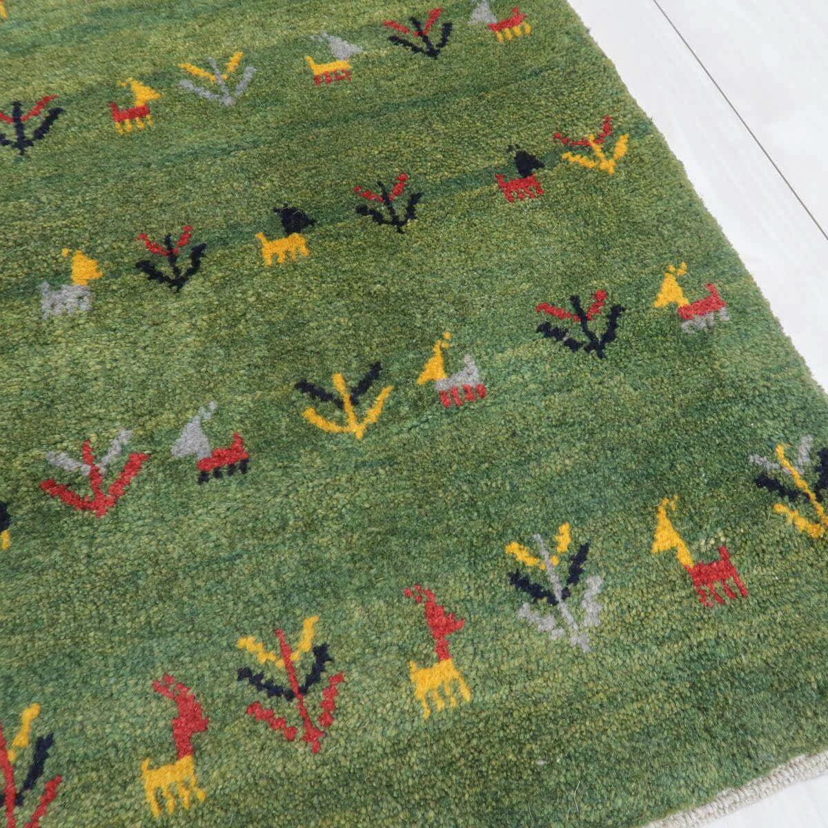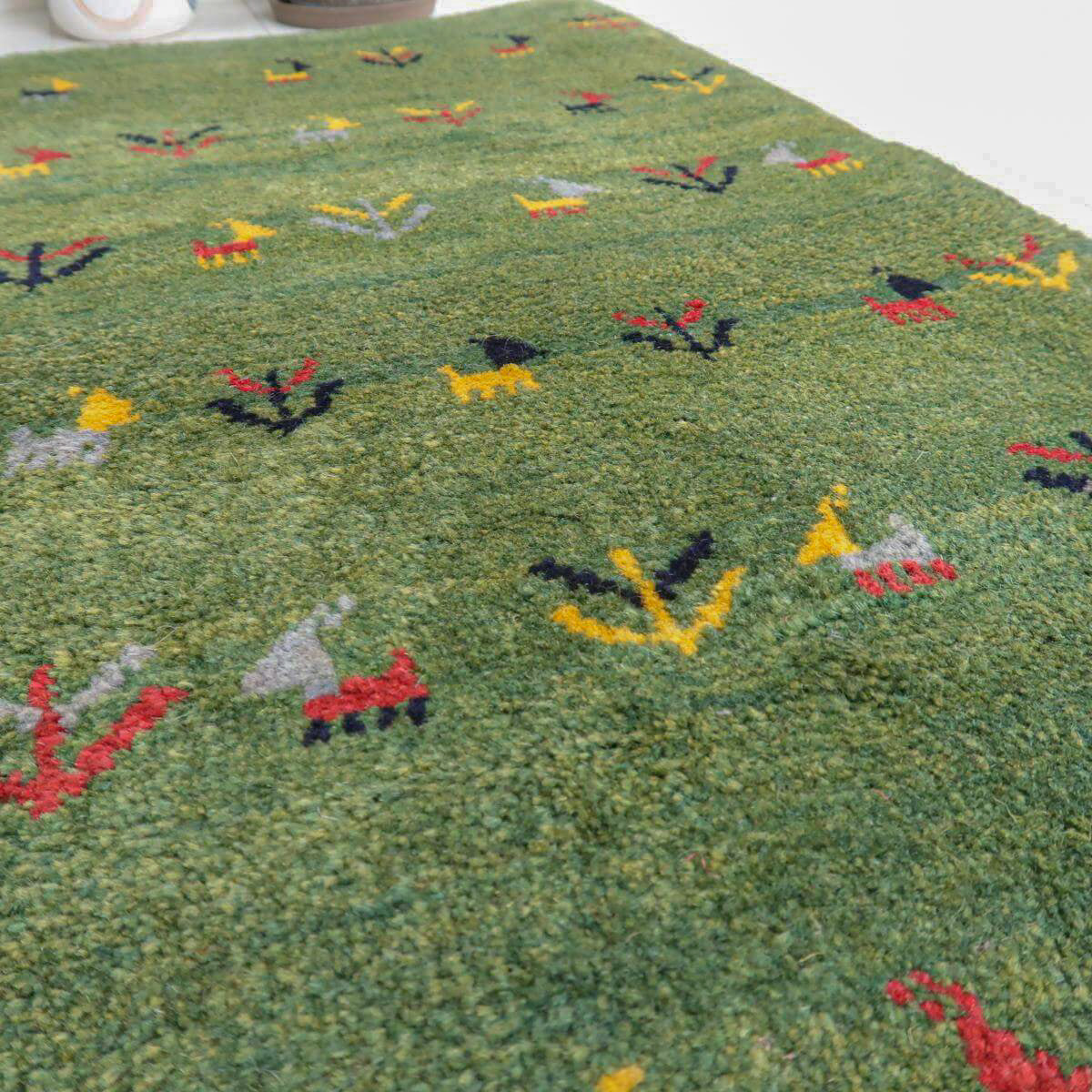 緑を基調とした背景に赤や黄色、グレーの動物や植物のモチーフがバランスよく配置された、表情豊かなギャッベ。緑の深い色合いが落ち着きを与え、鮮やかな色のモチーフが魅力的なアクセントとなっています。