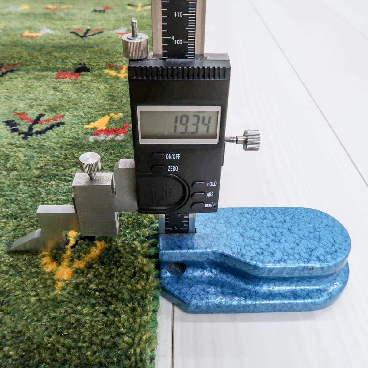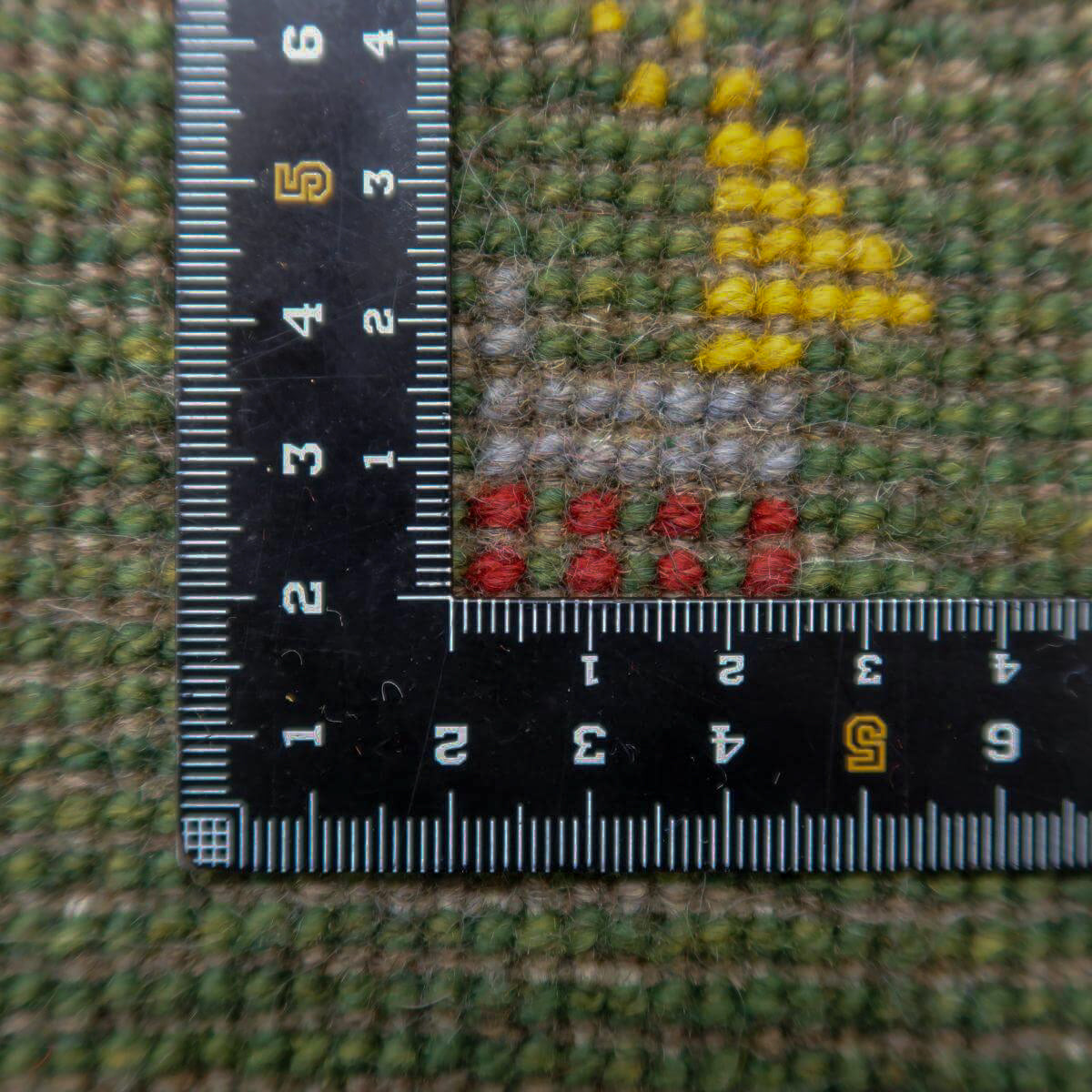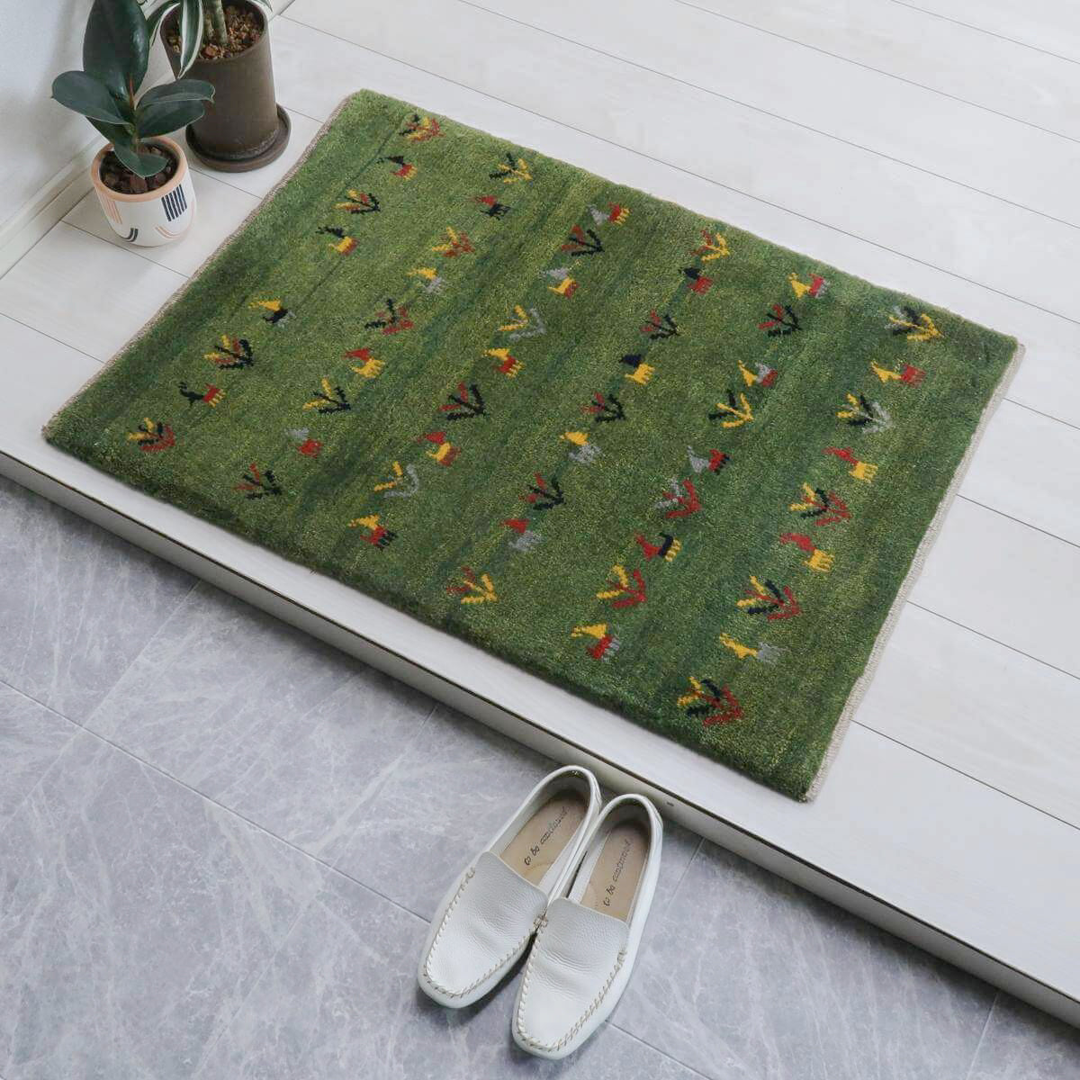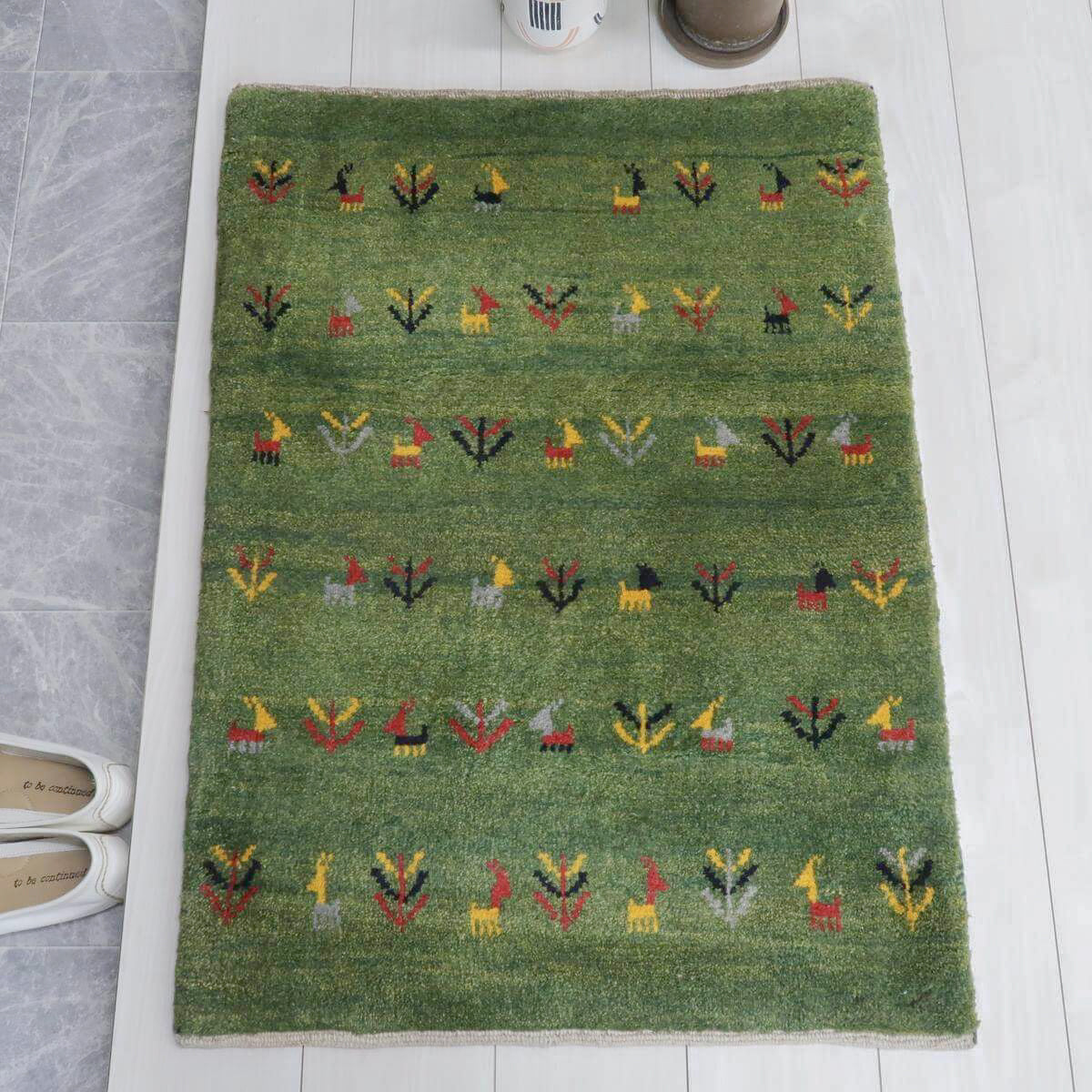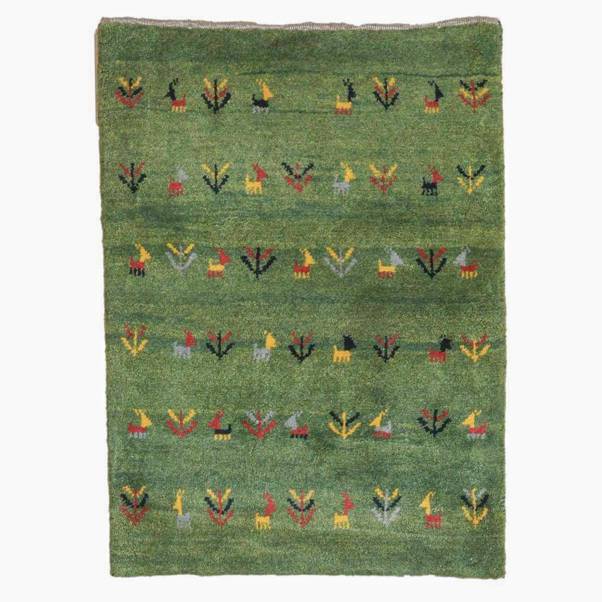 緑を基調とした背景に赤や黄色、グレーの動物や植物のモチーフがバランスよく配置された、表情豊かなギャッベ。緑の深い色合いが落ち着きを与え、鮮やかな色のモチーフが魅力的なアクセントとなっています。