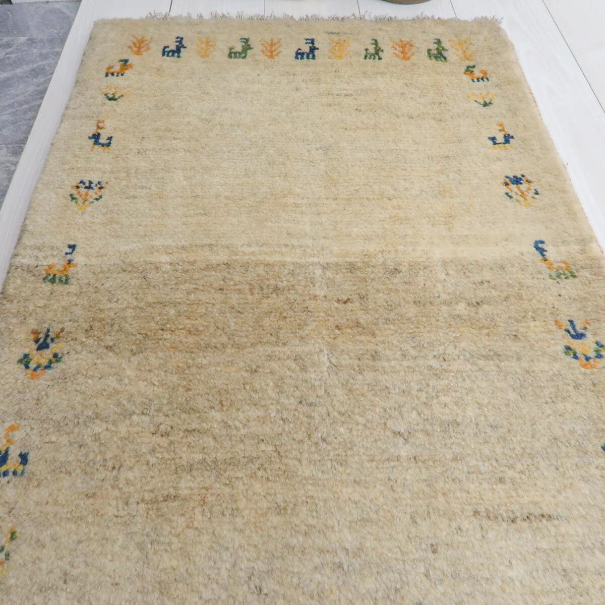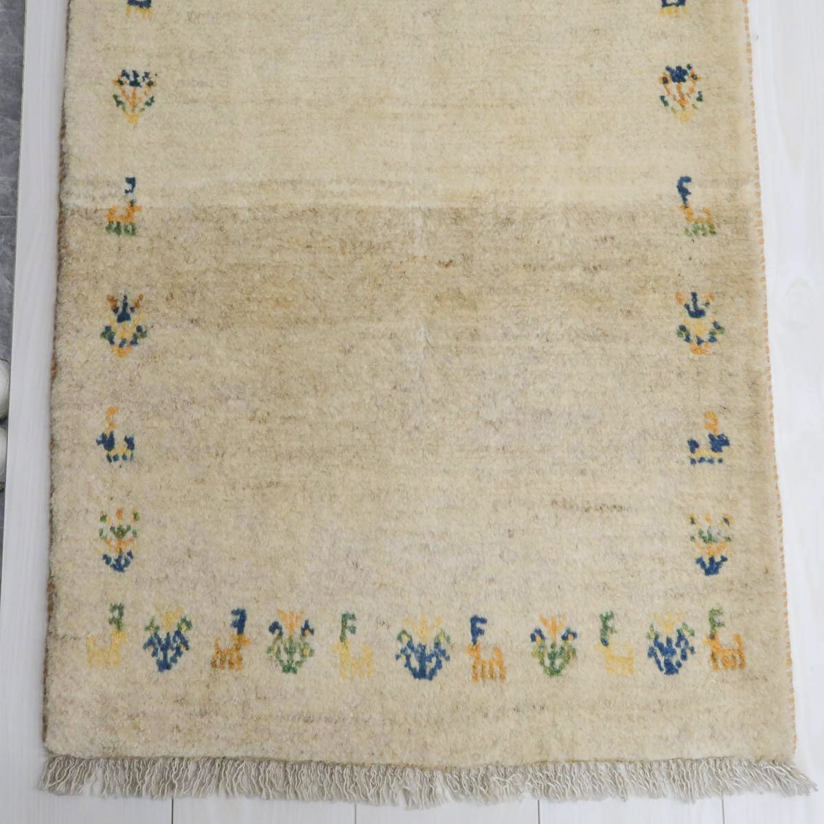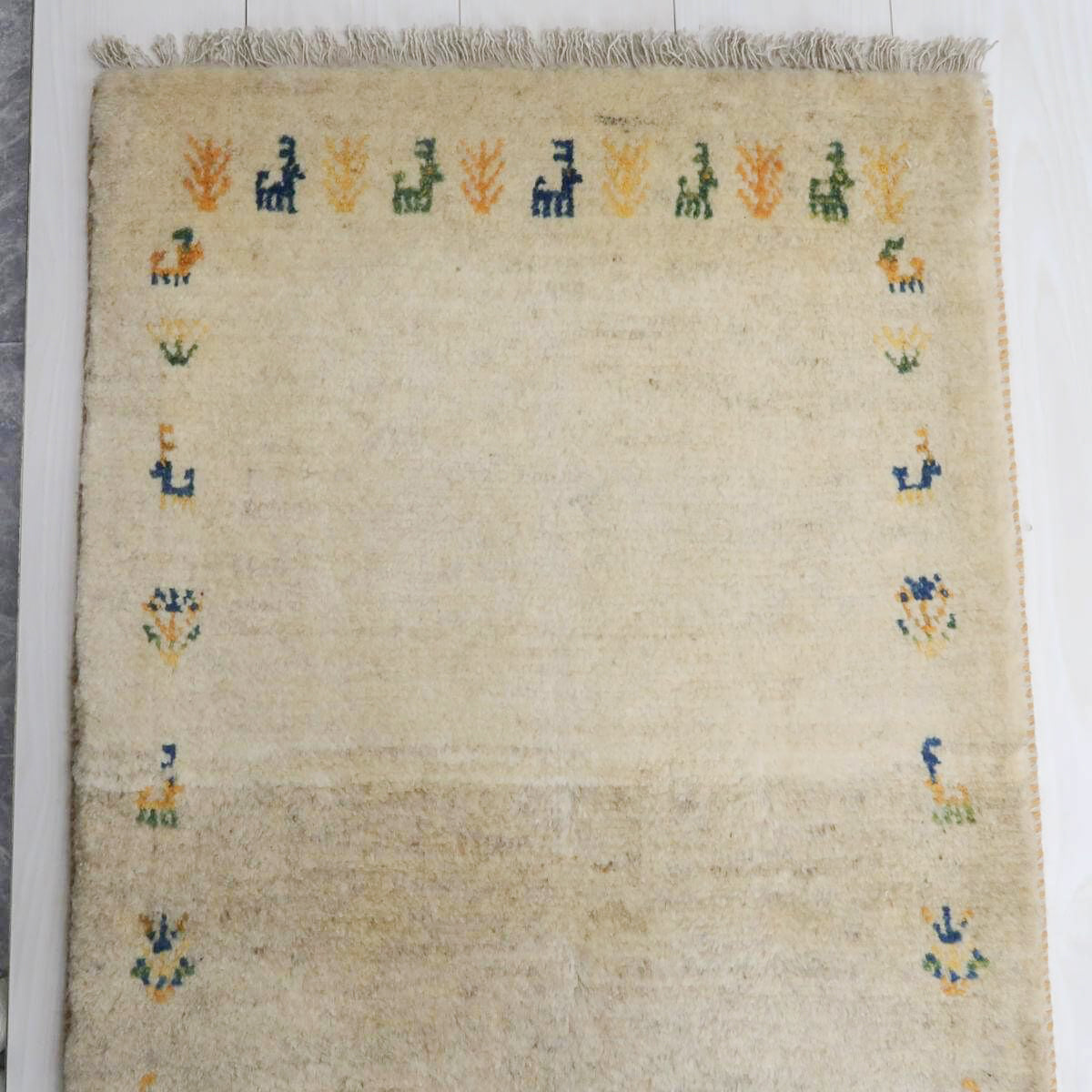 生成りを基調とした背景に、青や橙、黄色の動植物のモチーフが規則的に配置されており、全体にバランスの取れたデザインとなっています。生成りの柔らかな色合いが落ち着きを与え、鮮やかな色のモチーフがアクセントとして映えています。お部屋に温かみと独特の魅力をもたらしてくれる一品です。