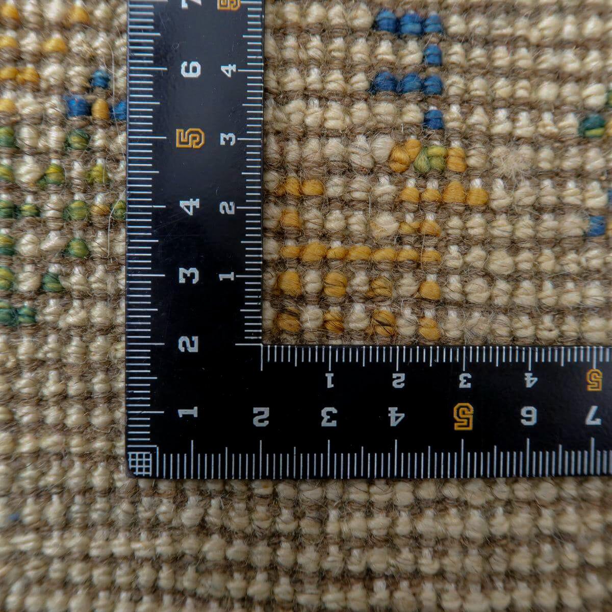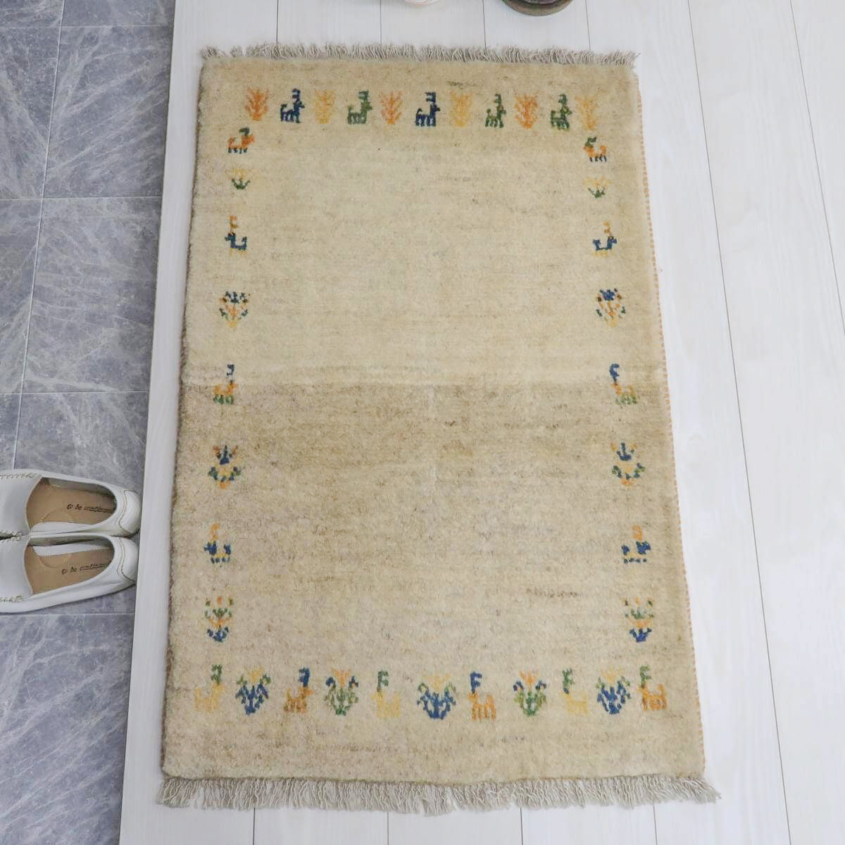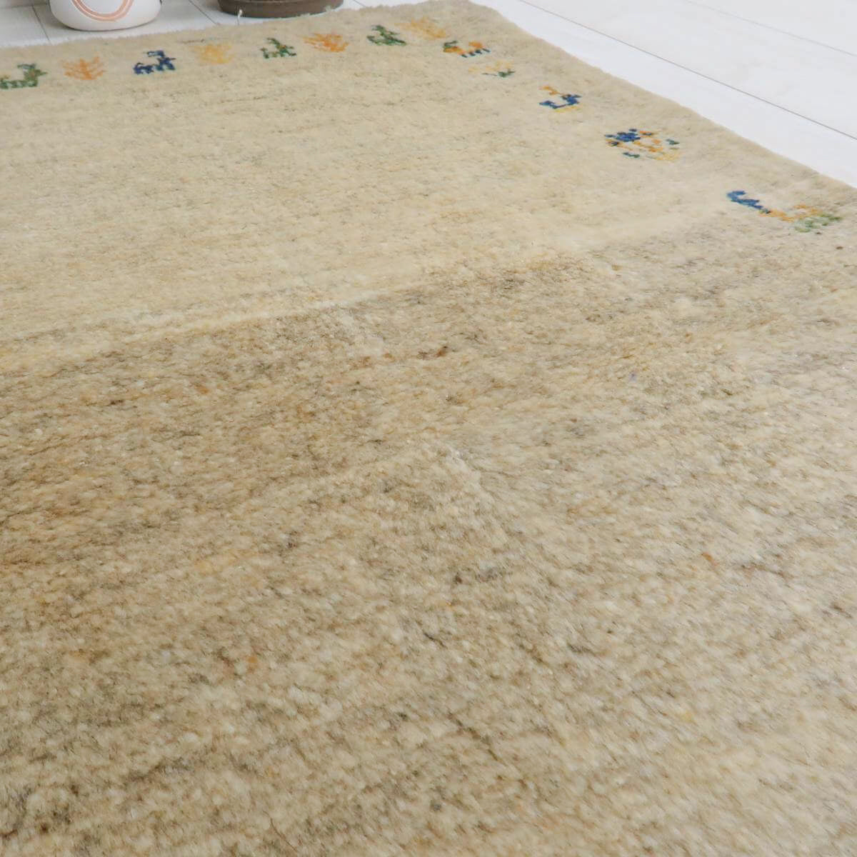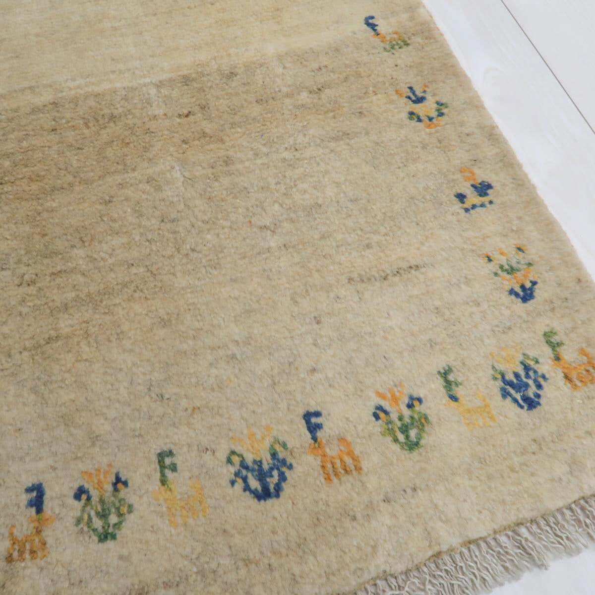 生成りを基調とした背景に、青や橙、黄色の動植物のモチーフが規則的に配置されており、全体にバランスの取れたデザインとなっています。生成りの柔らかな色合いが落ち着きを与え、鮮やかな色のモチーフがアクセントとして映えています。お部屋に温かみと独特の魅力をもたらしてくれる一品です。