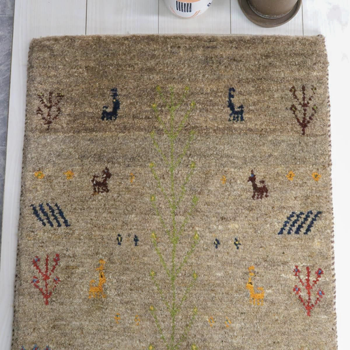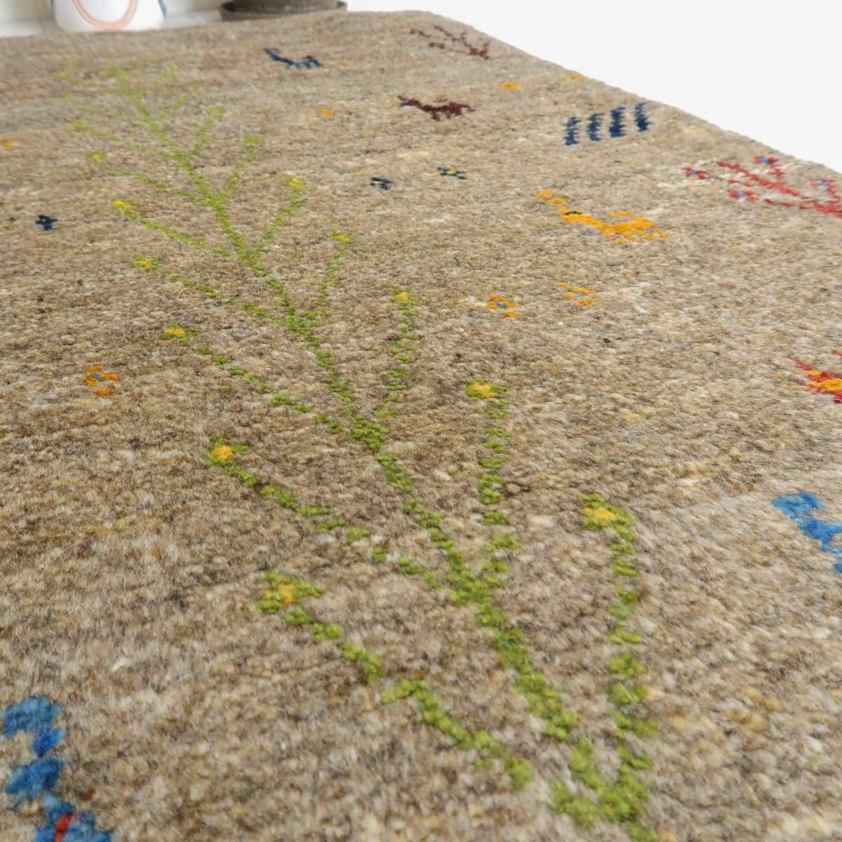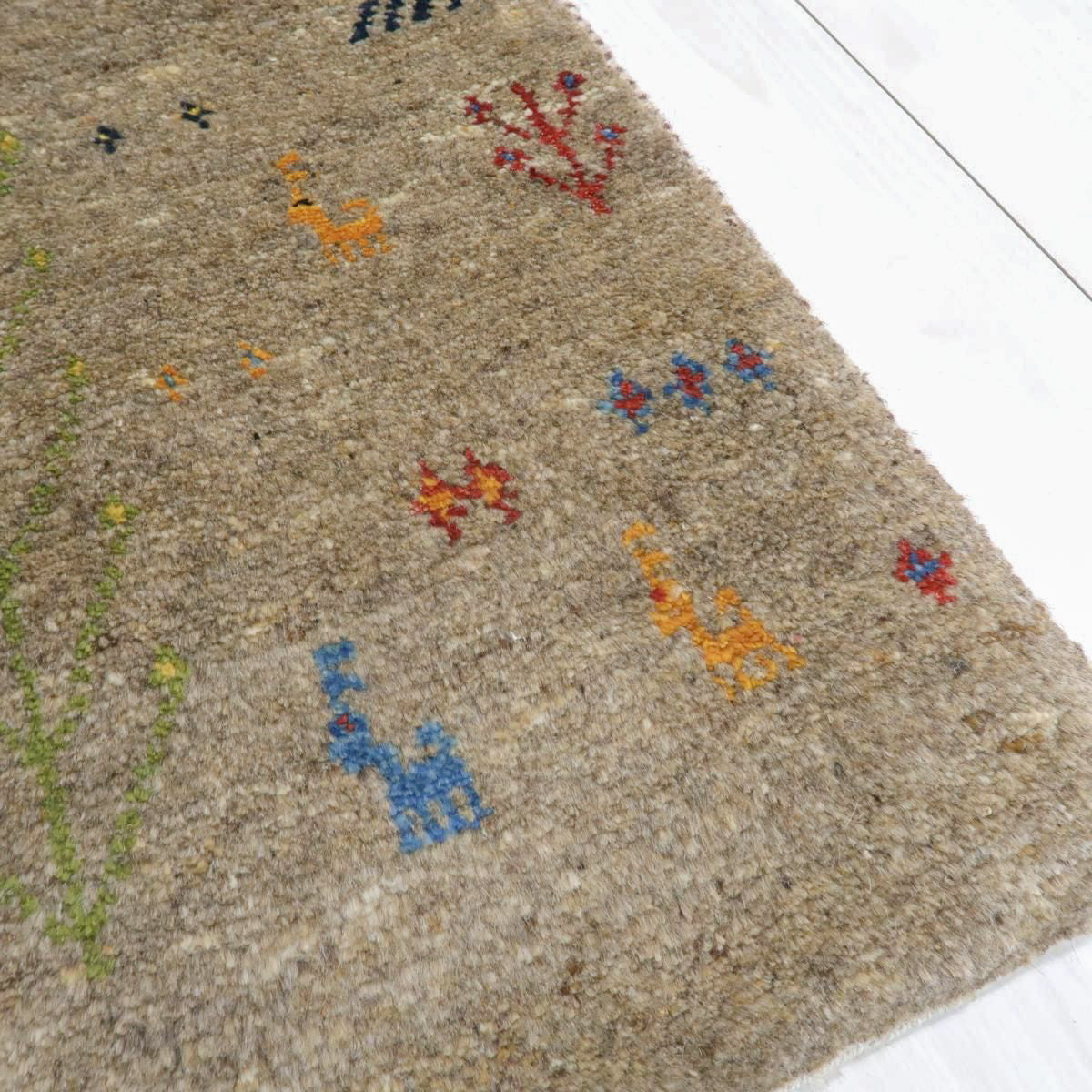 落ち着いたベースカラーに、カラフルな動植物などのモチーフがアクセントとなっています。シンプルかつ可愛らしいギャッベです。