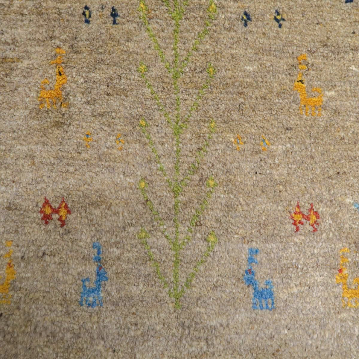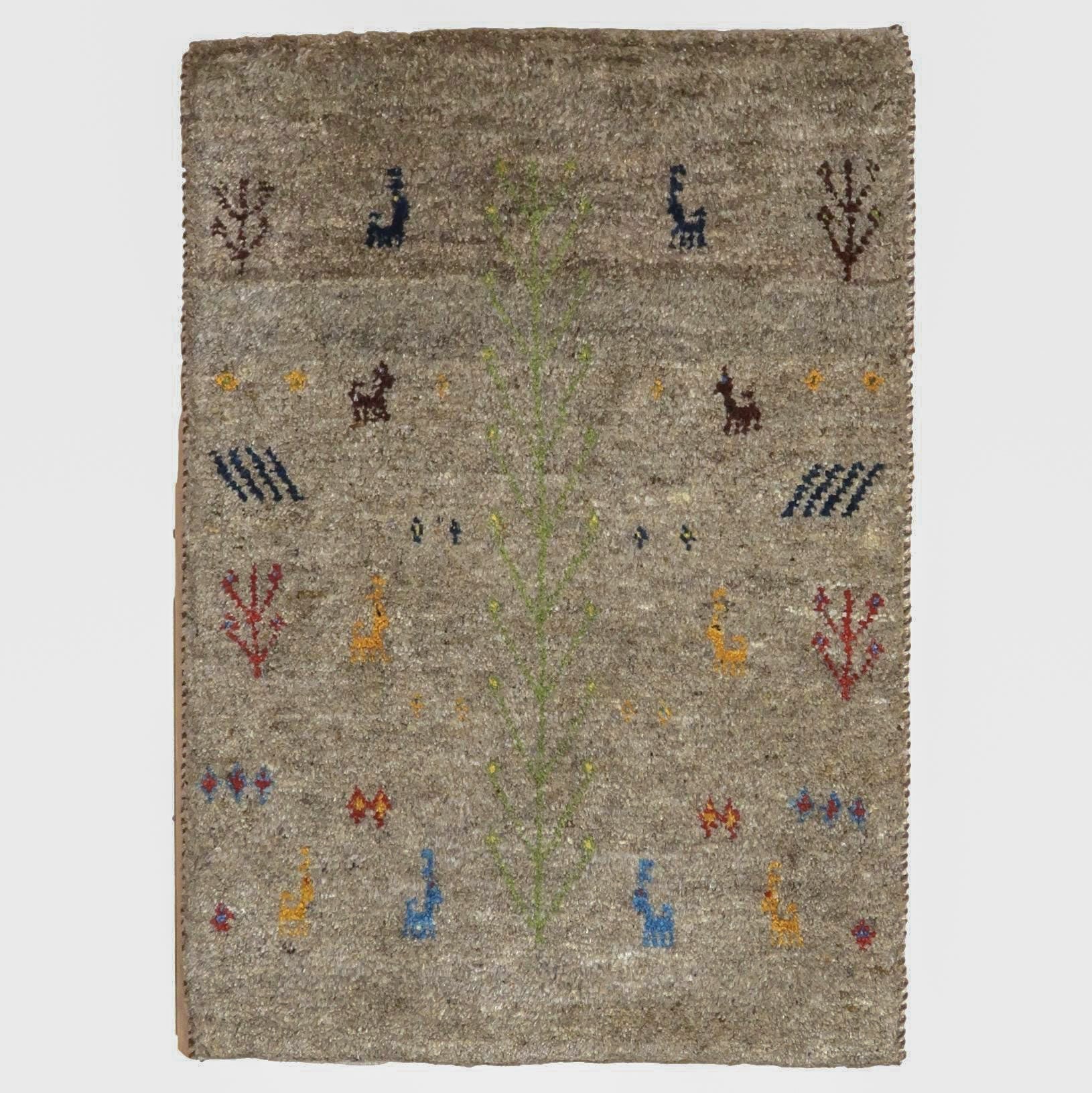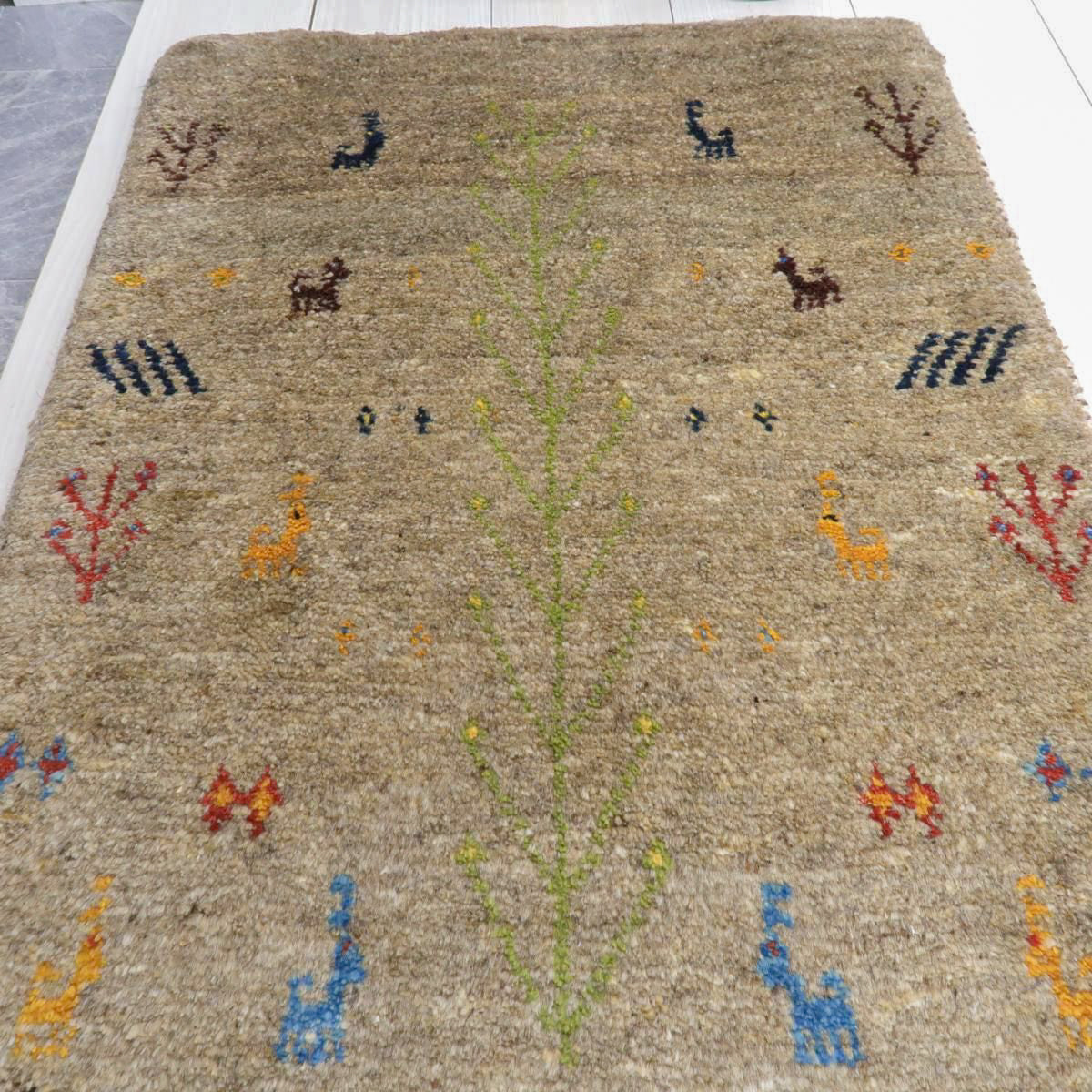落ち着いたベースカラーに、カラフルな動植物などのモチーフがアクセントとなっています。シンプルかつ可愛らしいギャッベです。