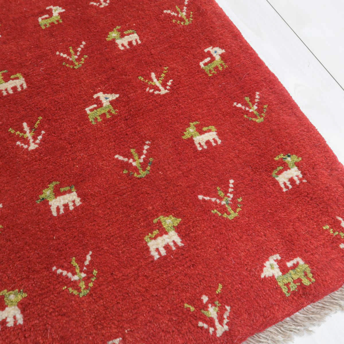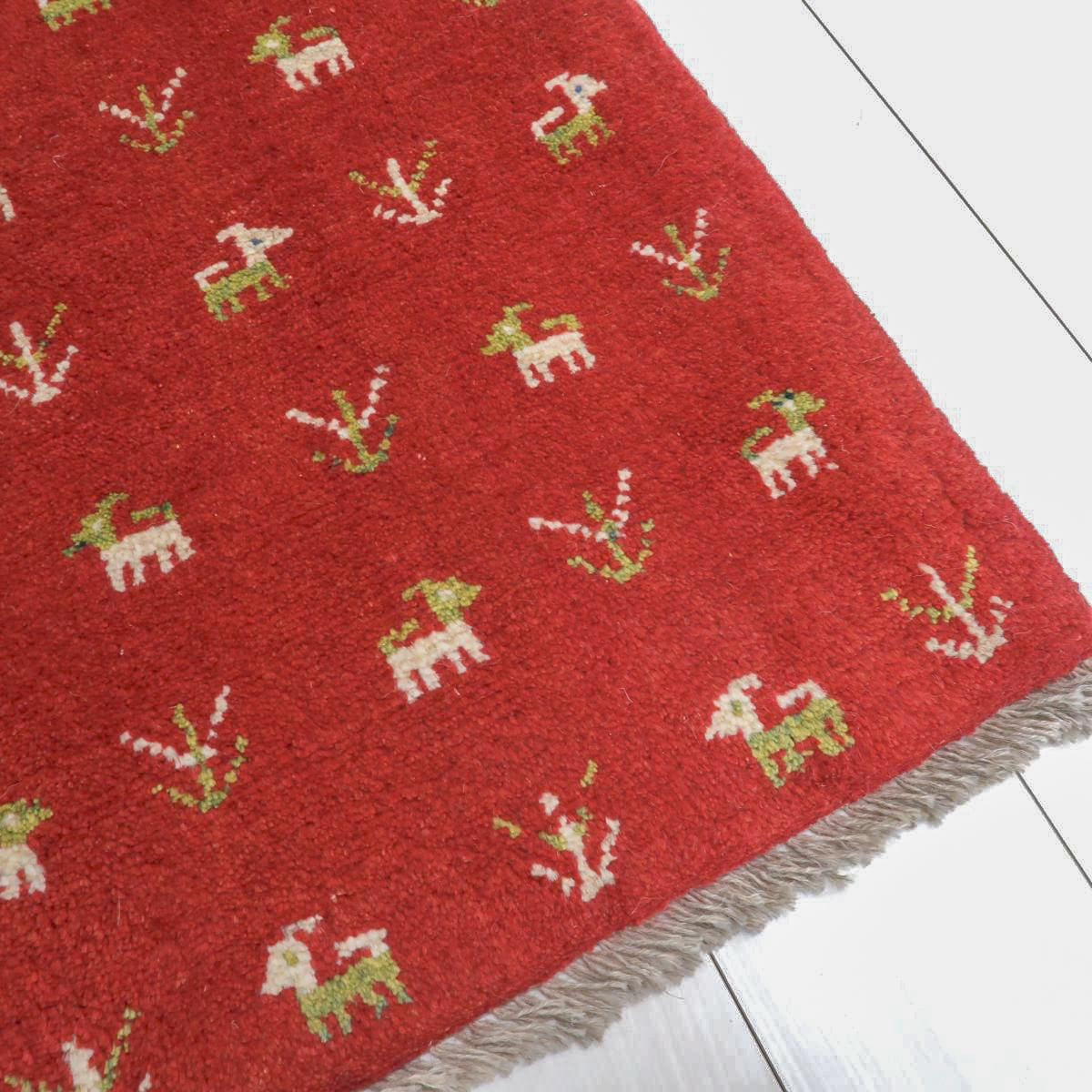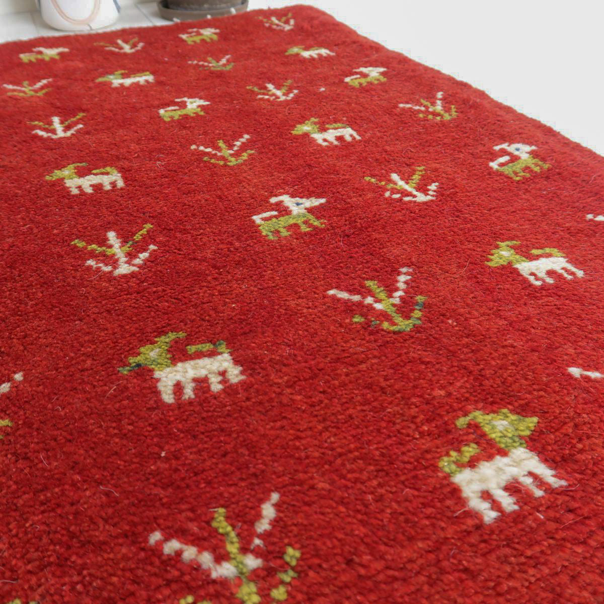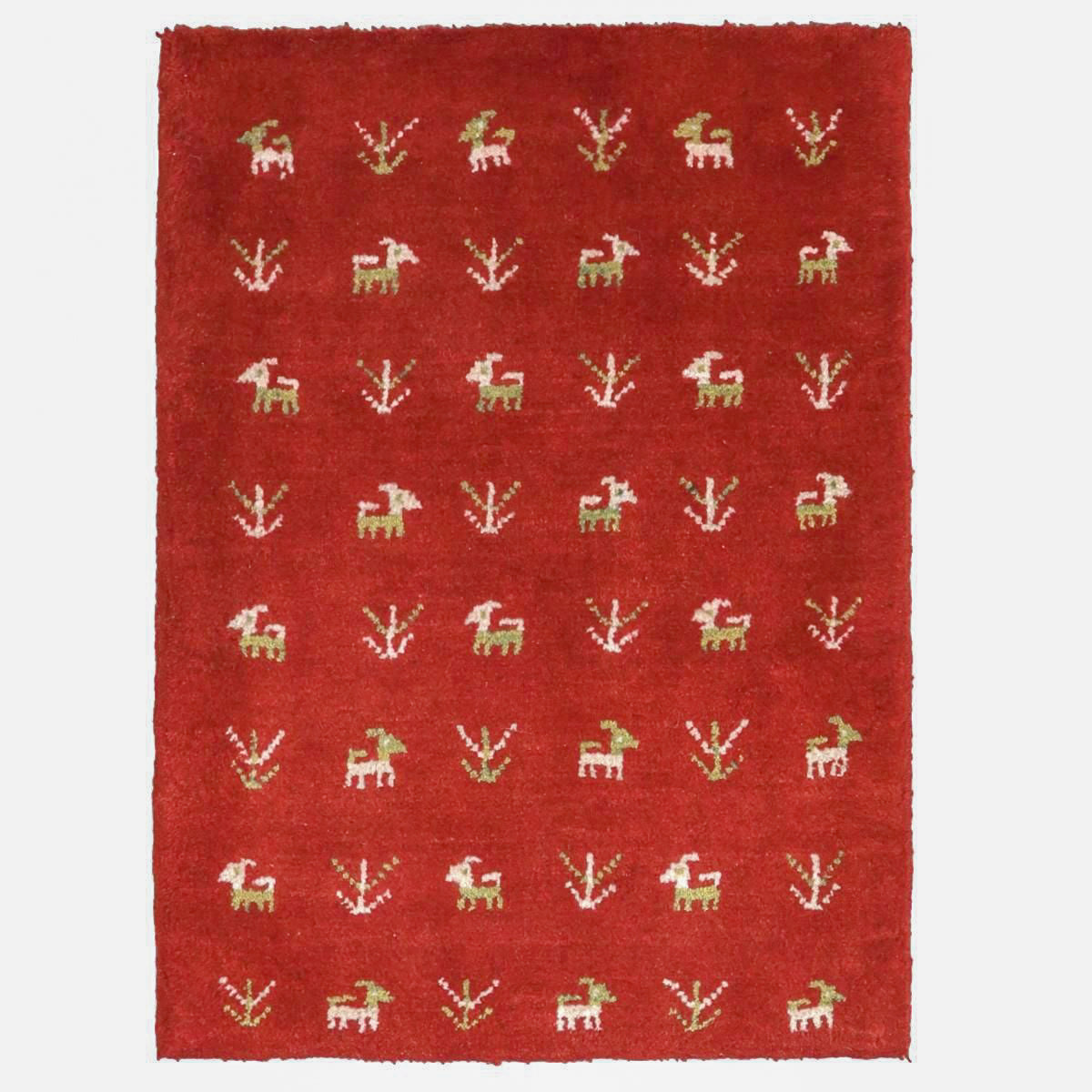 赤を特徴とした手織りの逸品です。ベースカラーの赤に、生成りと緑で可愛らしい動植物のモチーフが散りばめられています。温かみと生き生きとした雰囲気のギャッベです。