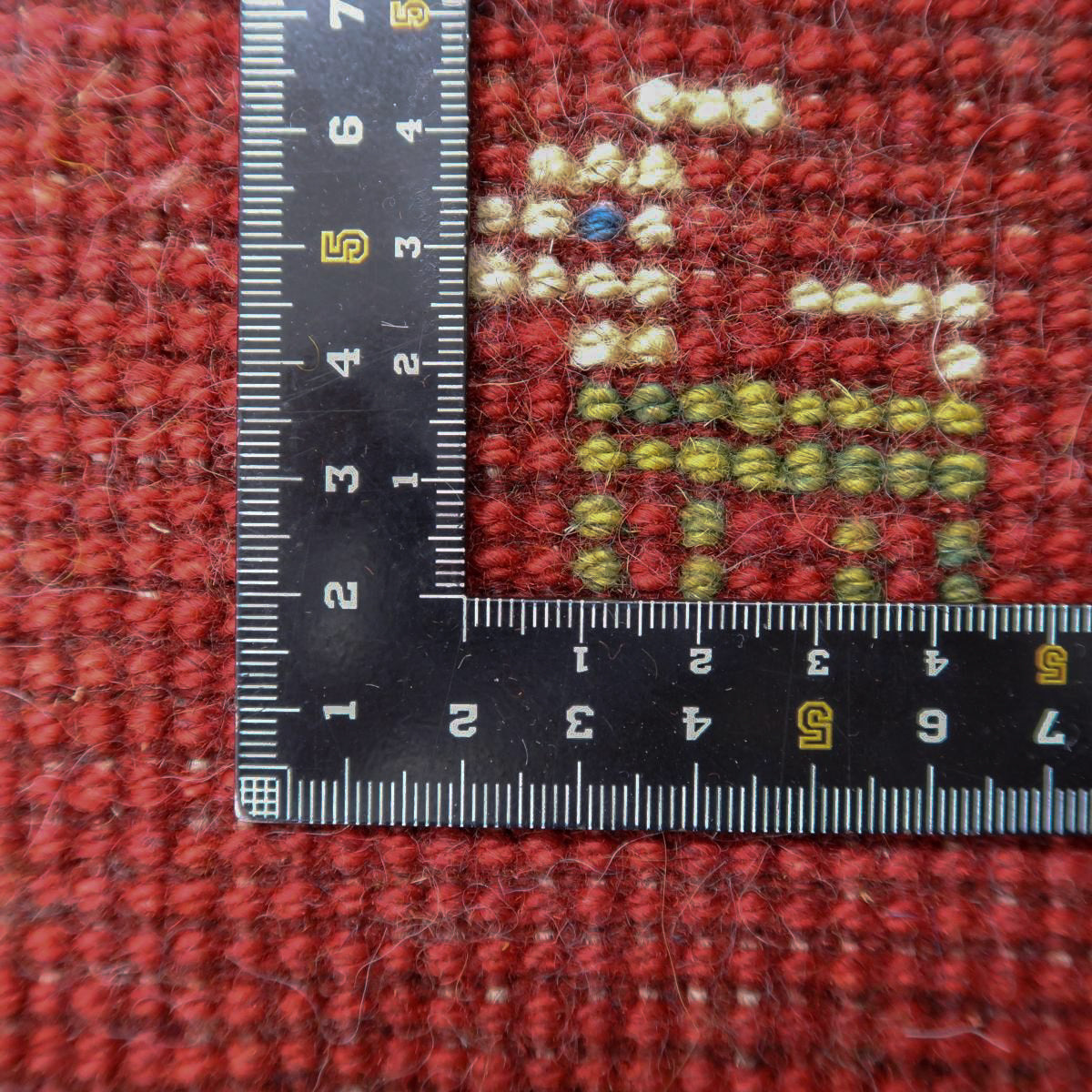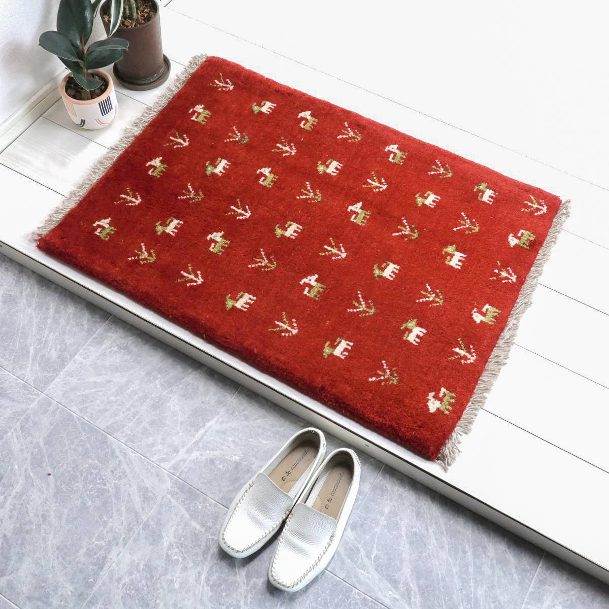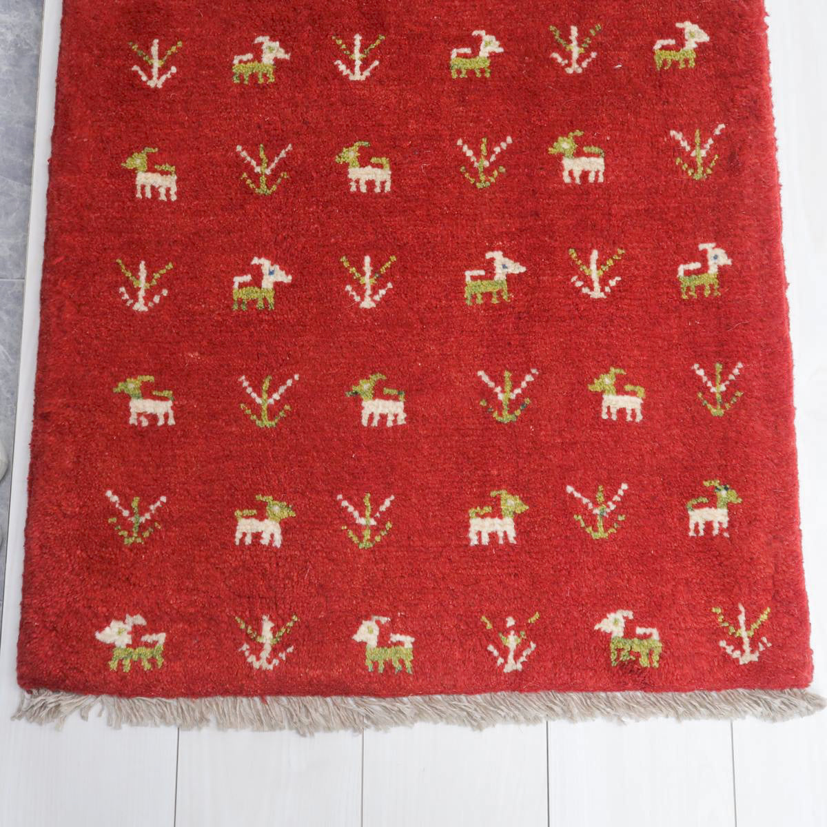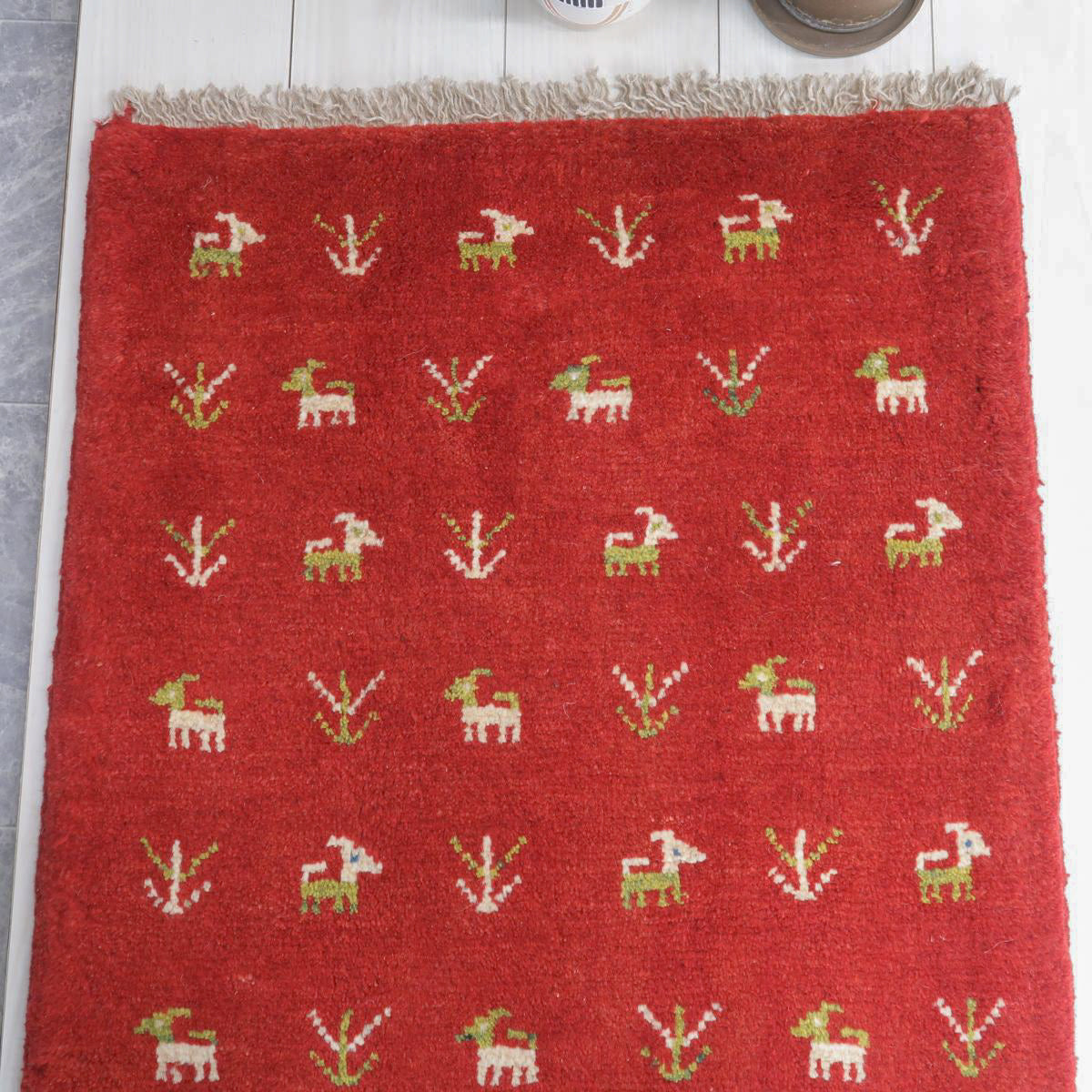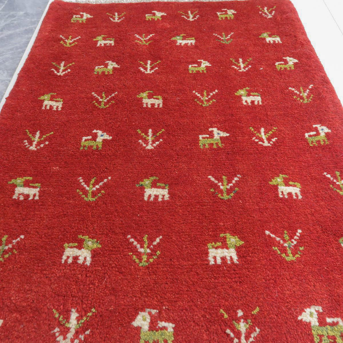 赤を特徴とした手織りの逸品です。ベースカラーの赤に、生成りと緑で可愛らしい動植物のモチーフが散りばめられています。温かみと生き生きとした雰囲気のギャッベです。