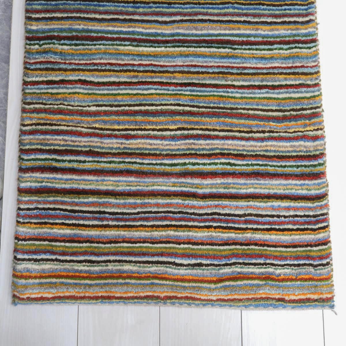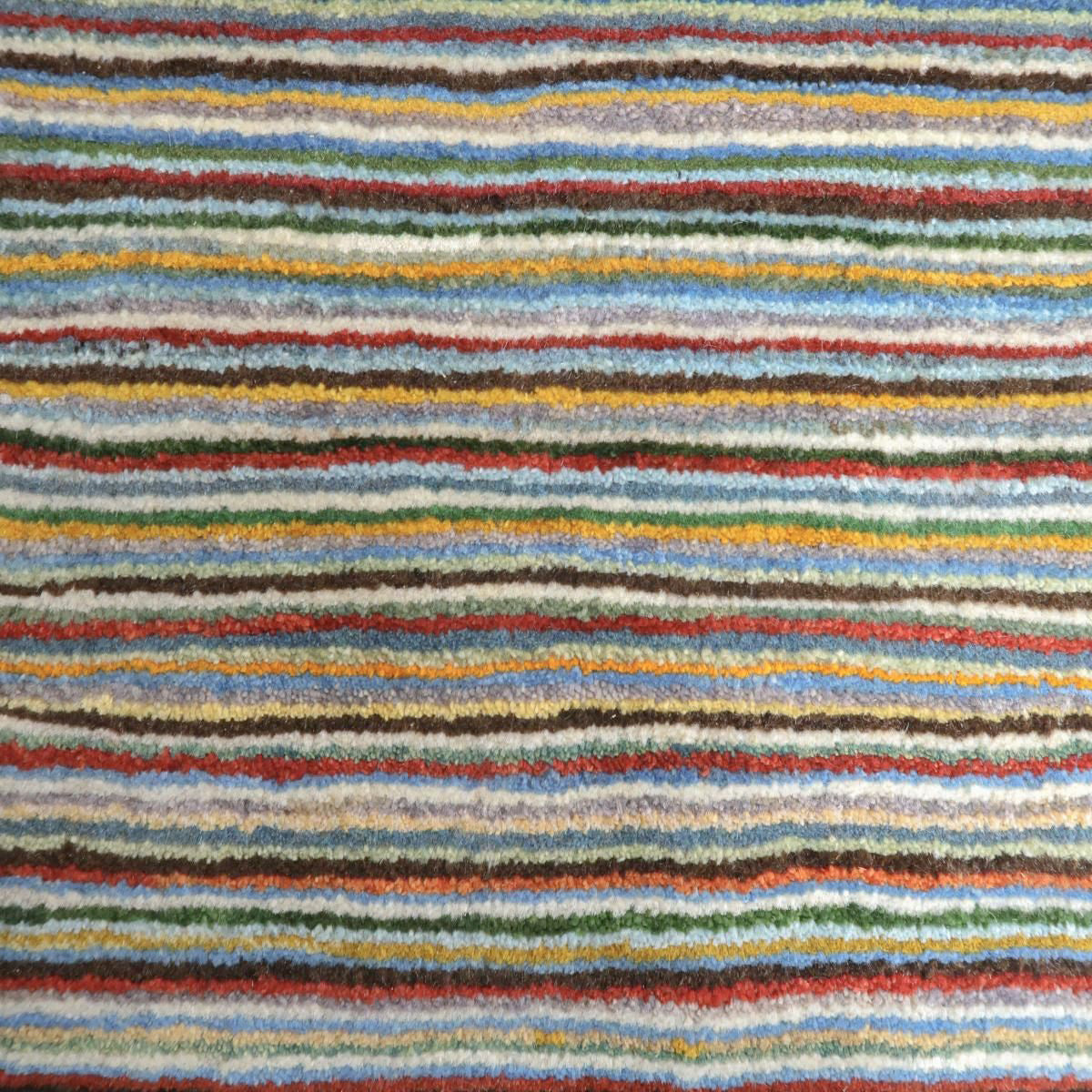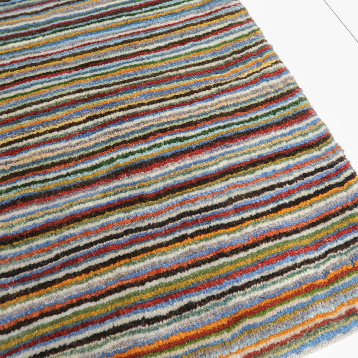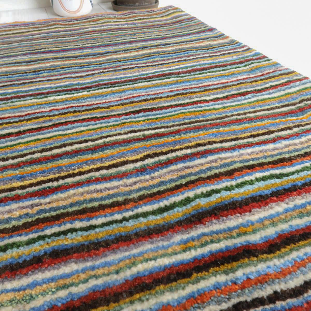 多彩な色合いを特徴とした手織りの逸品です。橙、黄色、青、赤などのストライプが美しく描かれて絶妙に調和し、見る者に鮮やかで楽しい印象を感じさせます。空間に明るく生き生きとした雰囲気を与えてくれるギャッベです。