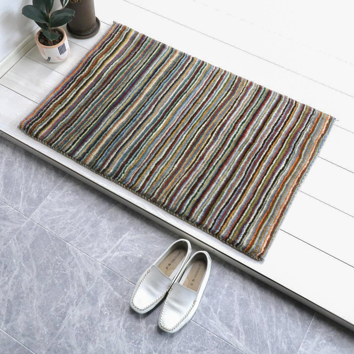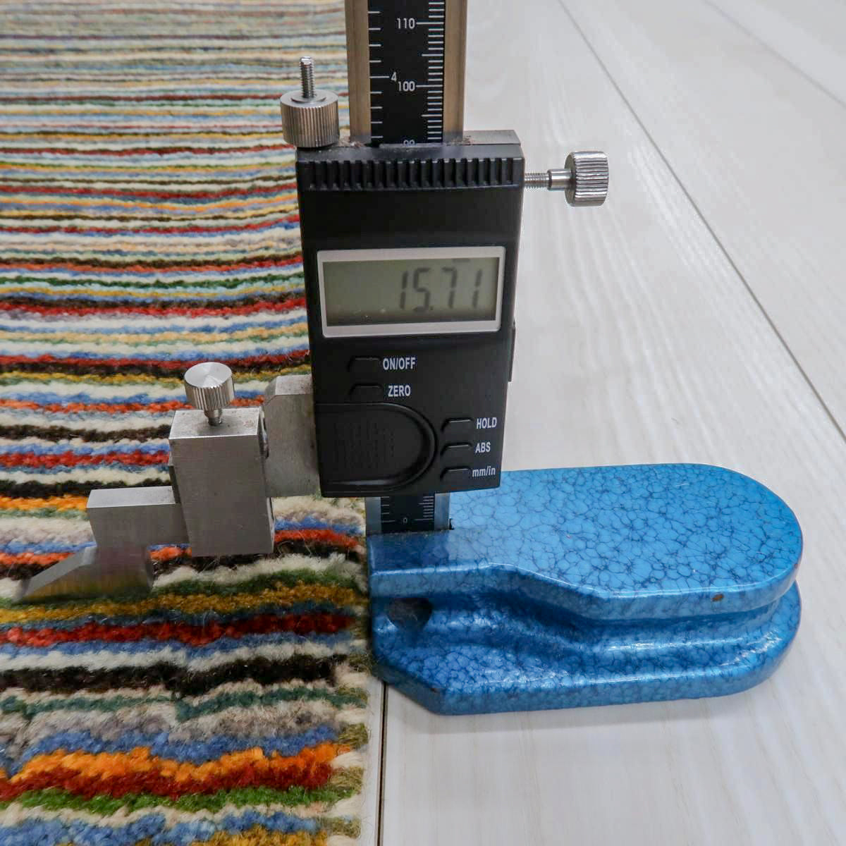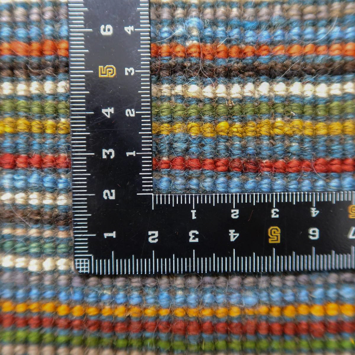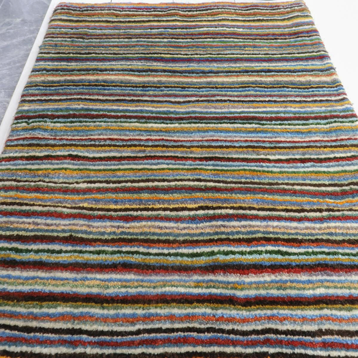 多彩な色合いを特徴とした手織りの逸品です。橙、黄色、青、赤などのストライプが美しく描かれて絶妙に調和し、見る者に鮮やかで楽しい印象を感じさせます。空間に明るく生き生きとした雰囲気を与えてくれるギャッベです。