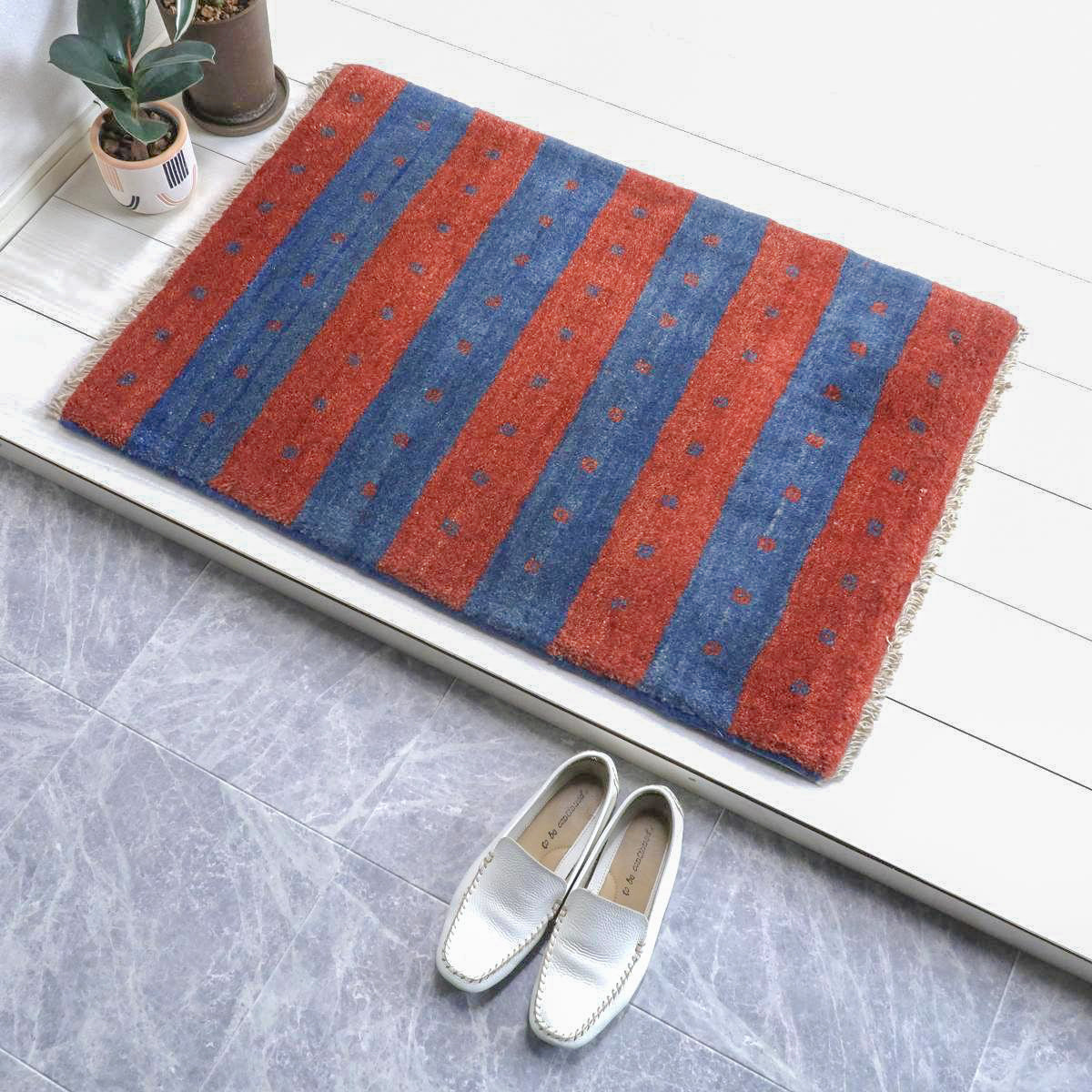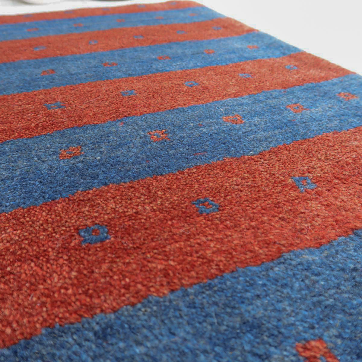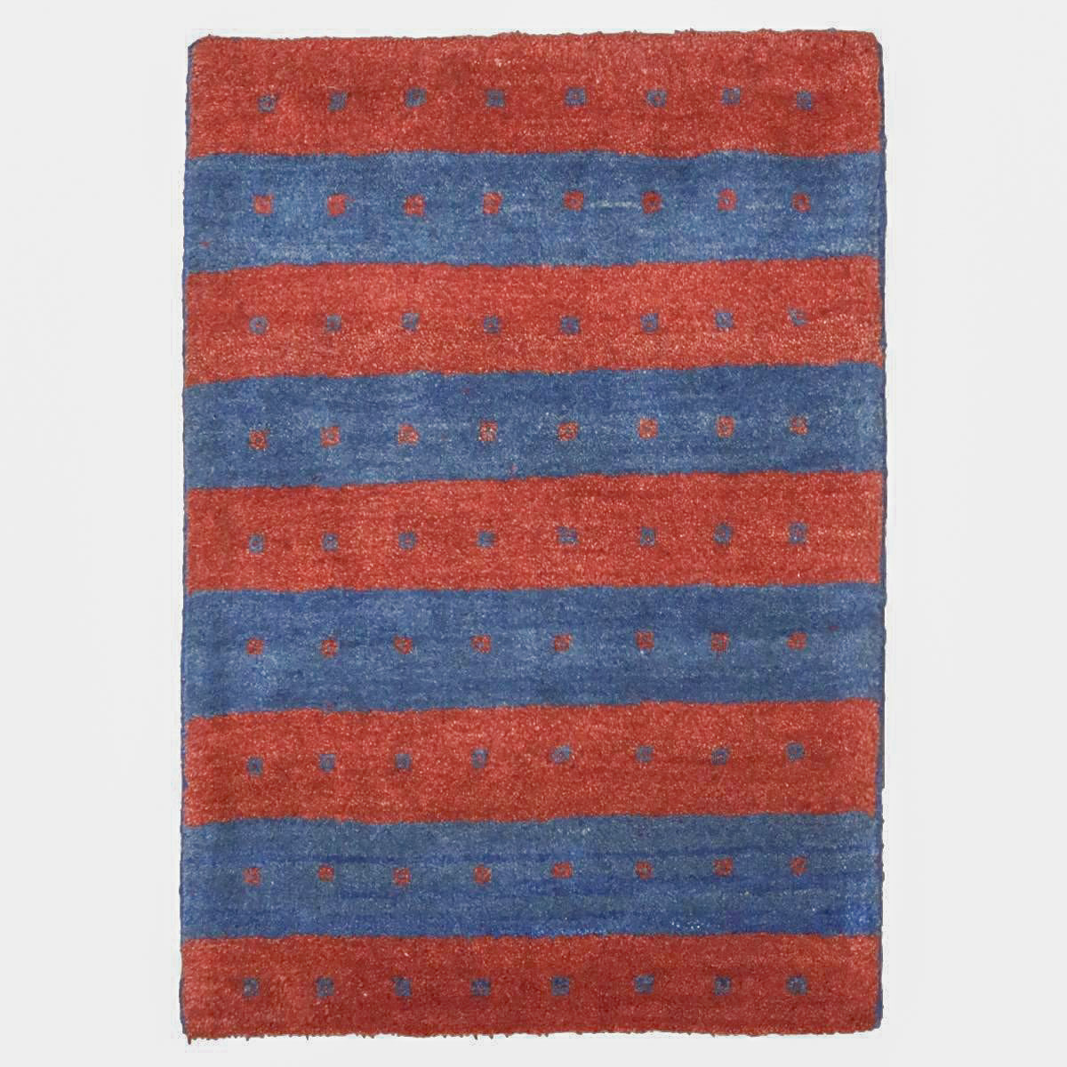 赤と青を特徴とした手織りの逸品です。シンプルなストライプの上に四角の模様が描かれ、洗練された雰囲気の中に遊び心を感じさせます。