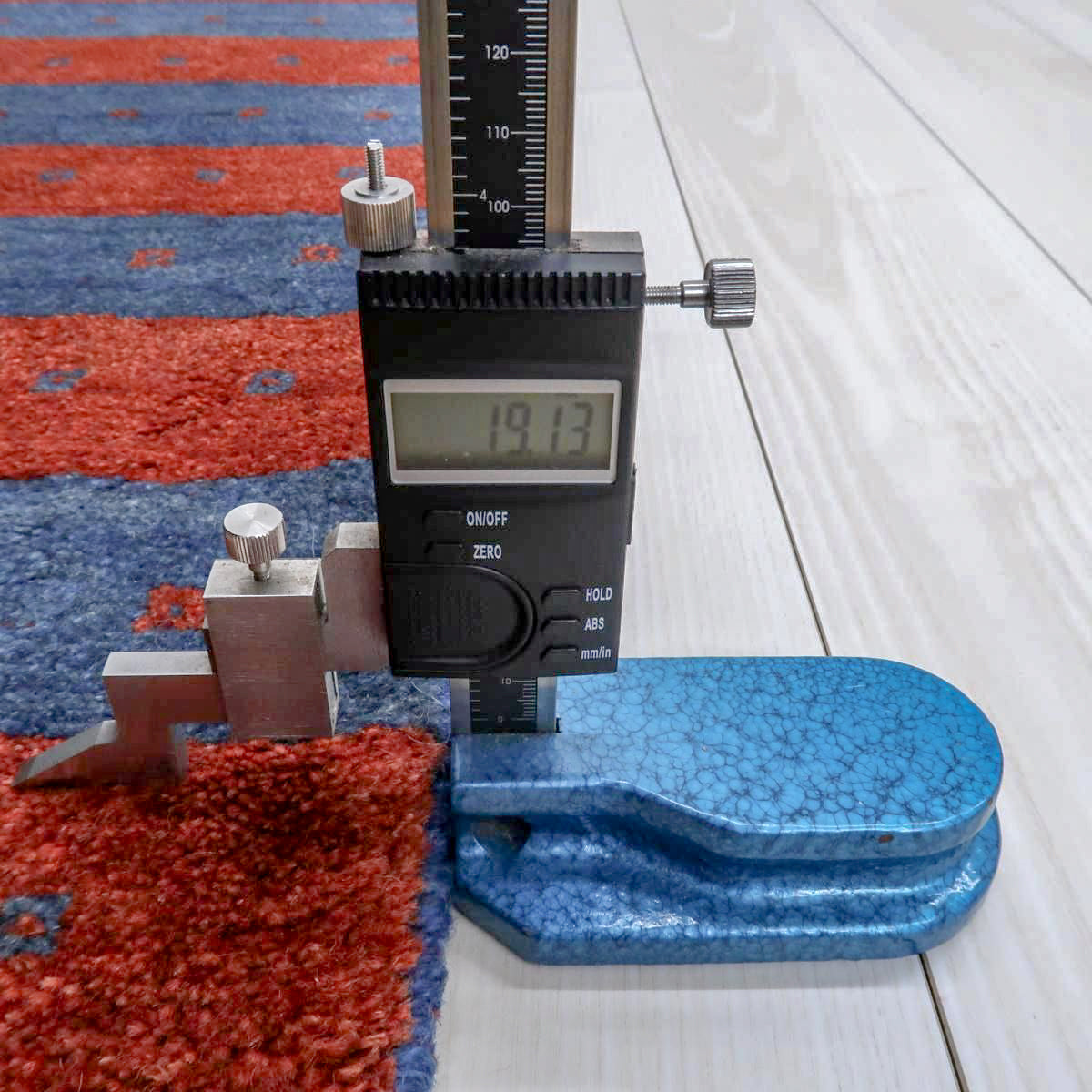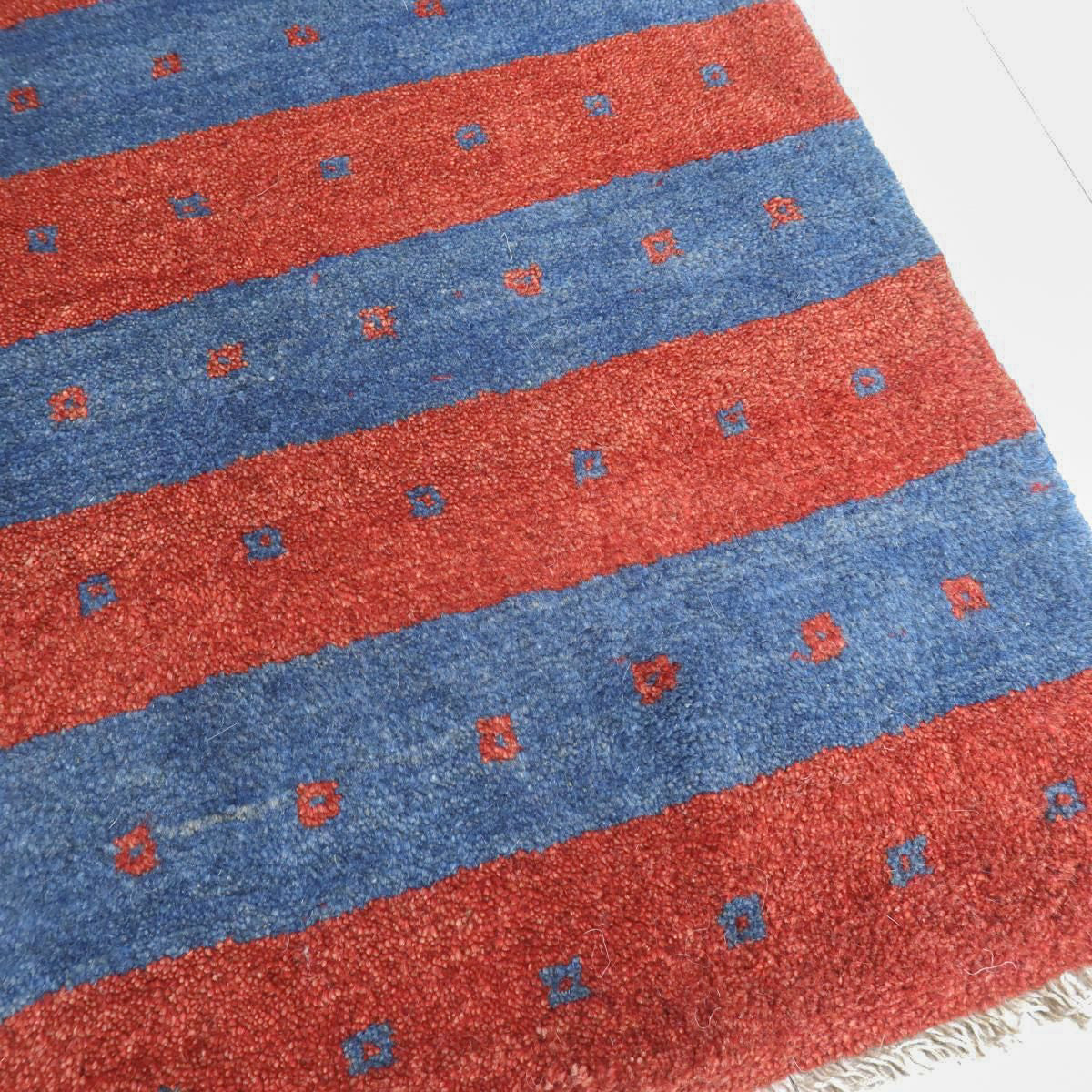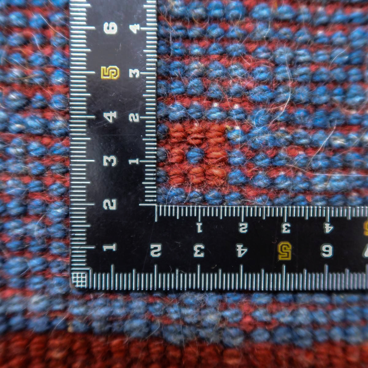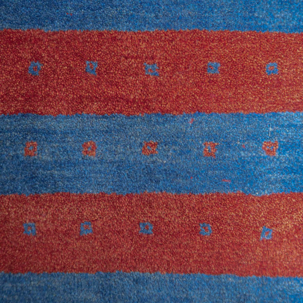 赤と青を特徴とした手織りの逸品です。シンプルなストライプの上に四角の模様が描かれ、洗練された雰囲気の中に遊び心を感じさせます。