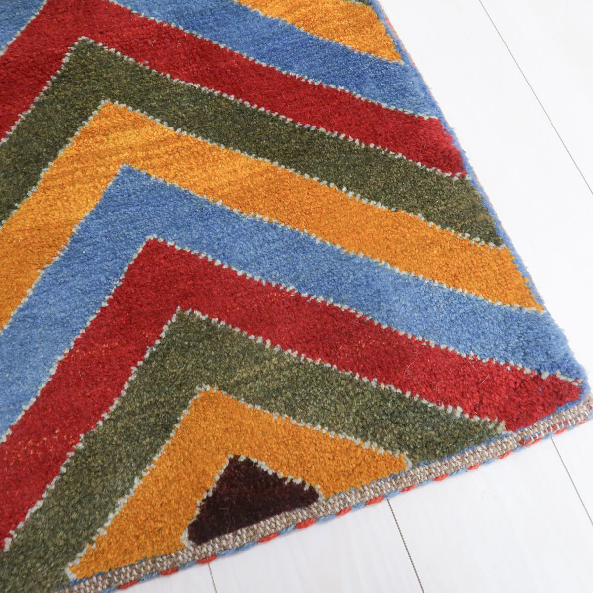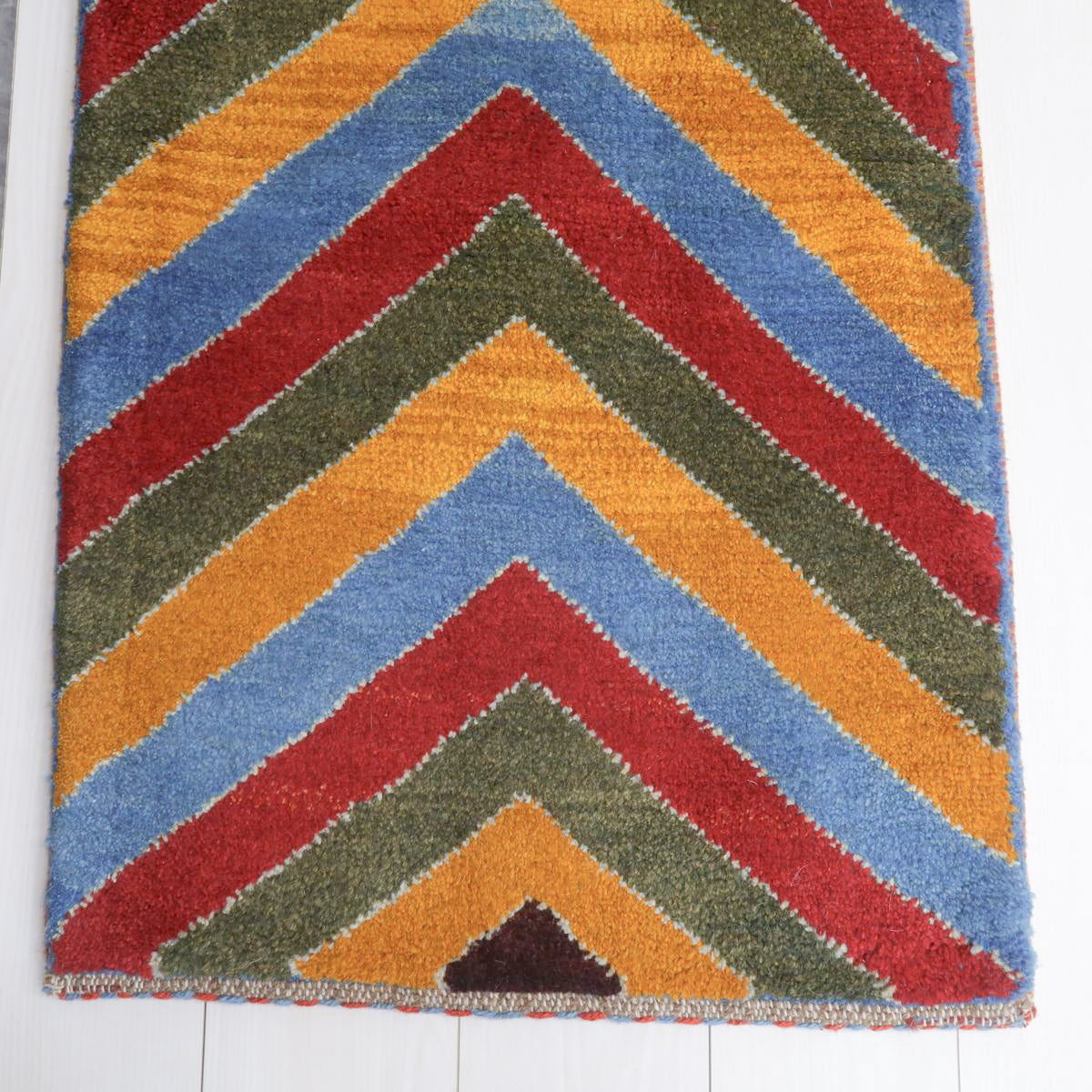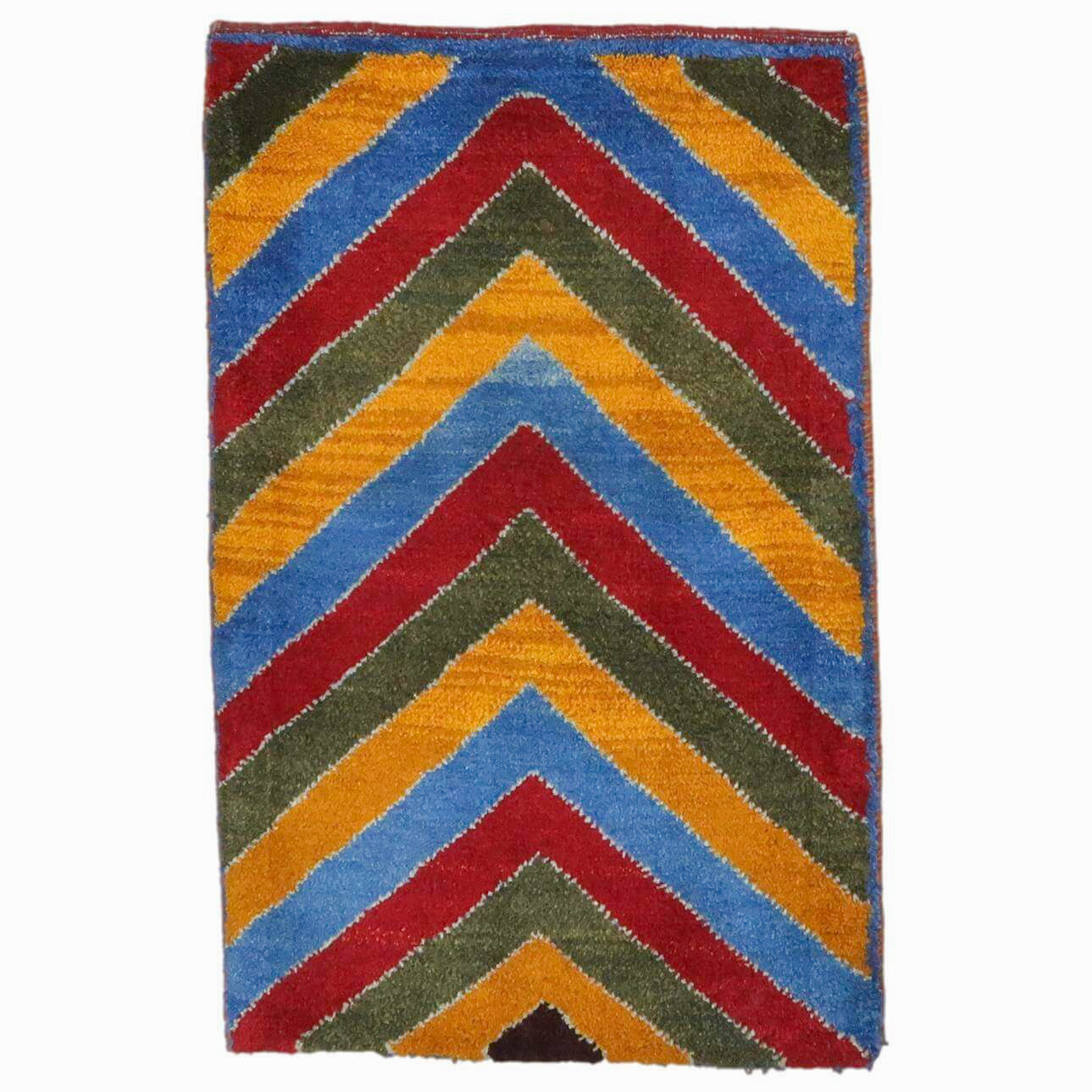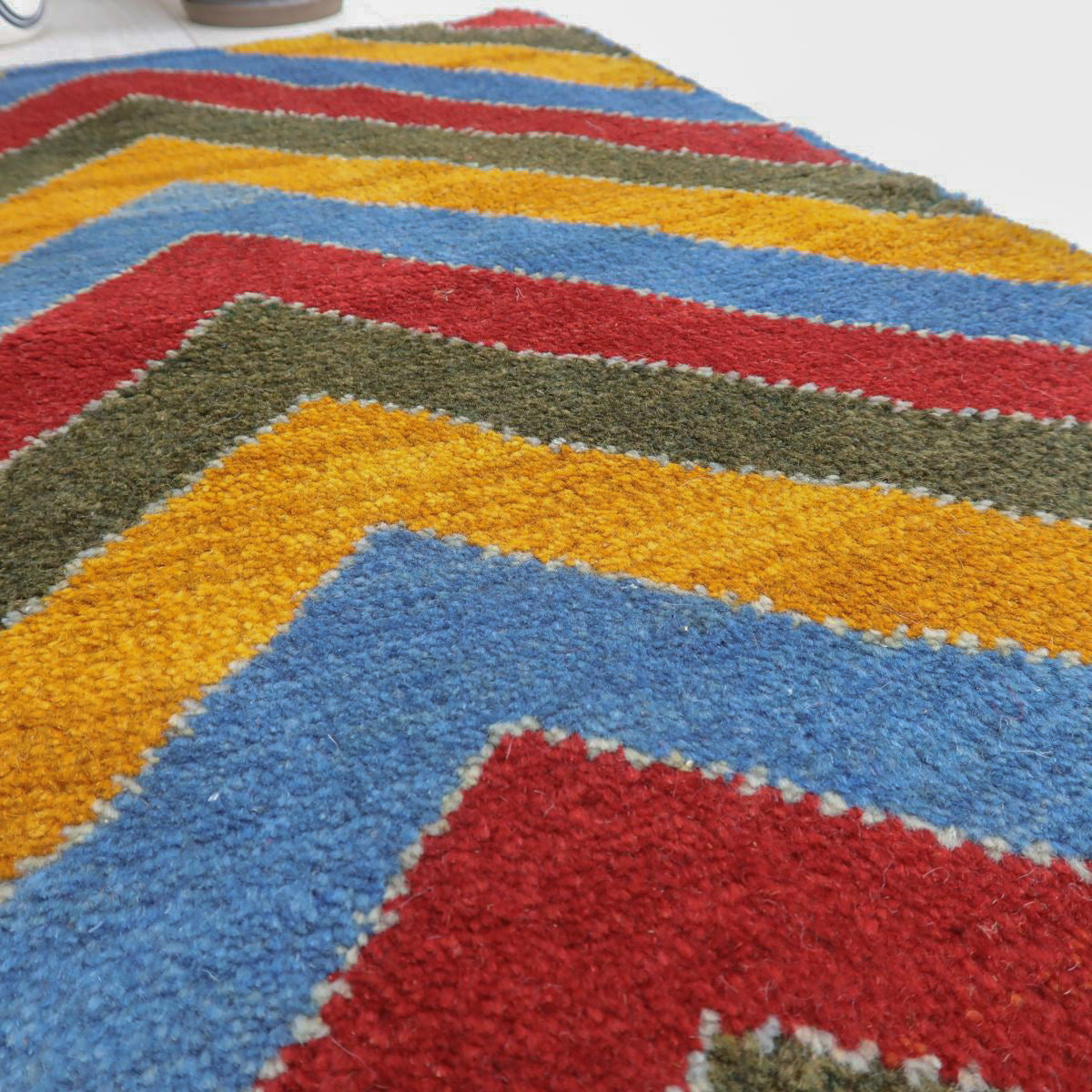 鮮やかな青、赤、橙、緑のカラフルなストライプ模様が巧みに配置され、ギャッベ全体に力強さと活気を感じさせます。お部屋を明るく彩ってくれるような、インパクトのある一枚です。