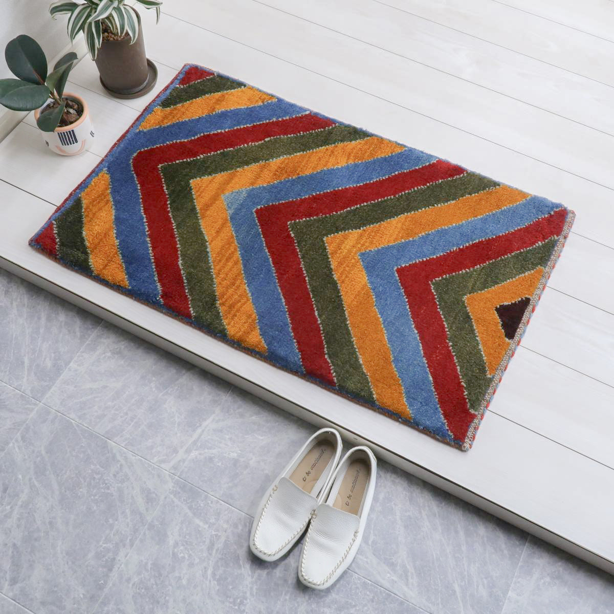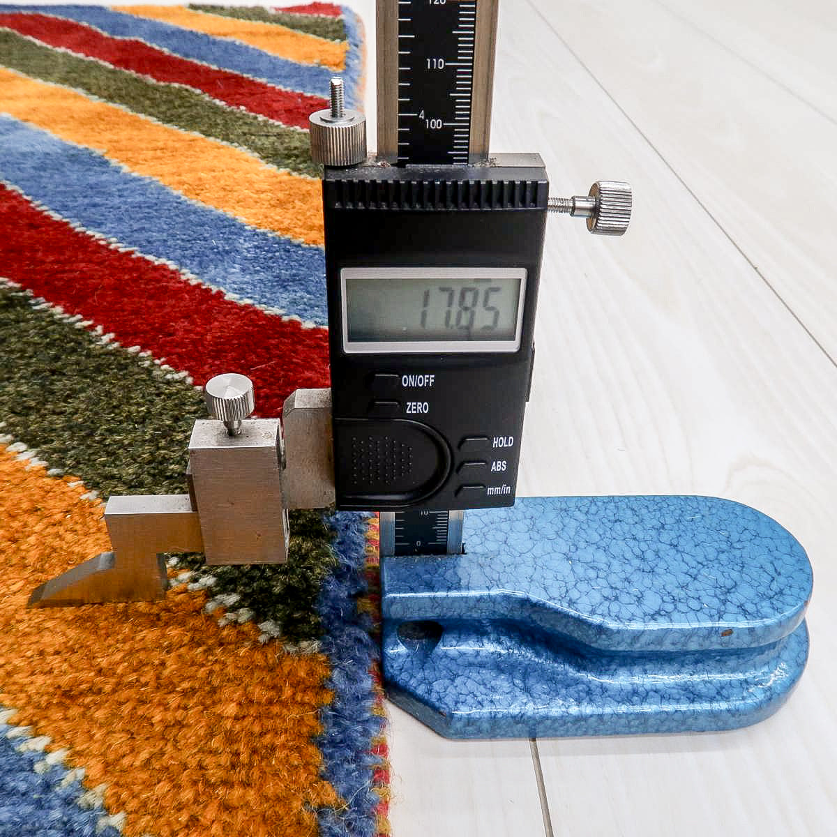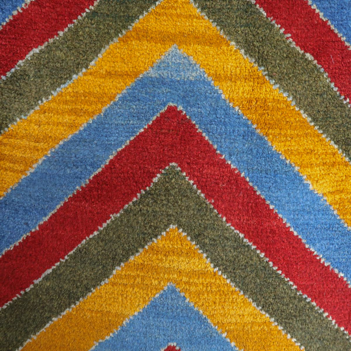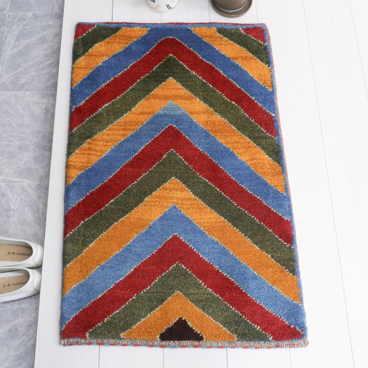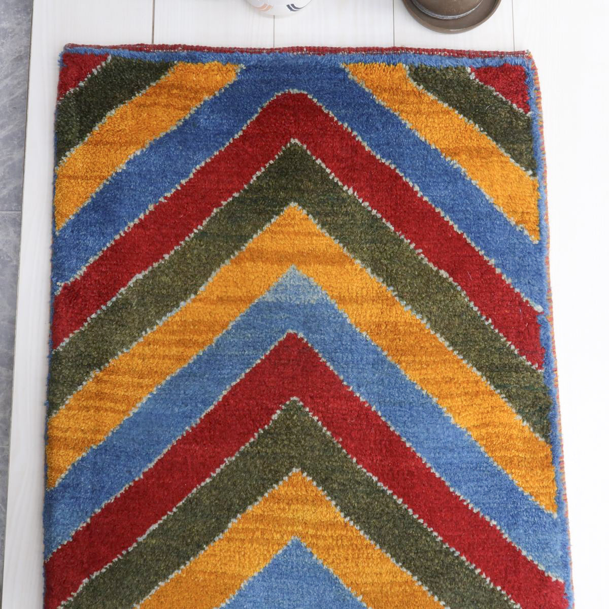 鮮やかな青、赤、橙、緑のカラフルなストライプ模様が巧みに配置され、ギャッベ全体に力強さと活気を感じさせます。お部屋を明るく彩ってくれるような、インパクトのある一枚です。