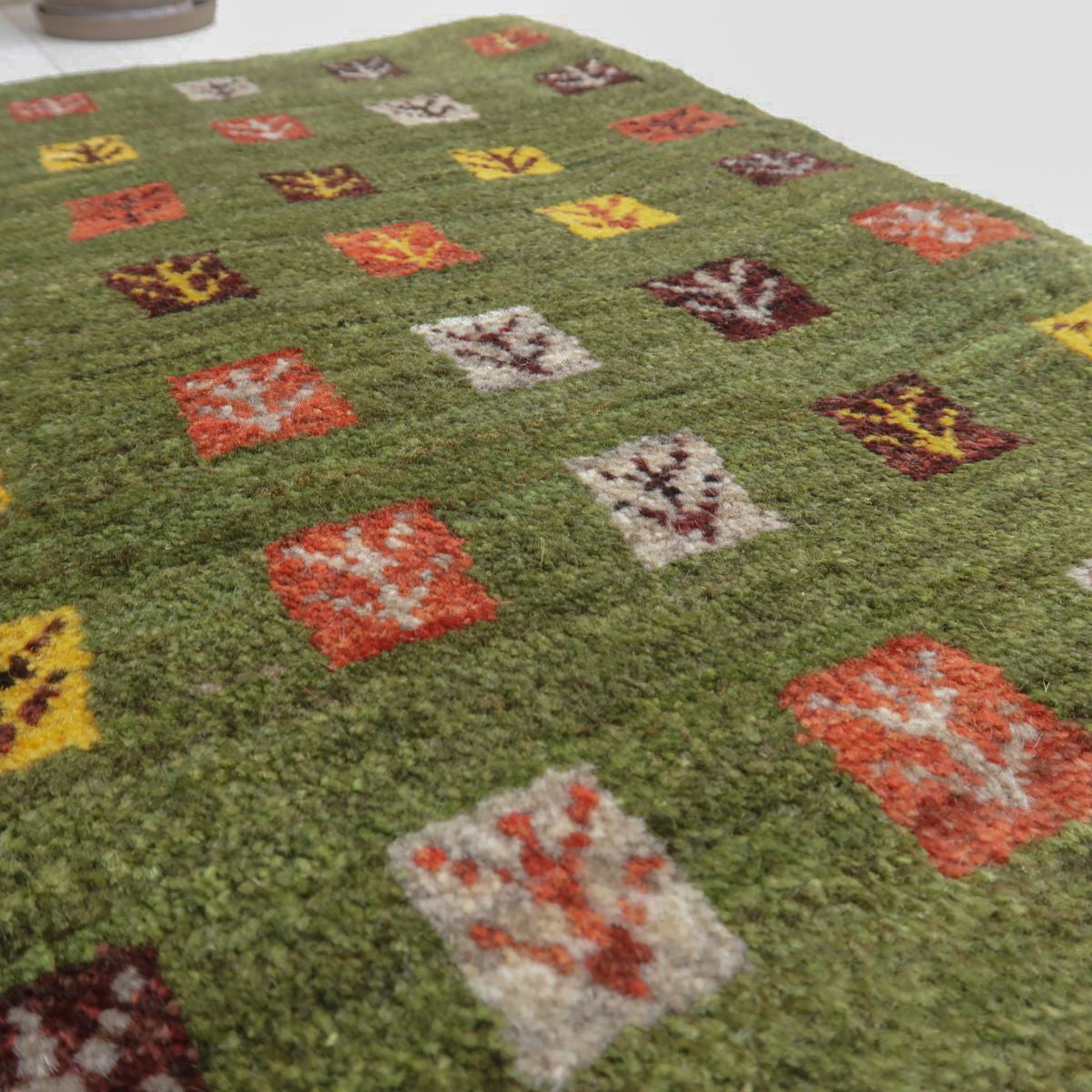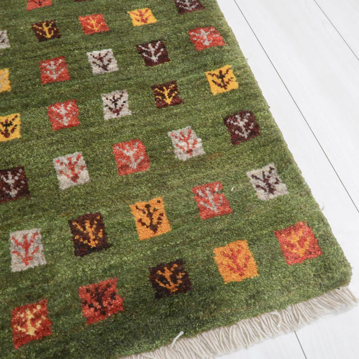 抹茶のような落ち着いた緑を基調とし、一面にカラフルな四角の模様が規則的に描かれています。各模様の中には可愛らしい植物のモチーフが描かれ、自然の豊かさと温かみを感じさせます。お部屋の雰囲気を明るくしてくれそうな一枚です。