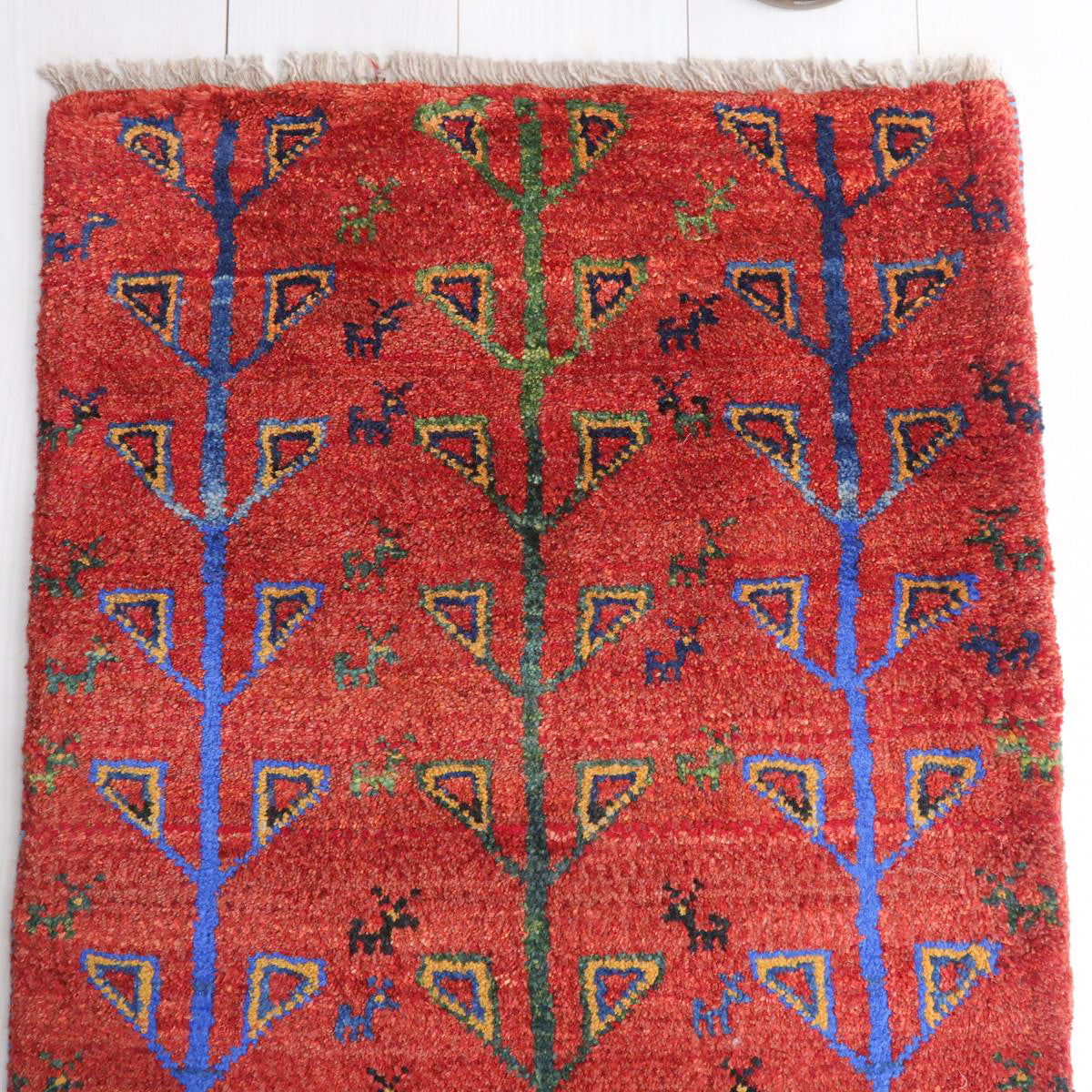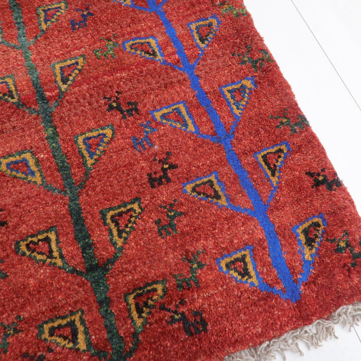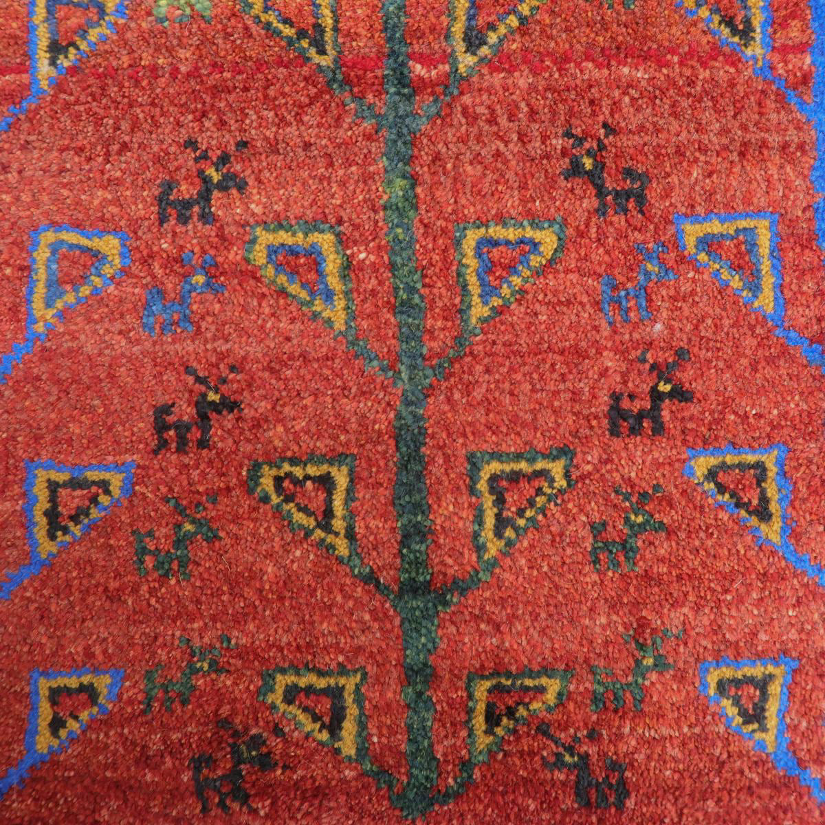 鮮やかな赤を基調に、青と緑のモチーフが描かれています。黒や緑の小さな動物モチーフも一面に描かれ、ギャッベ全体を賑やかに彩っています。色彩とデザインが巧みに組み合わさり、お部屋の雰囲気を明るく楽しいものにしてくれる一枚です。