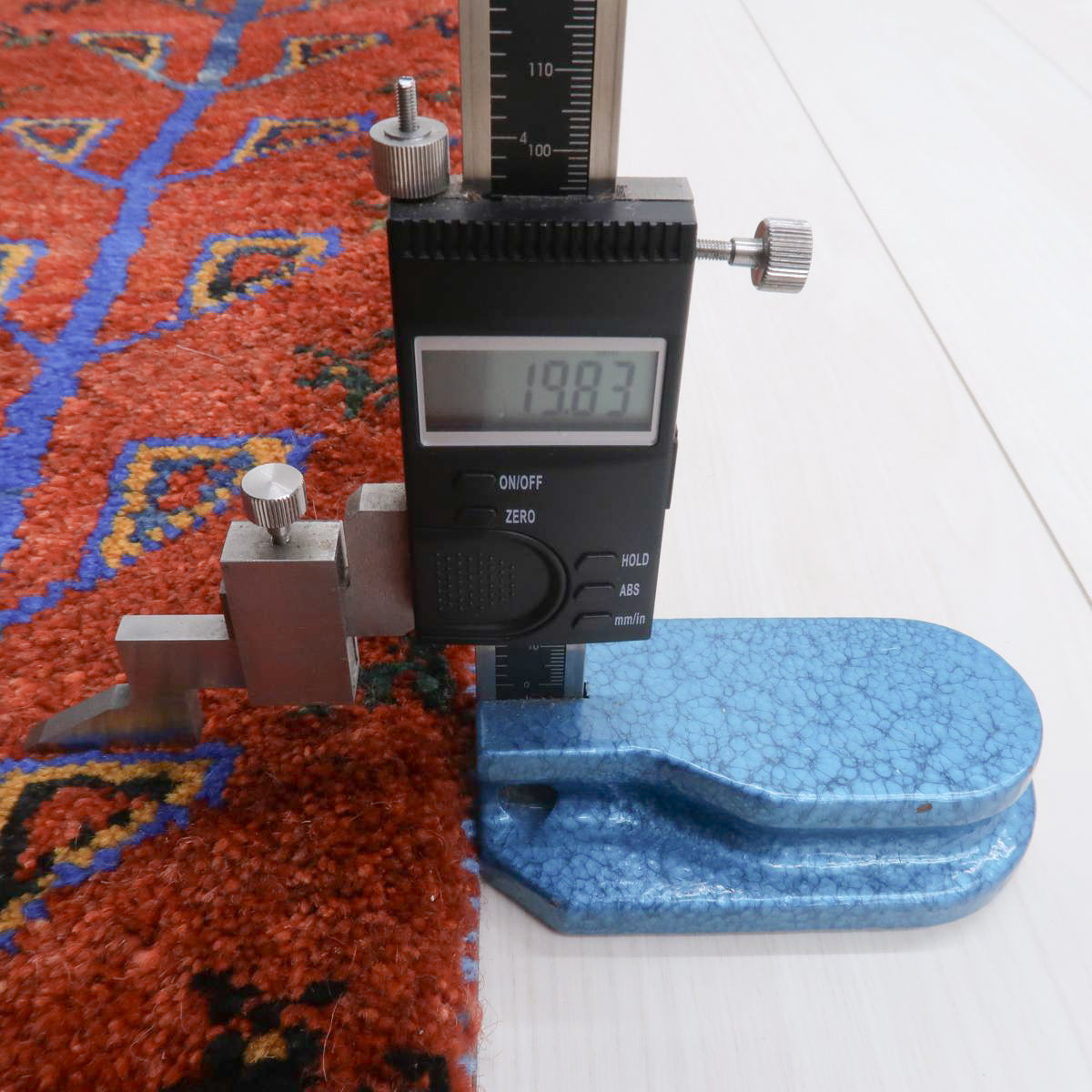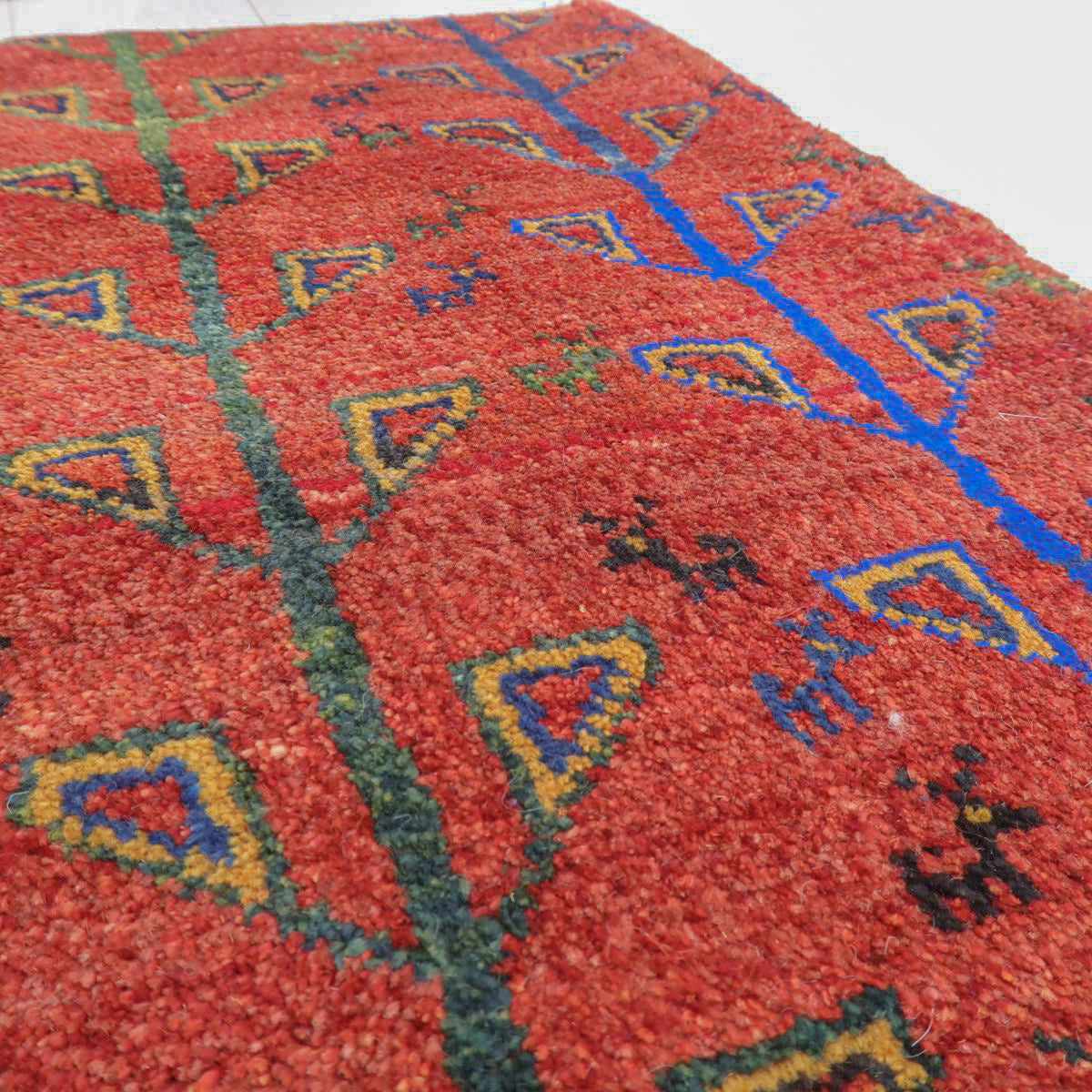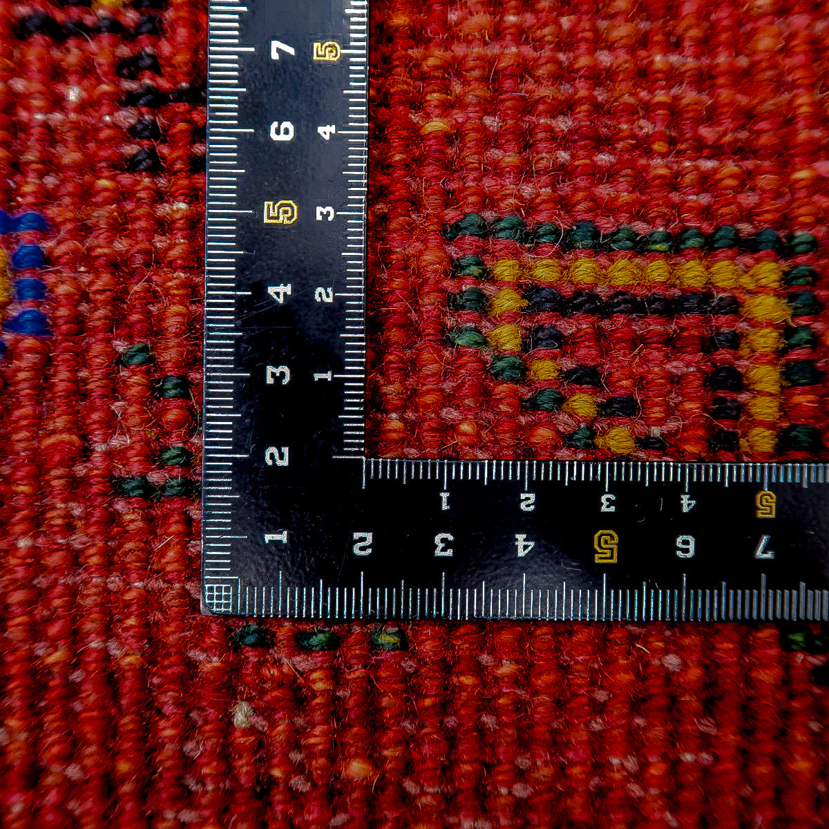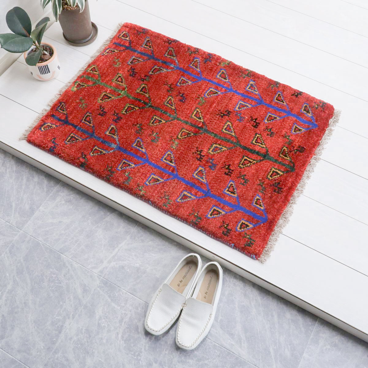 鮮やかな赤を基調に、青と緑のモチーフが描かれています。黒や緑の小さな動物モチーフも一面に描かれ、ギャッベ全体を賑やかに彩っています。色彩とデザインが巧みに組み合わさり、お部屋の雰囲気を明るく楽しいものにしてくれる一枚です。