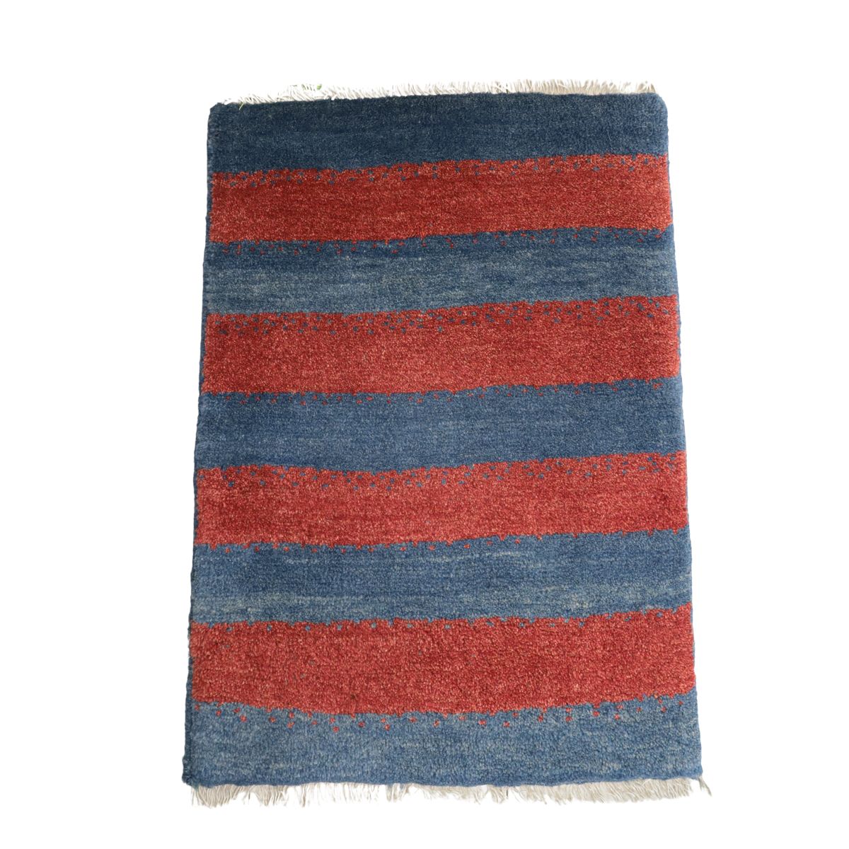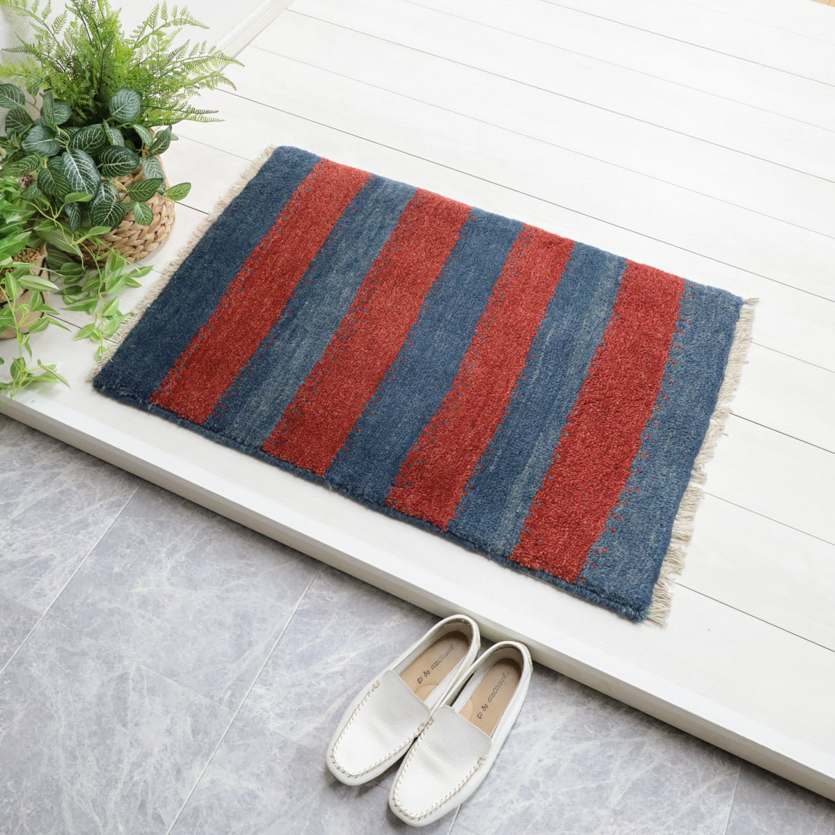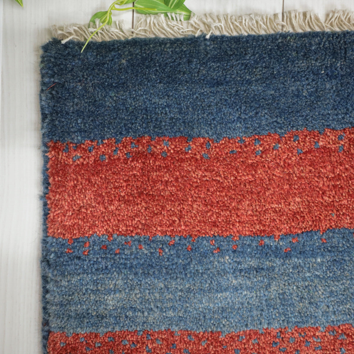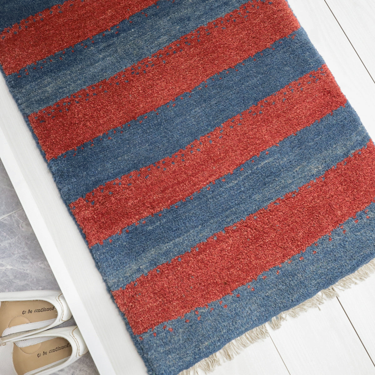 青と赤のシンプルなボーダー柄。どちらもくすんだような落ち着きある色合いで、草木染の自然な風合いが楽しめます。控えめにお部屋に溶け込むようなギャッベです。