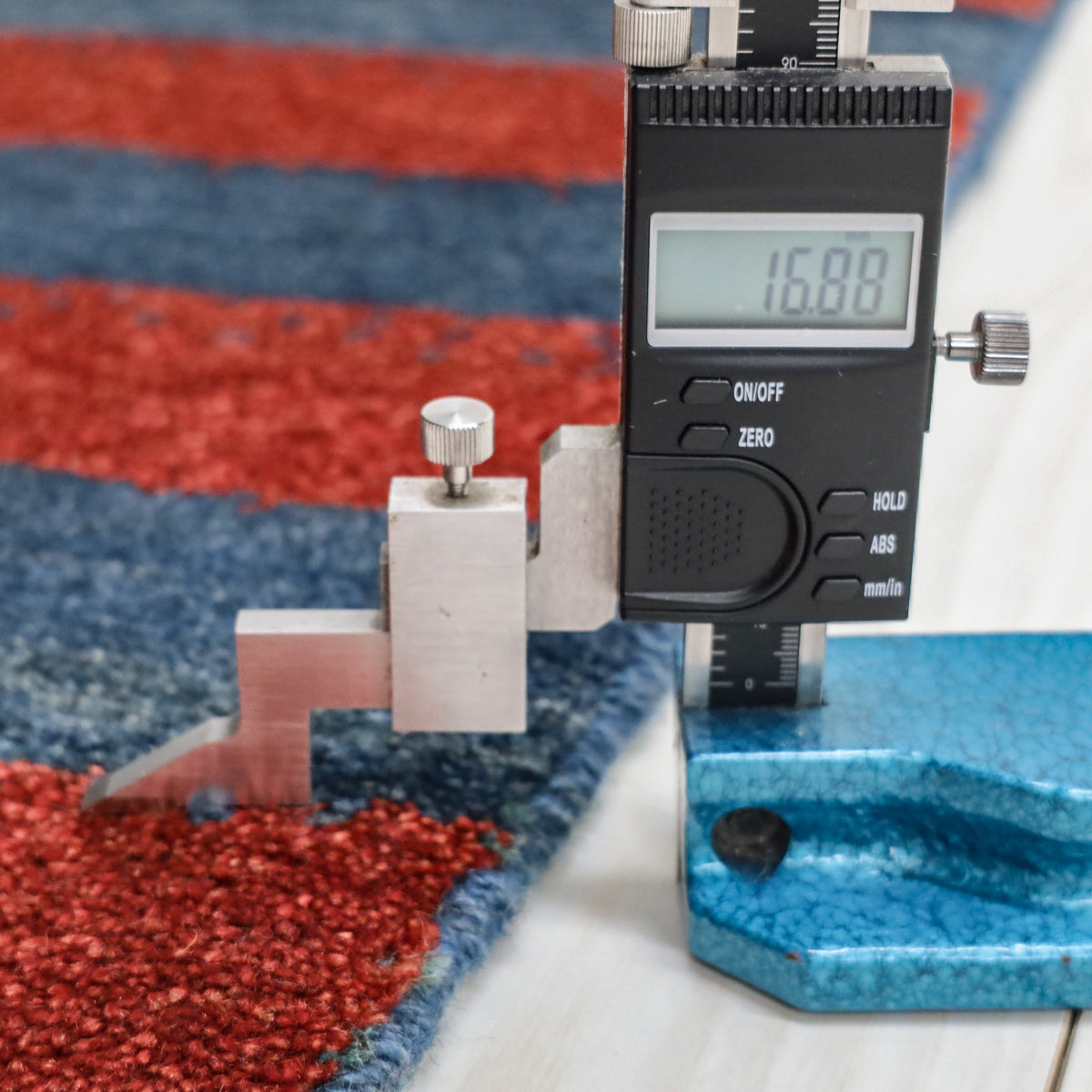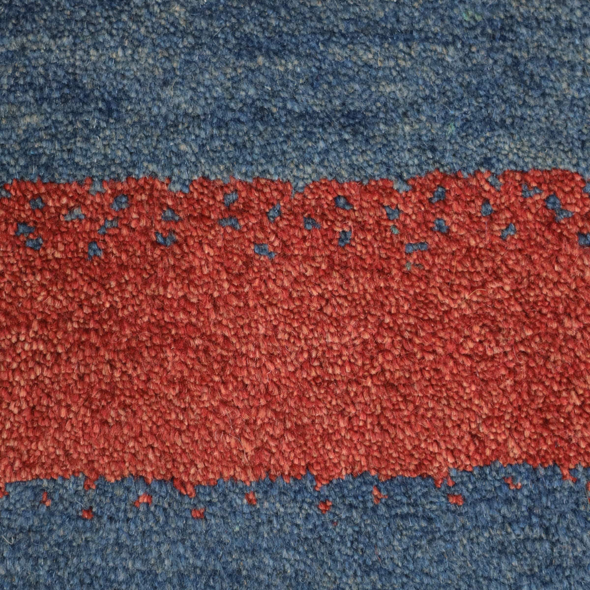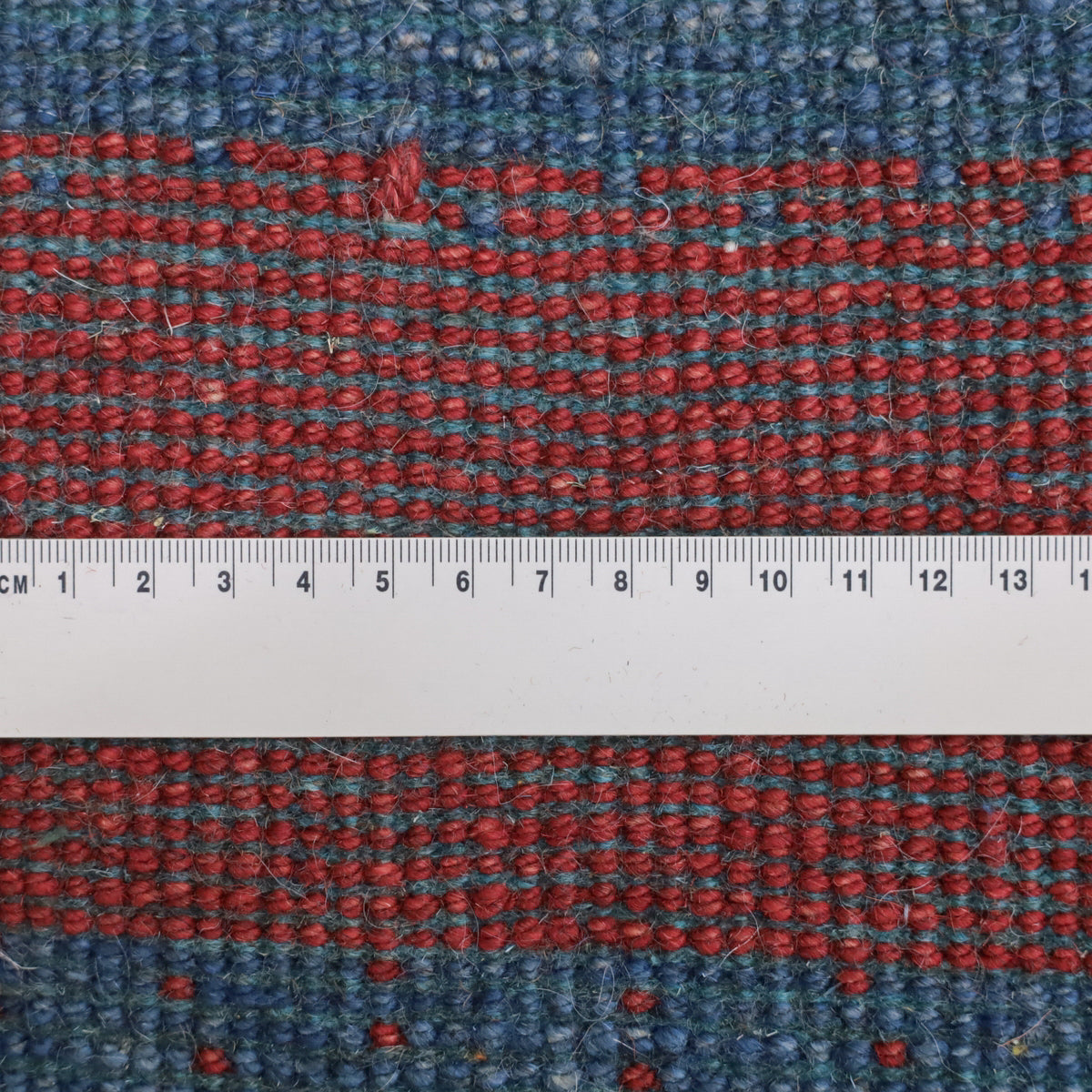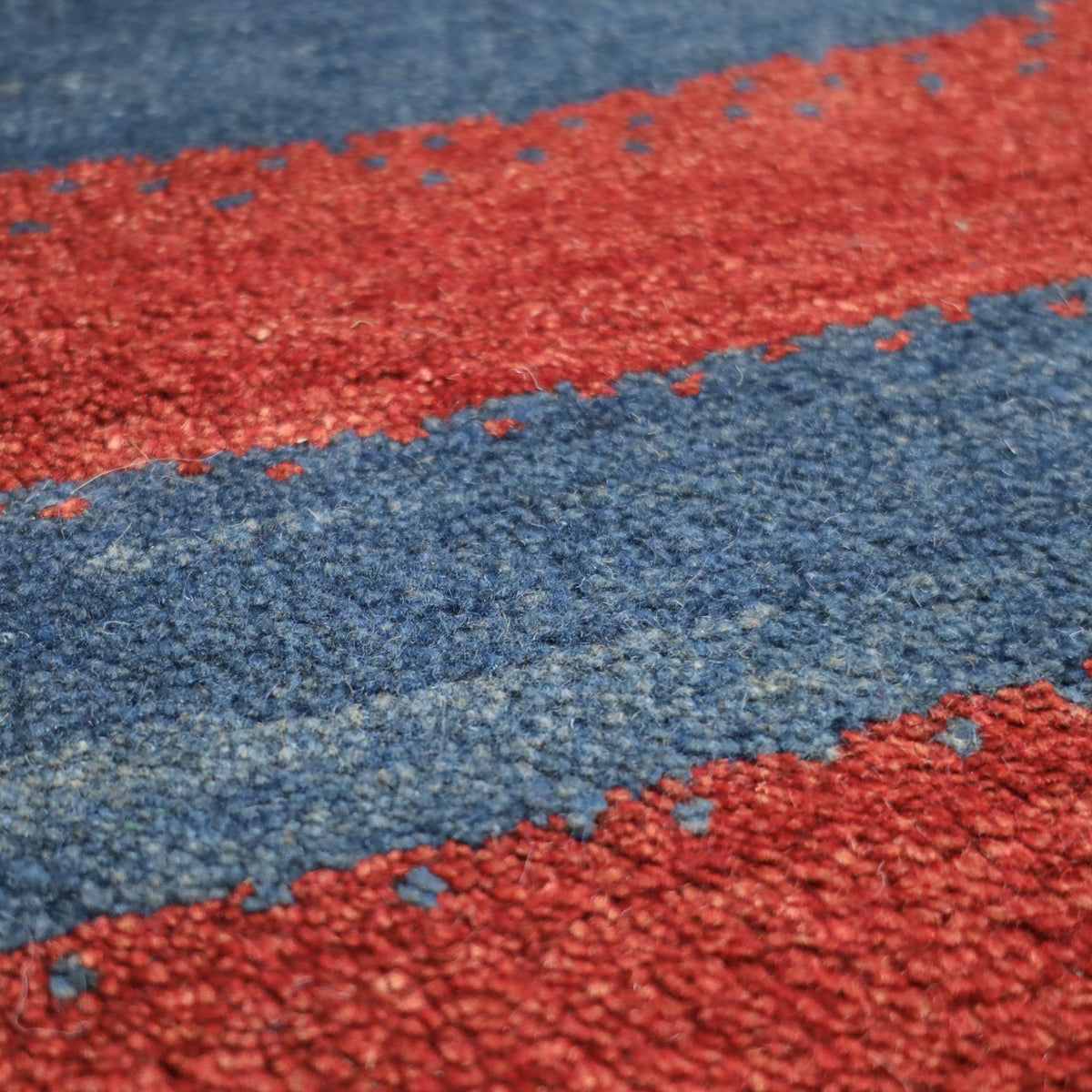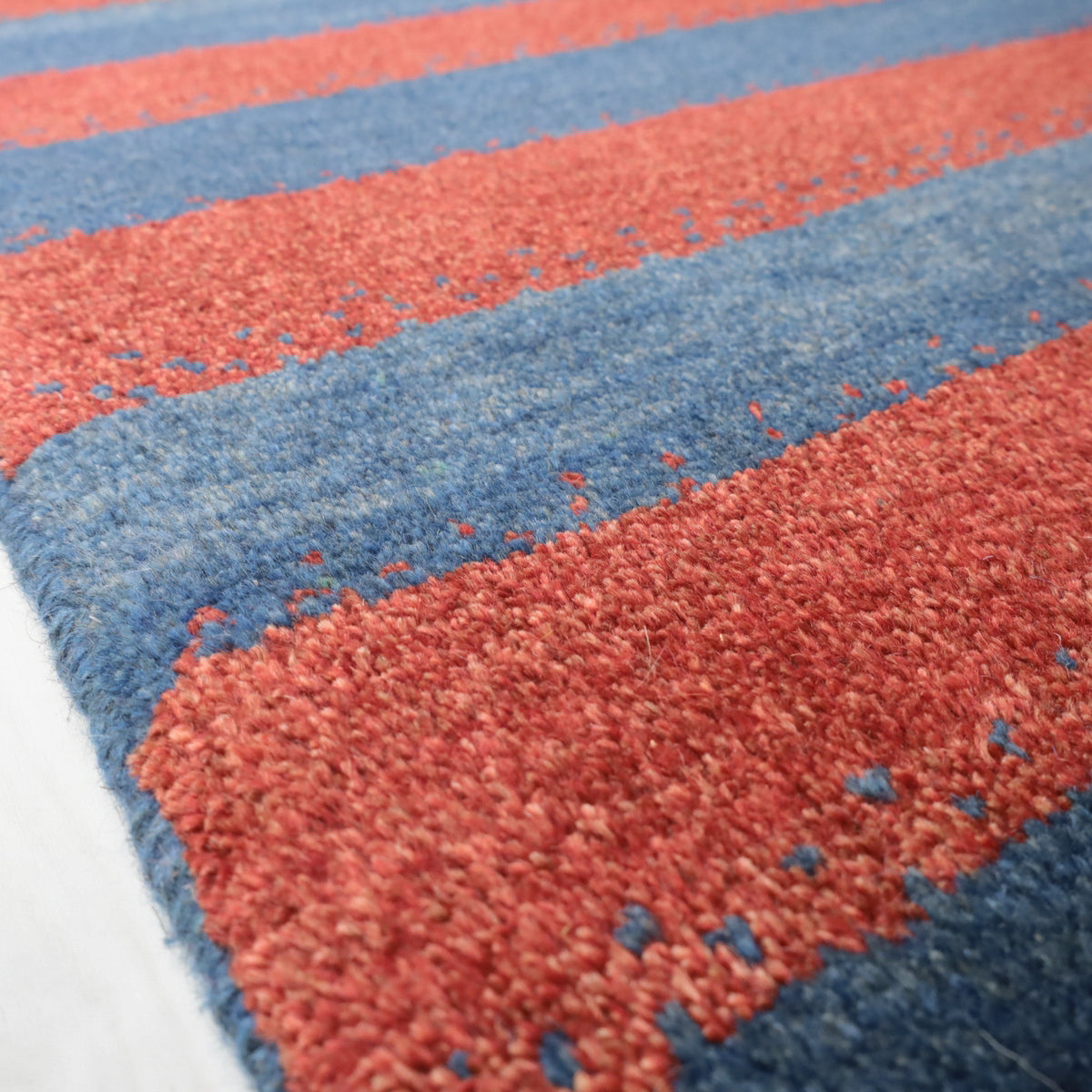 青と赤のシンプルなボーダー柄。どちらもくすんだような落ち着きある色合いで、草木染の自然な風合いが楽しめます。控えめにお部屋に溶け込むようなギャッベです。