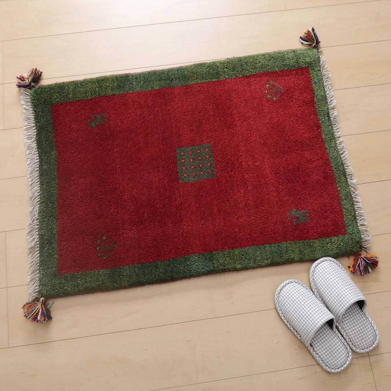 落ち着きのあるレッドカラーに、ナチュラルグリーンの枠がついたツートンカラー。可愛らしい小さなモチーフが入ったシンプルなデザイン。上端で62センチ、下端で65センチと横幅に手織りならではの少しの差がございます。