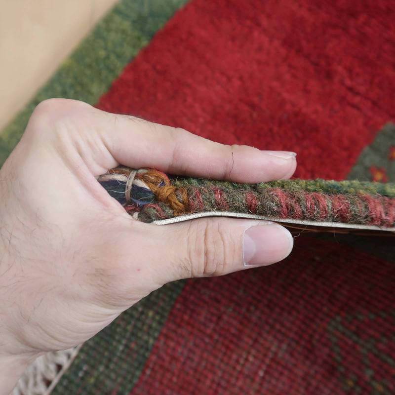 開封すぐの撮影でシワが見える写真があります。照明の違いで色合いが多少違って見えます。また、ギャッベは毛足に向きがあるので、見る方向で、明るかったり暗かったりも見えます。