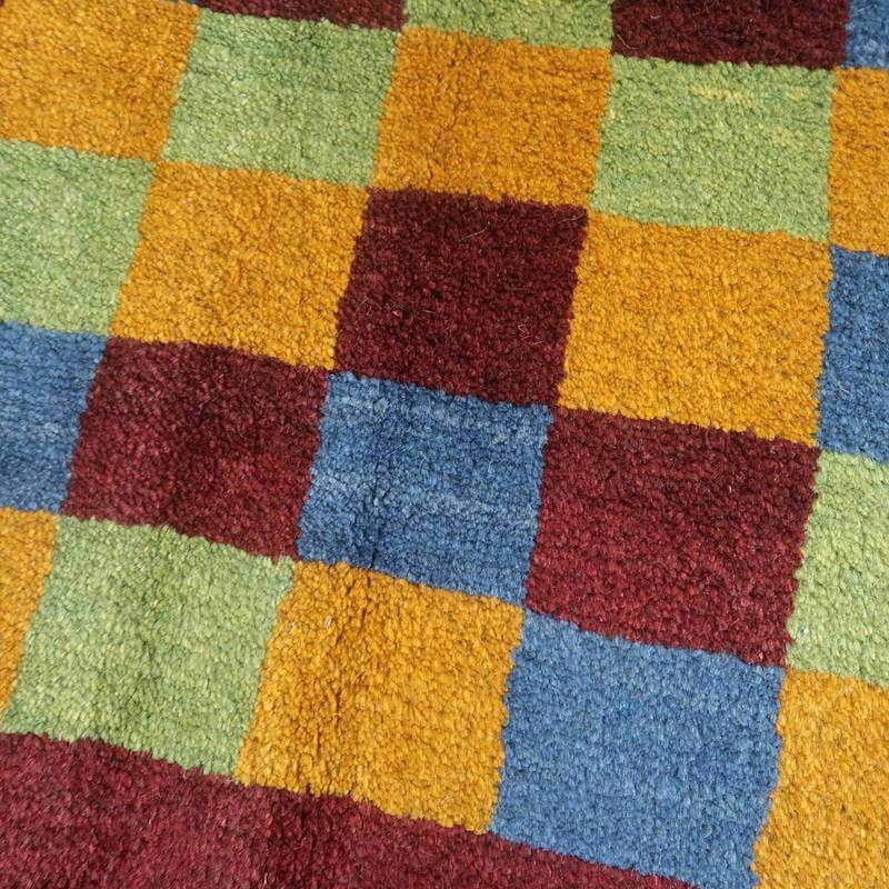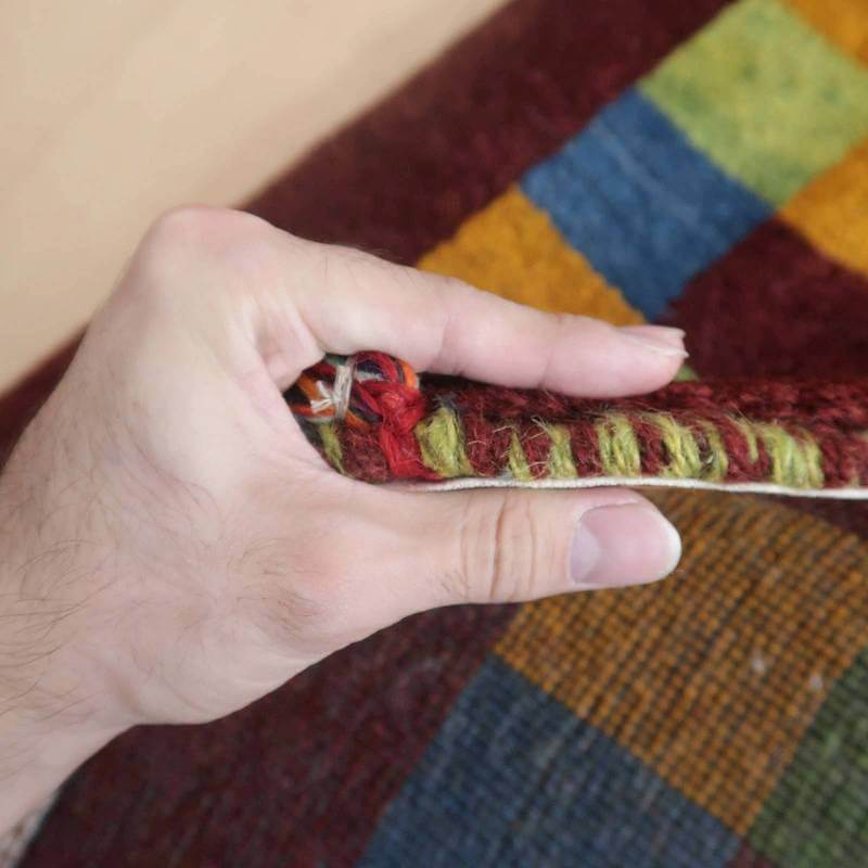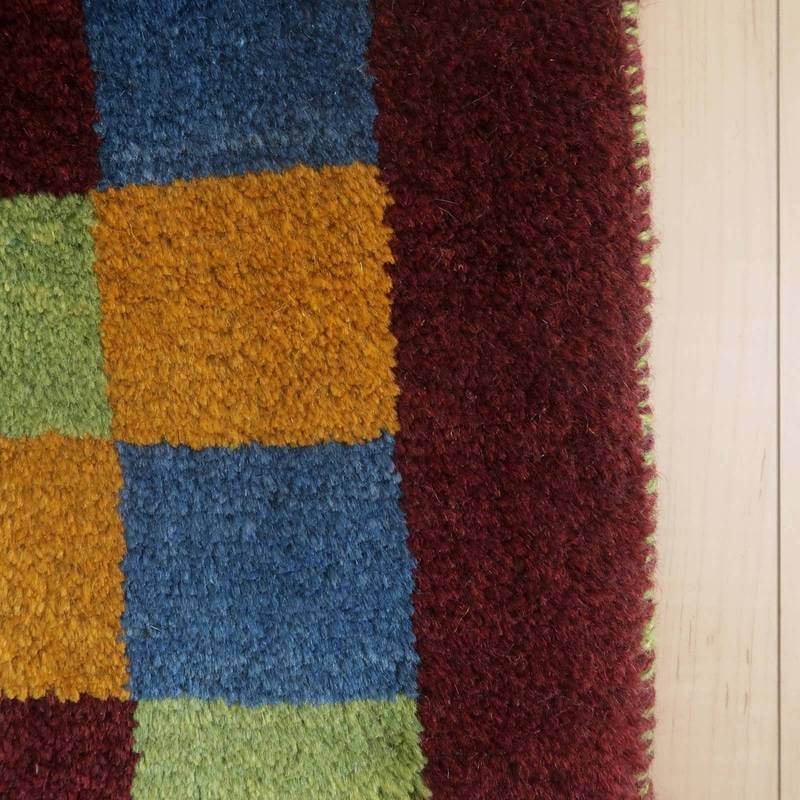 開封すぐの撮影でシワが見える写真があります。照明の違いで色合いが多少違って見えます。また、ギャッベは毛足に向きがあるので、見る方向で、明るかったり暗かったりも見えます。
