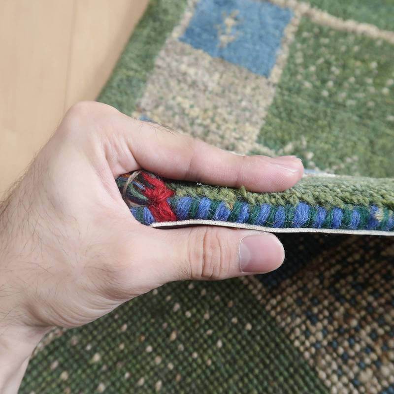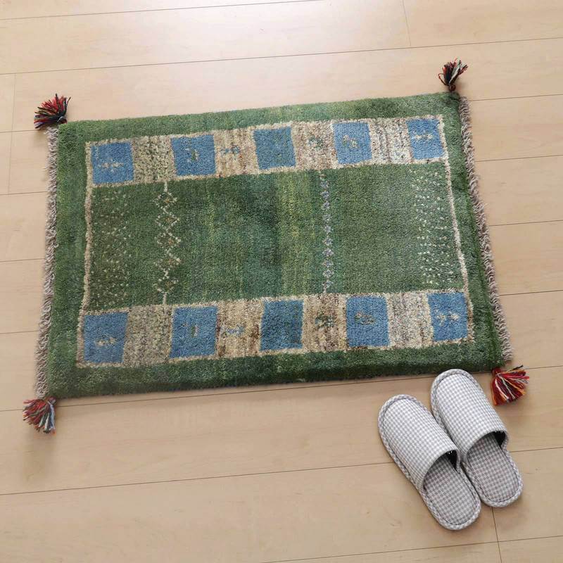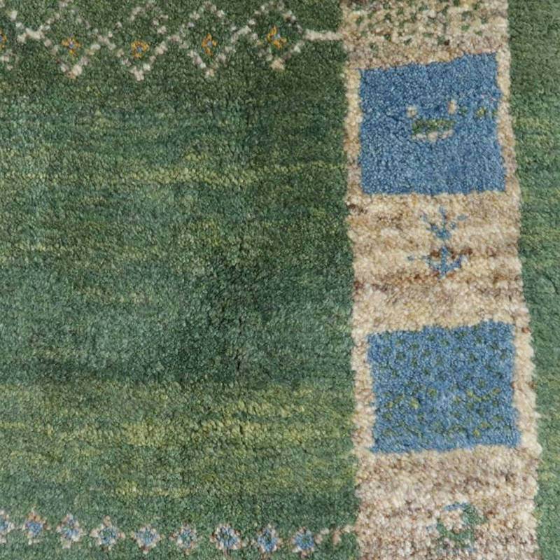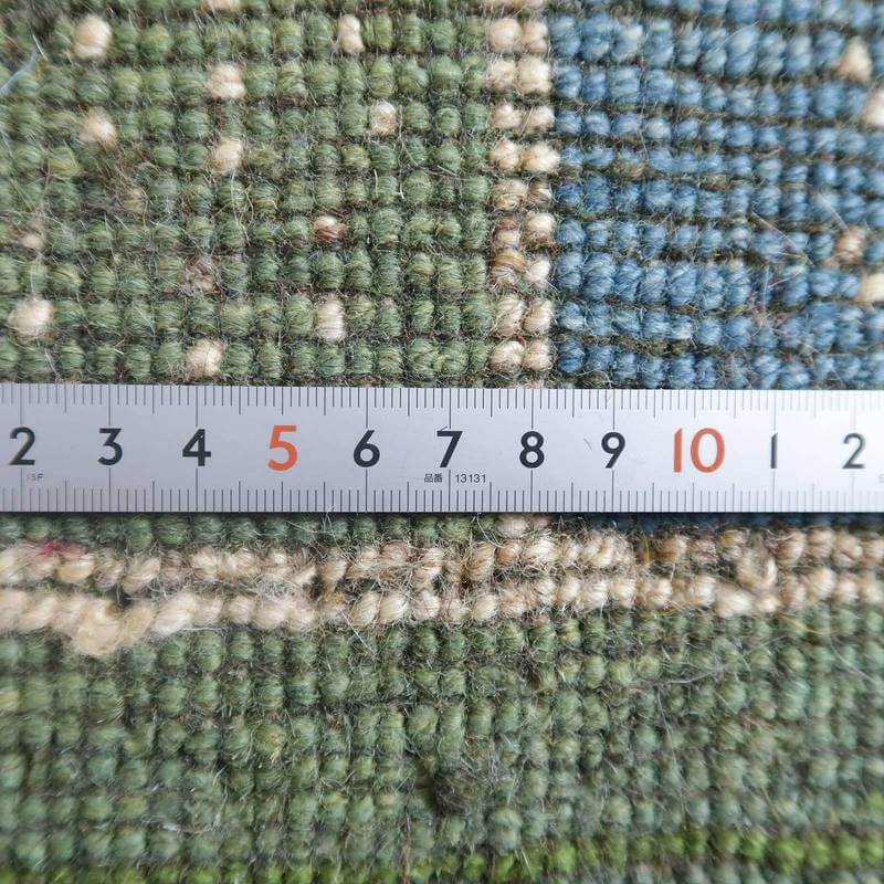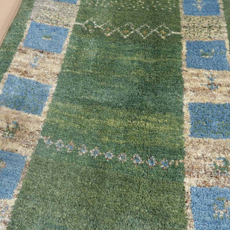 色の揺らぎの感じられるグリーンに、ブルー、無染色の羊色のほんわかとした優しい色合い。小さなモチーフが入った素朴な雰囲気のギャッベです。