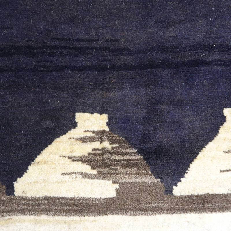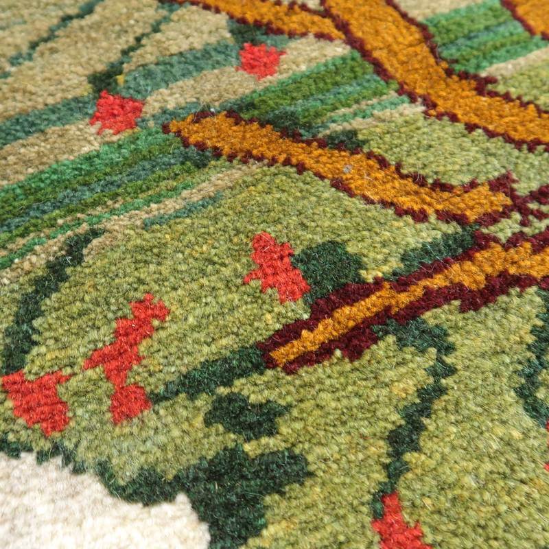 染色していない羊の原毛のやわらかな生成りの、そよ風のようなグラデーションを背景に、月夜とテント、こんもりと茂った大きな生命の木とそこに集う動物たちの風景を描いたアートデザイン。眺めて想像がふくらみます。上端186cm、下端192cmと横幅に手織りならではの差がございます。