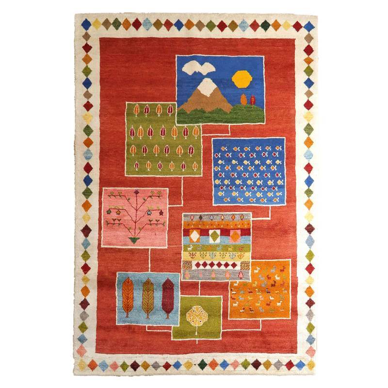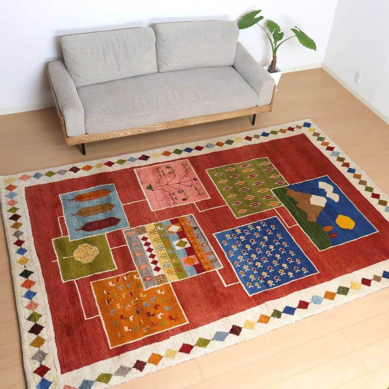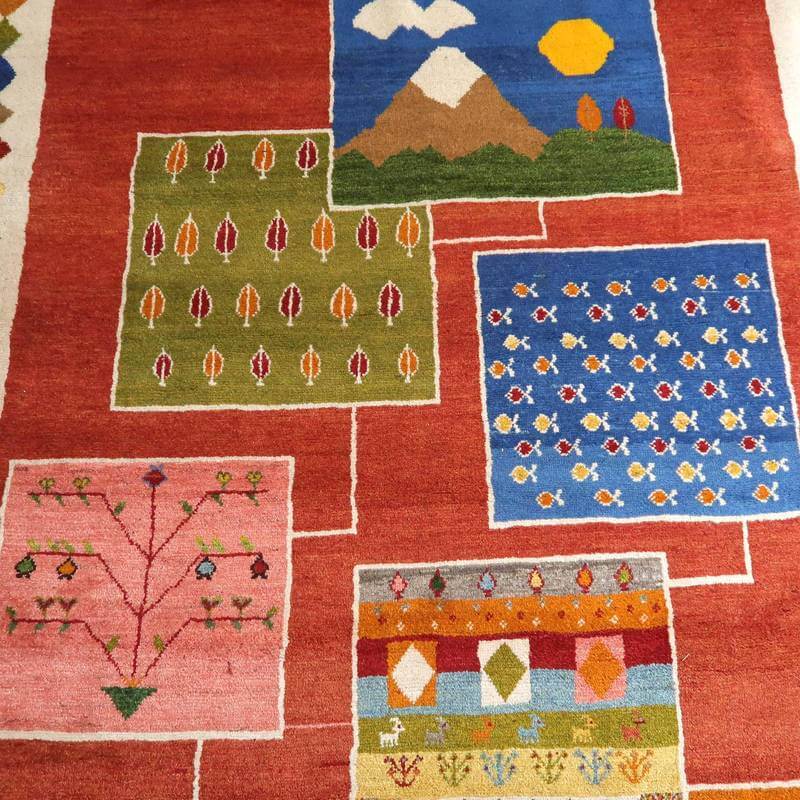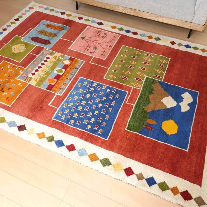 ほんわりとした優しい赤をベースに、生活で目にする自然の様子を切り取った風景柄を自由に配置した明るいイメージのギャッベ。山並みや、立ち並ぶ木々、魚の群れなど、思わず笑みがこぼれるような、眺めて楽しいデザインです。