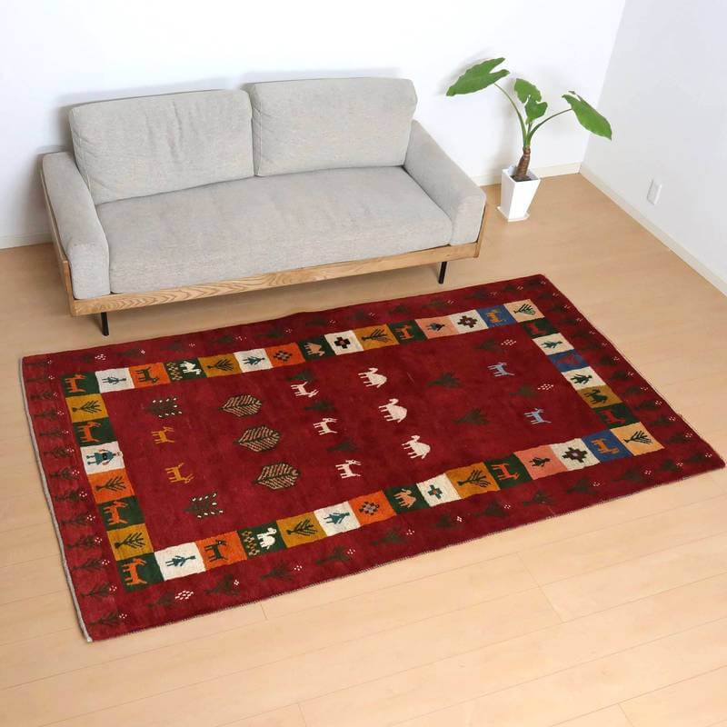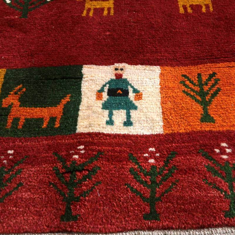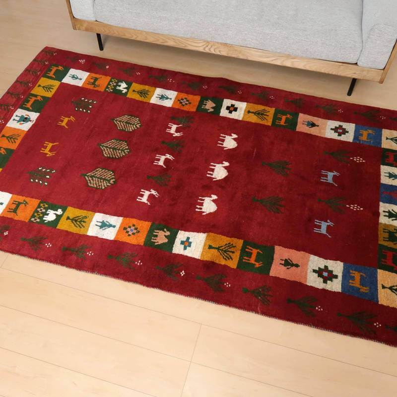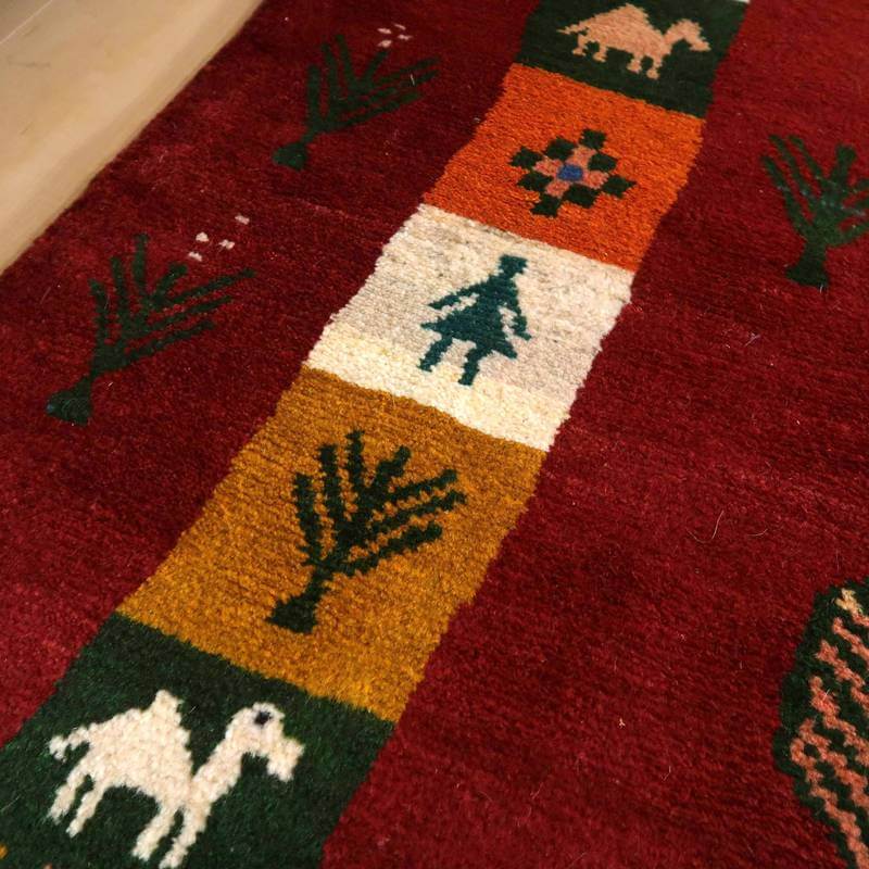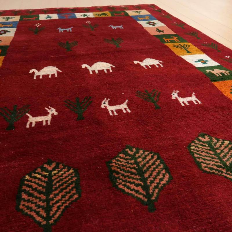 こっくりとした濃い目の赤をベースに、山羊やラクダ、生命の木がぱちっと入って可愛らしい印象。くるりと枠柄となったアースカラーの四角にも愛嬌のあるモチーフが入った、快活な雰囲気のデザインです。右端254cm、左端249cm、上端140cm、下端145cmと横幅に手織りならではの差がございます。