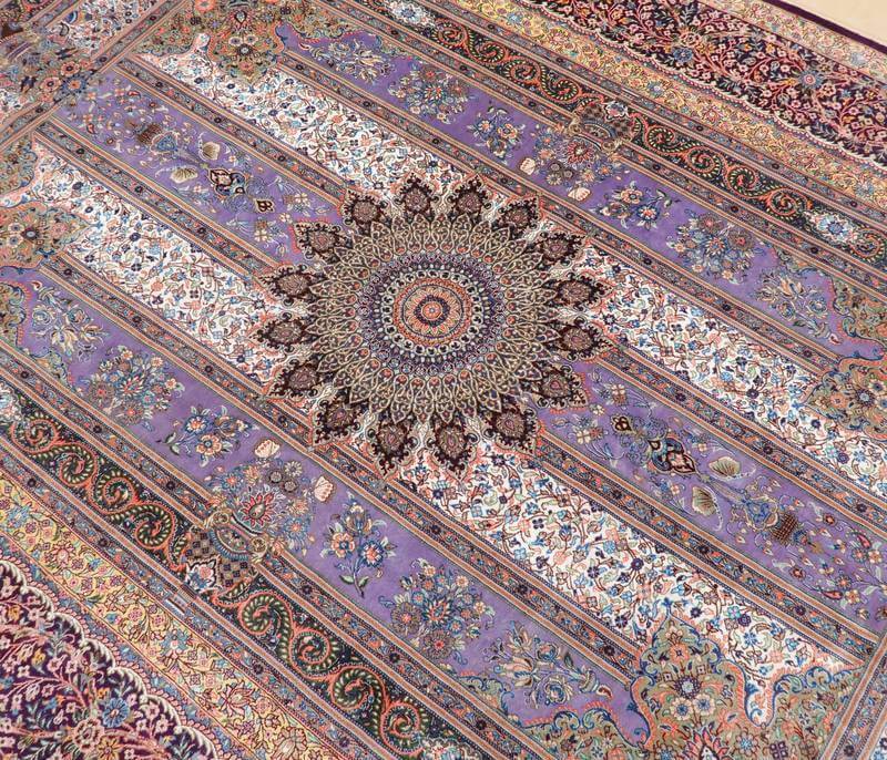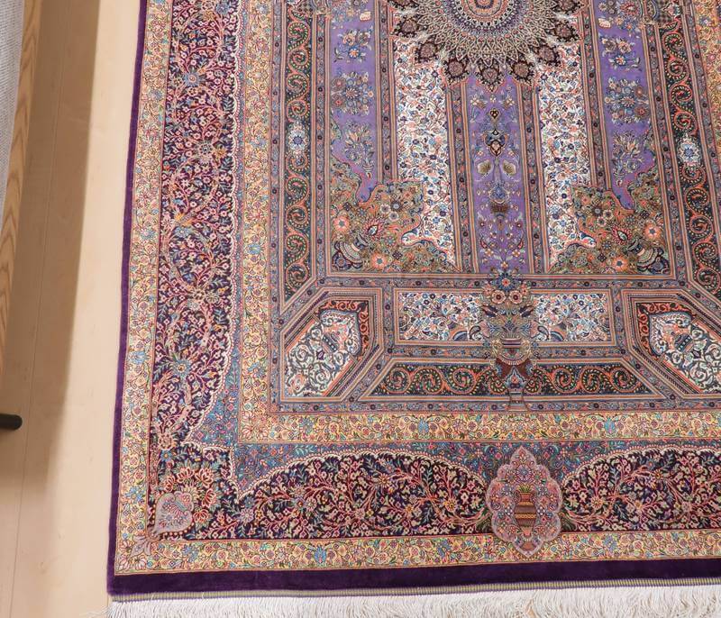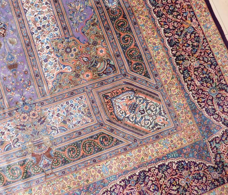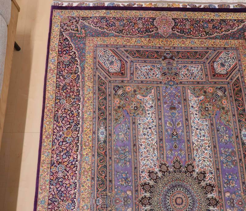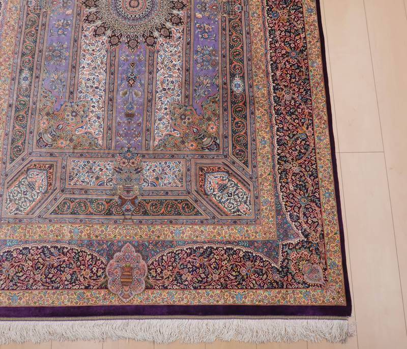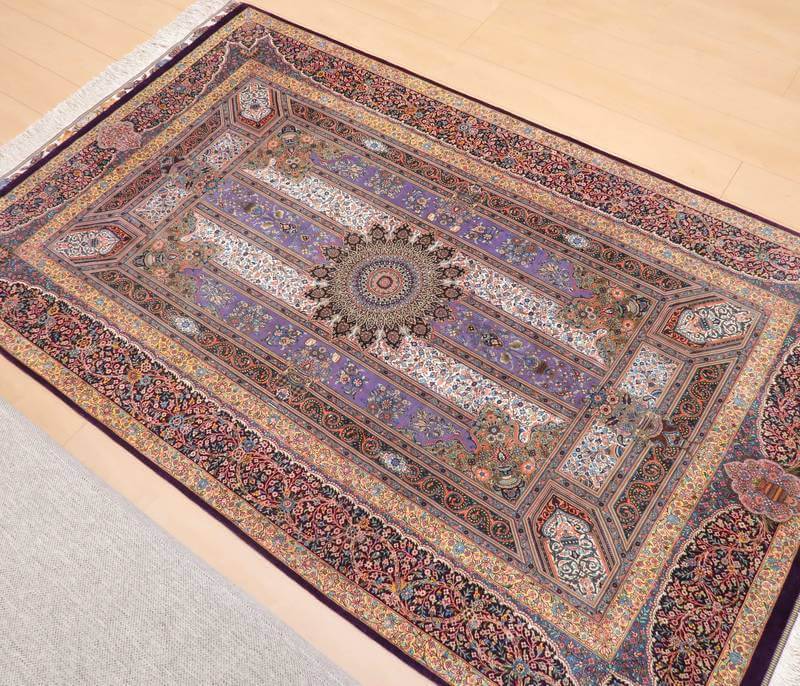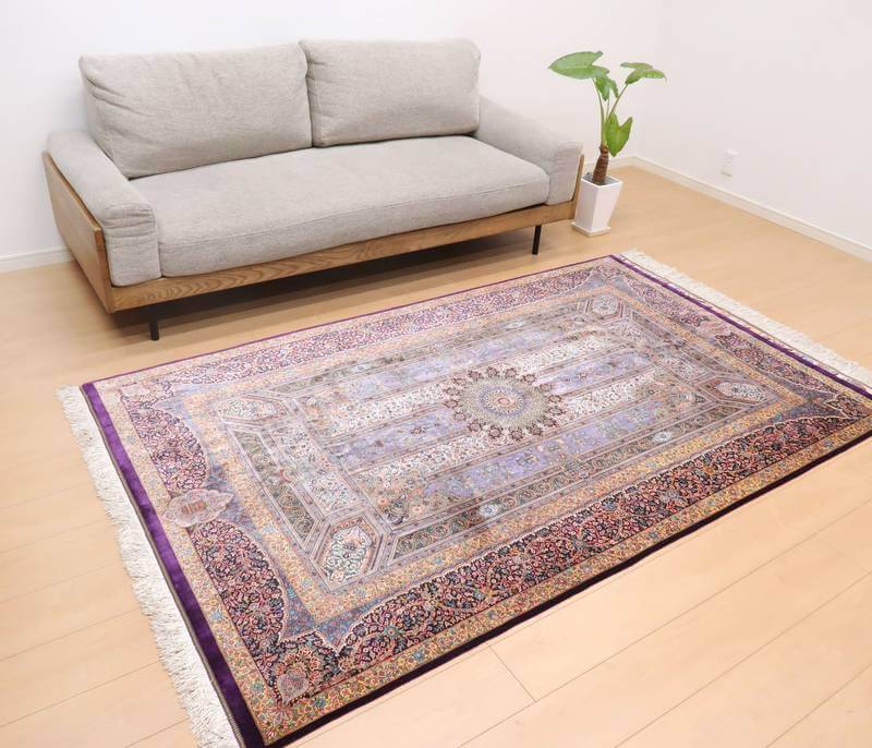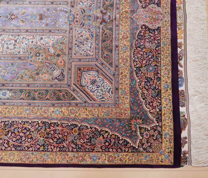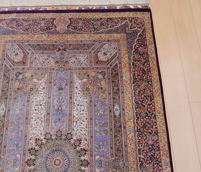 最高級のシルク絨毯の代名詞と言えばクム地方。その中でトップを誇るブランドであるのがジャムシーディ工房です。ふんわり柔らかな紫色とアイボリーのやさしげなニュアンスカラーのボーダーを主に、優美な曲線も入れながら、それぞれのスペースに美しい花を精密に織り描いています。どの向きから眺めてみても美しいデザイン・バランス、その計算され尽くした構図には感心させられます。気の遠くなるような正確で細密な手仕事の積み重ね、吸い付くような滑らかなシルクの手触り。工芸品ではなく美術品としての価値ある最高峰のペルシャ絨毯は、日々の生活に豊かな感動をもたらしてくれます。「ゴム(クム) ジャファール ジャムシーディ」のサイン入り。シルク絨毯は毛足の光沢により見る向きによってまったく趣の異なる色合いになります、敷く向きを好みで調整してください。