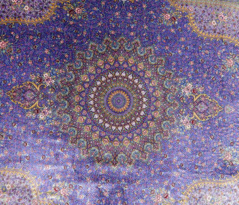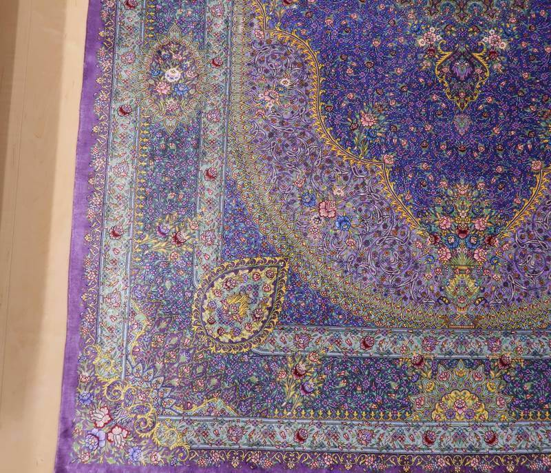 最高級のシルク絨毯の代名詞と言えばクム地方。その中でトップを誇るブランドであるのがジャムシーディ工房です。大きなメダリオンと優雅な曲線、華やかな花文様。上品な青と紫の取り合わせに色を添える黄色。それは、一つ一つの正確なハーモニーが響きあって奏でられる交響曲のように感じられます。どの向きから眺めてみても美しいデザイン・バランス、その計算され尽くした構図には感心させられます。気の遠くなるような正確で細密な手仕事の積み重ね、吸い付くような滑らかなシルクの手触り。工芸品ではなく美術品としての価値ある最高峰のペルシャ絨毯は、日々の生活に豊かな感動をもたらしてくれます。「ゴム(クム) ジャムシーディ」のサイン入り。ジャムシーディからの直接買付品です。シルク絨毯は毛足の光沢により見る向きによってまったく趣の異なる色合いになります、敷く向きを好みで調整してください。