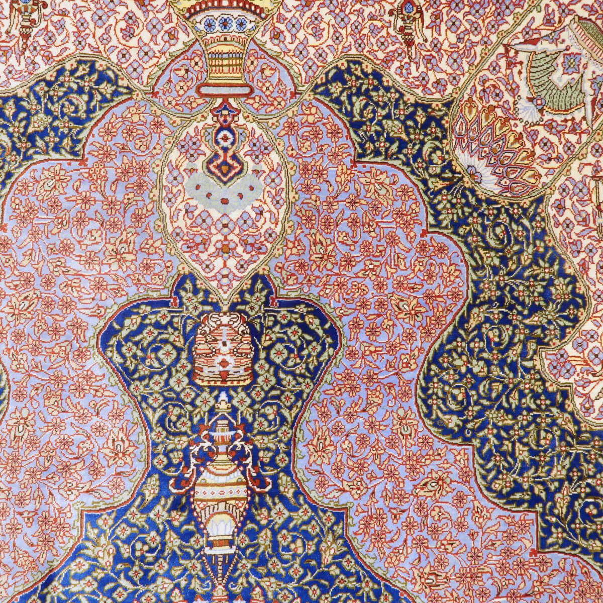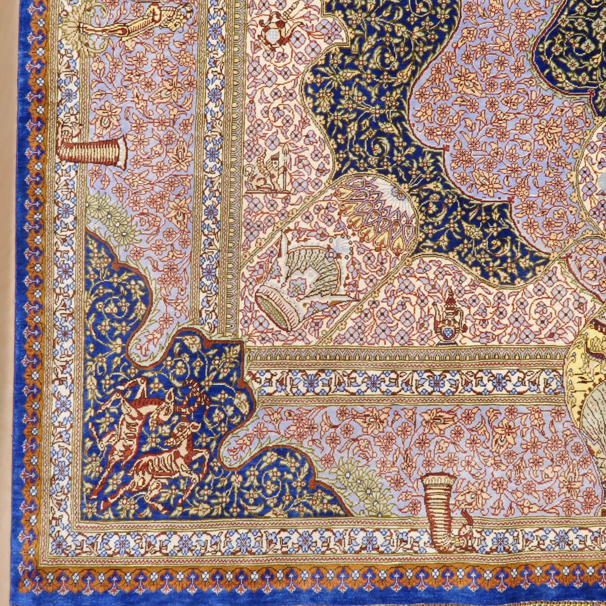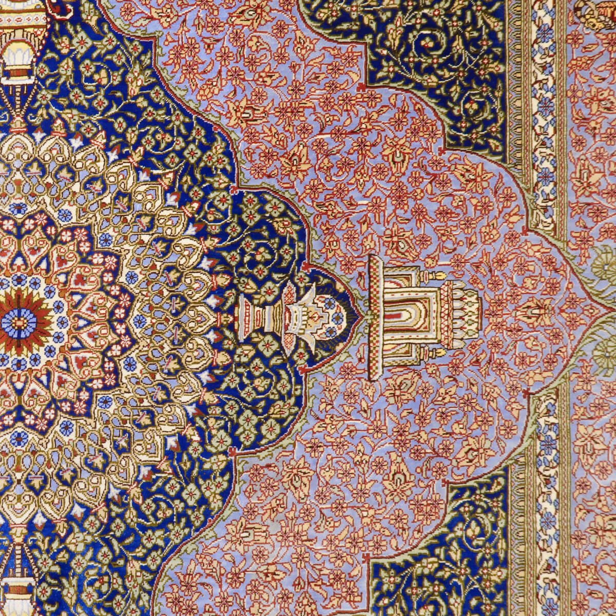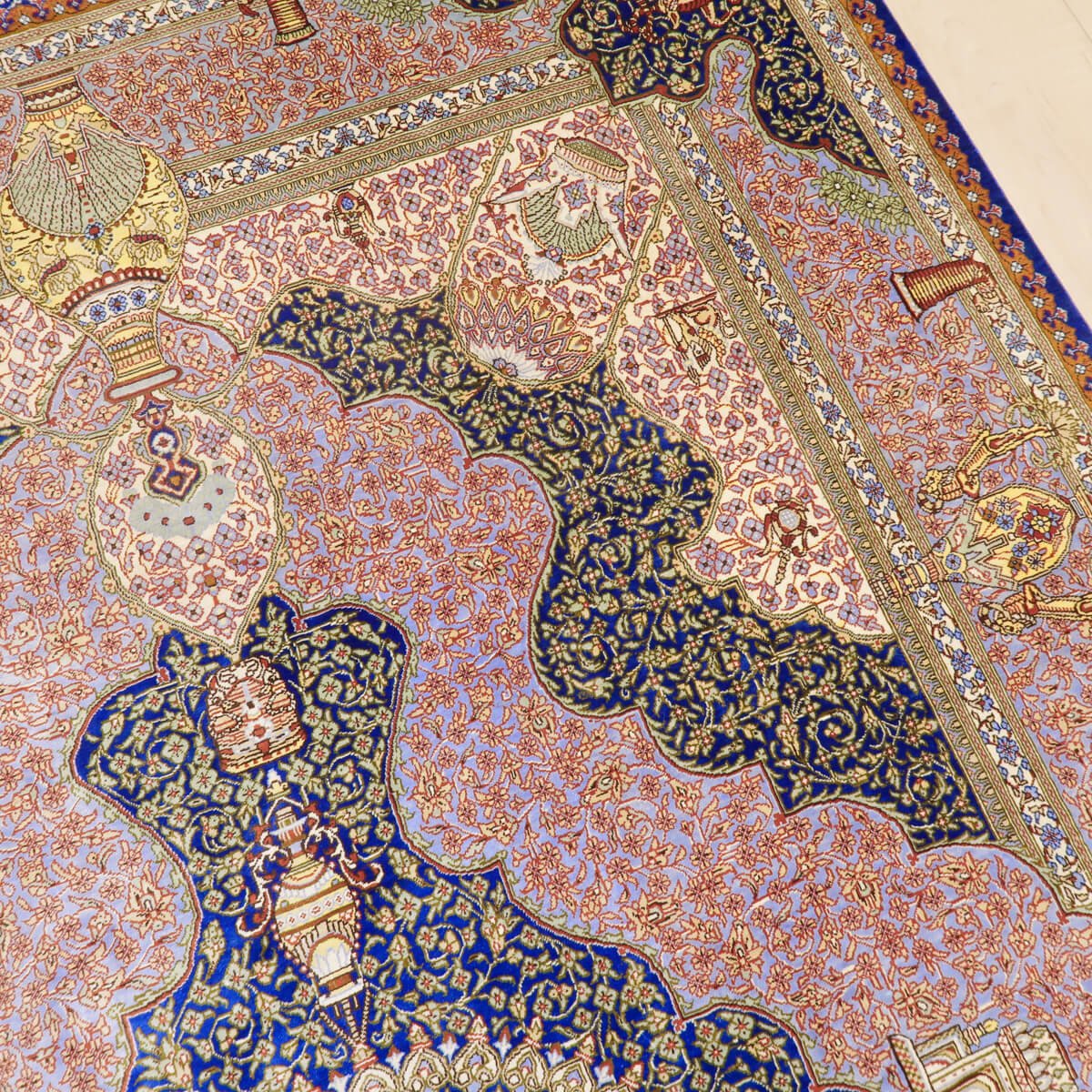 ソフトな青紫色と紺色を基調とした落ち着きのある色使い。2つの大きな壺から立つ煙のようなくねる曲線、ペルセポリスに見られるような古代のモチーフを大小随所に織り入れているので、一つ一つ眺めて楽しく、ペルシャの雰囲気たっぷりのデザインです。手に取れば、しっとり吸い付くようなシルクの滑らかな感触にうっとり。まさに、「The ペルシャ絨毯」と言うべき最高峰のペルシャ絨毯は、もはや工芸品ではなく美術品としての価値となります。「イラン ゴム(クム) ジャムシーディ」のサイン入り。シルクの絨毯は毛足の光沢が見る向きによってまったく趣の異なる色合いになりますので、敷く際は向きを調整してください。