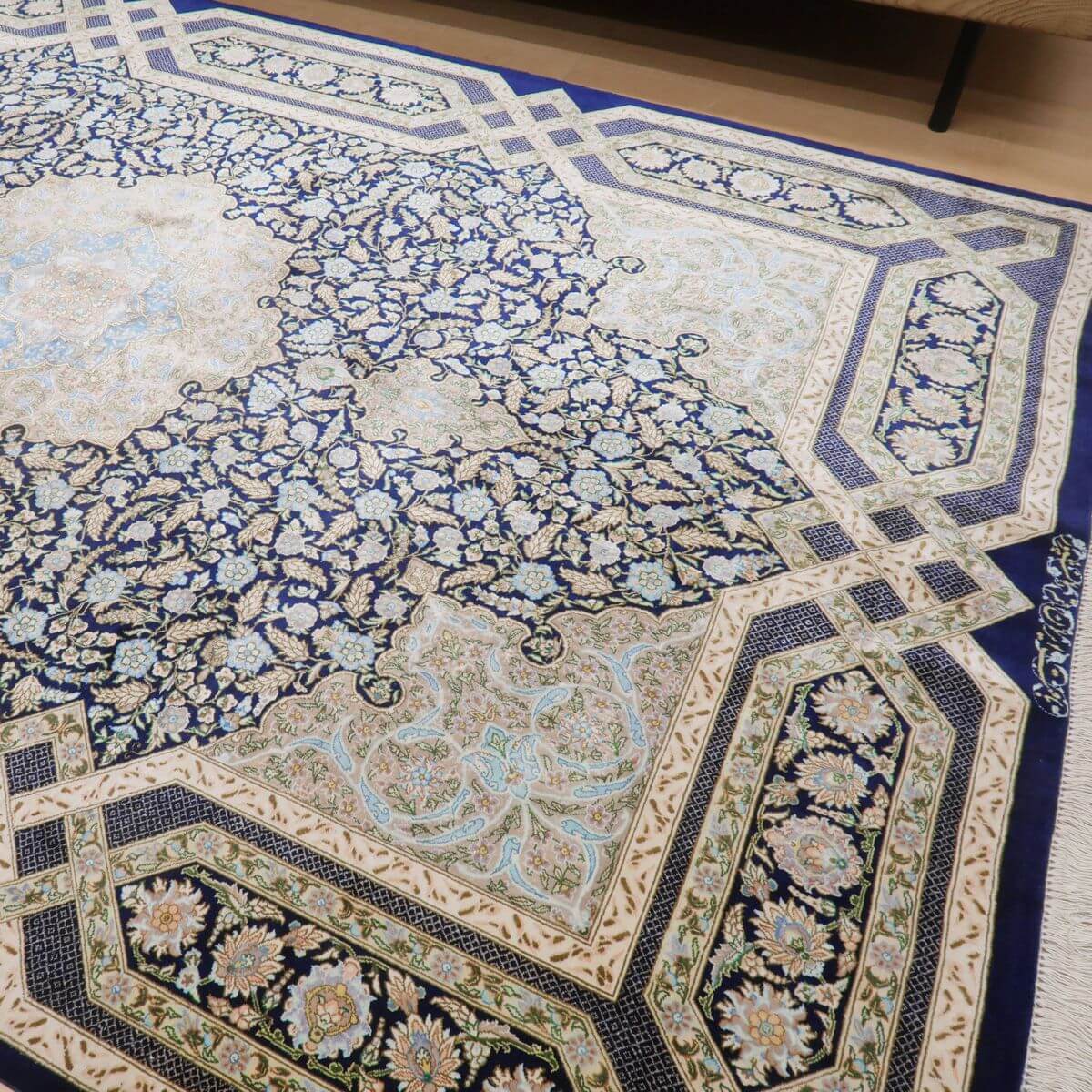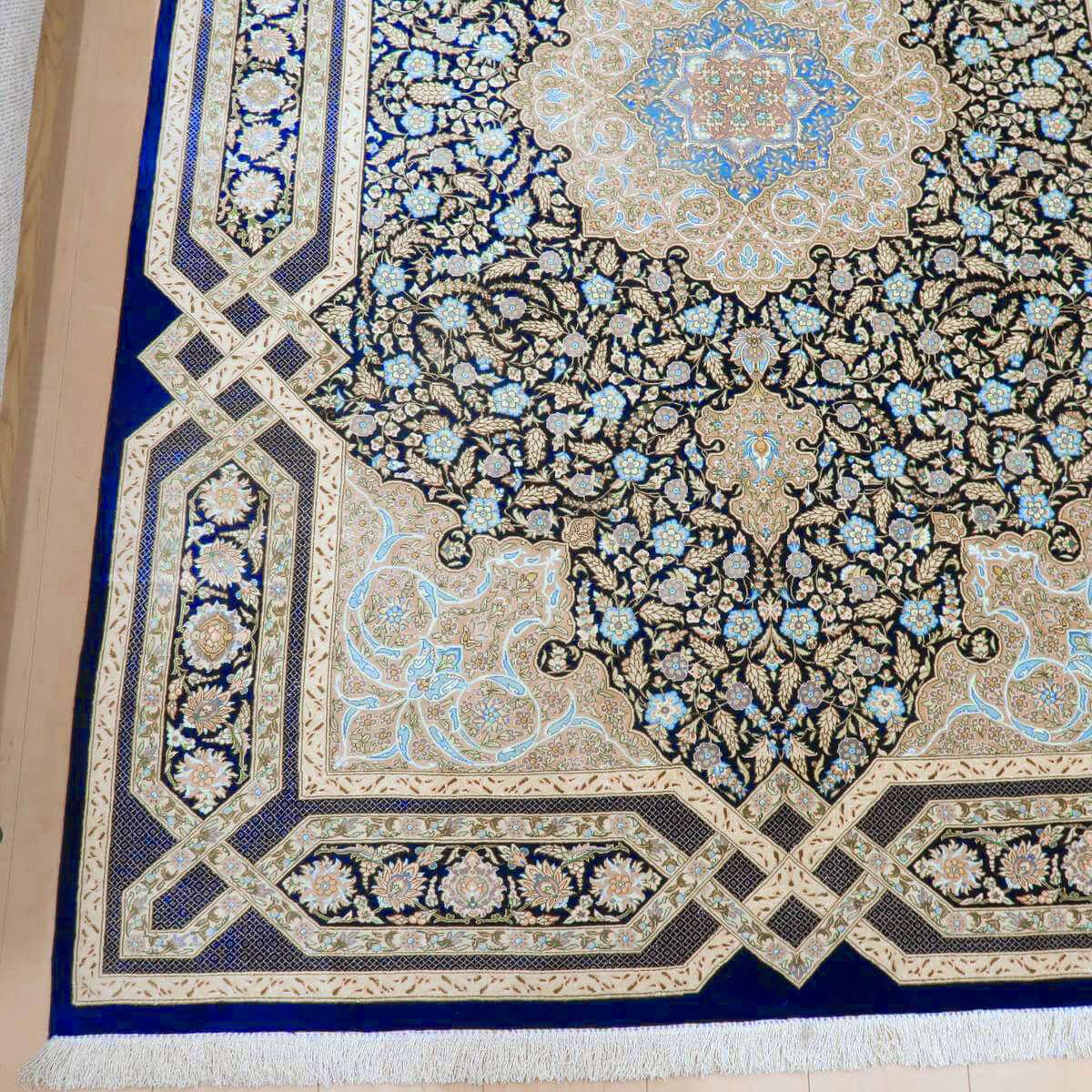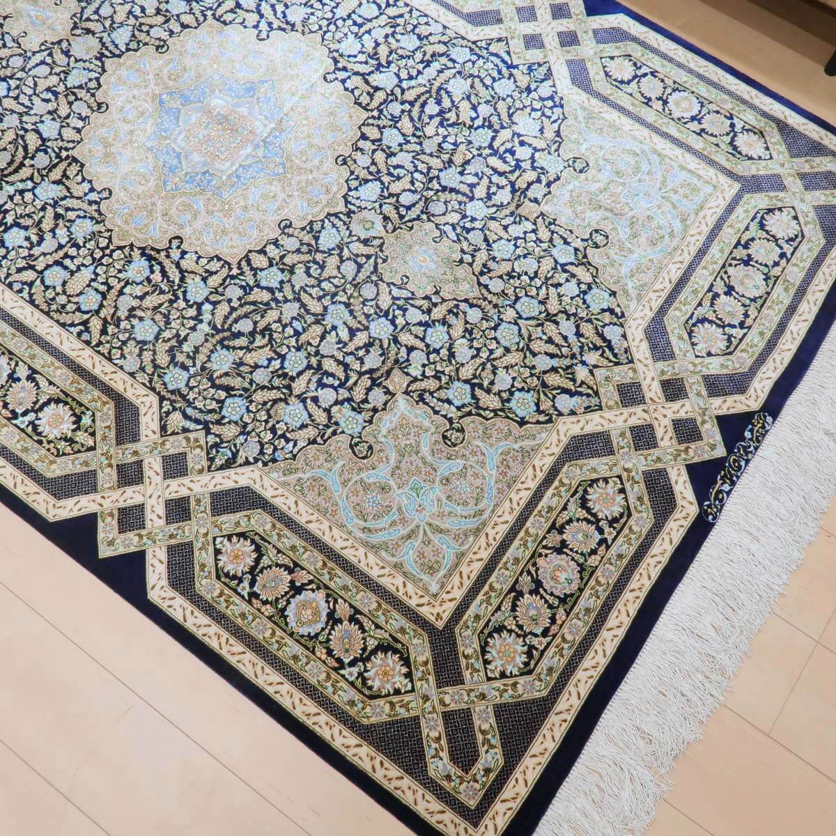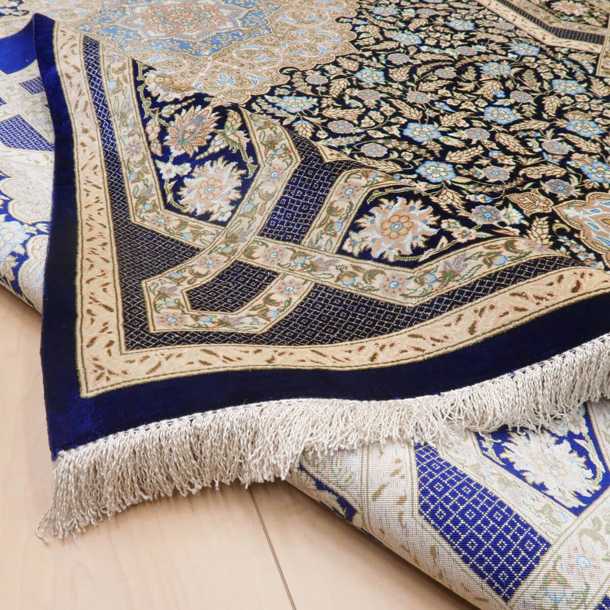 交わる直線のラインがインパクトのある美しいメダリオンコーナー・デザイン。冴えのある濃紺の地色の上にジャンパンゴールドと薄ベージュが輝くようなコントラスト。それをいかす様に、デザインは淡い青系など同系色の柔らかな配色としています。驚くような細かな織り目とビロードのような生地、肌に吸い付くようなシルクの艶やかな光沢感が豪華絢爛。まさに、「The ペルシャ絨毯」と言うべき最高峰のペルシャ絨毯は、もはや工芸品ではなく美術品としての価値となります。「バフテ イラン ゴム(クム) ダネシプール」のサイン入り。シルクの絨毯は毛足の光沢が見る向きによってまったく趣の異なる色合いになりますので、敷く際は向きを調整してください。手織りの為、上端で幅134センチ、下端の幅140センチと横幅に差異がございます。