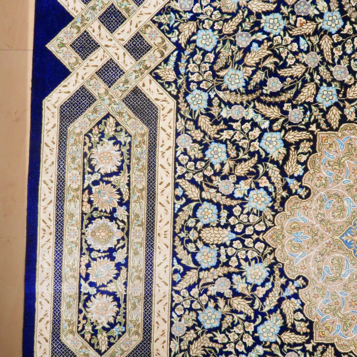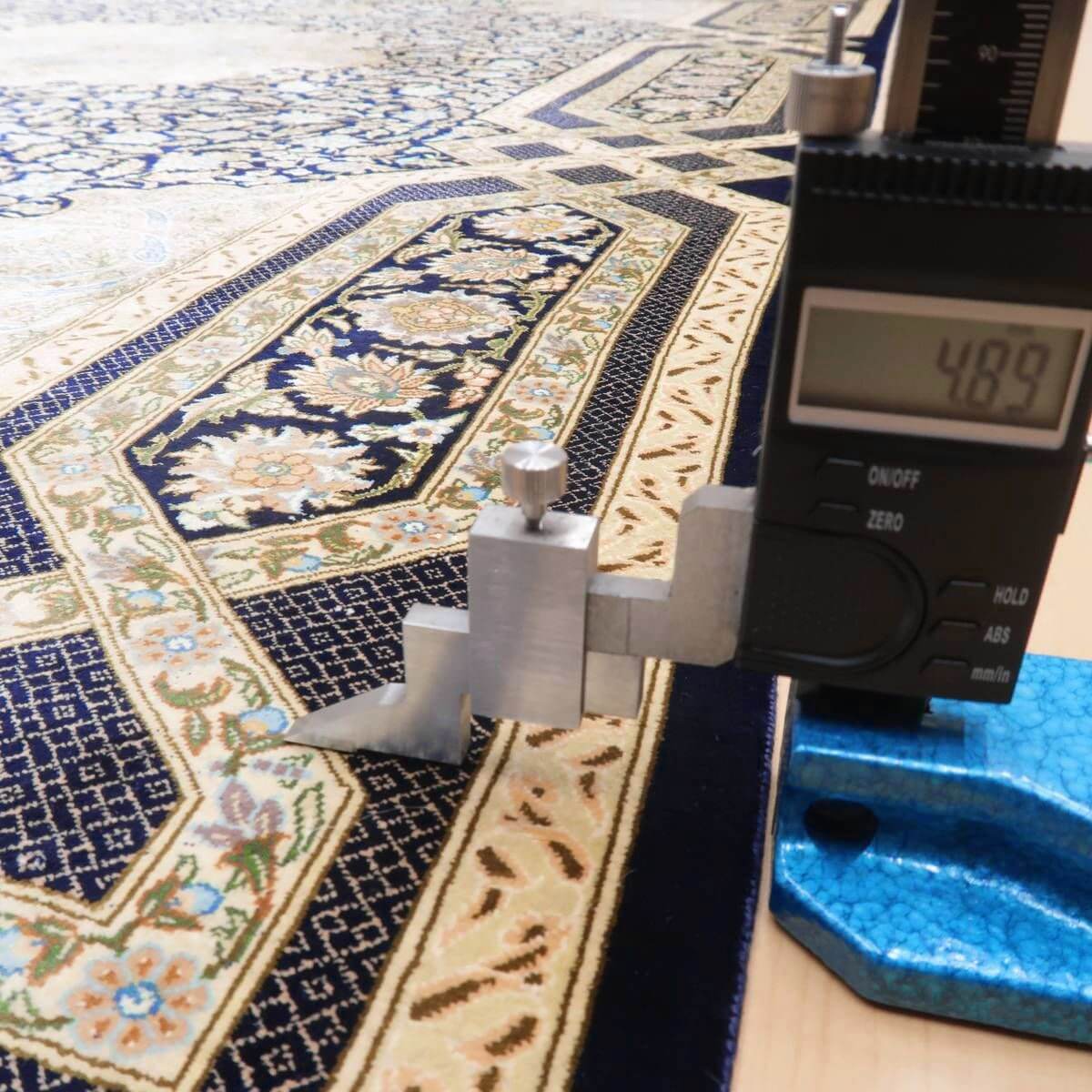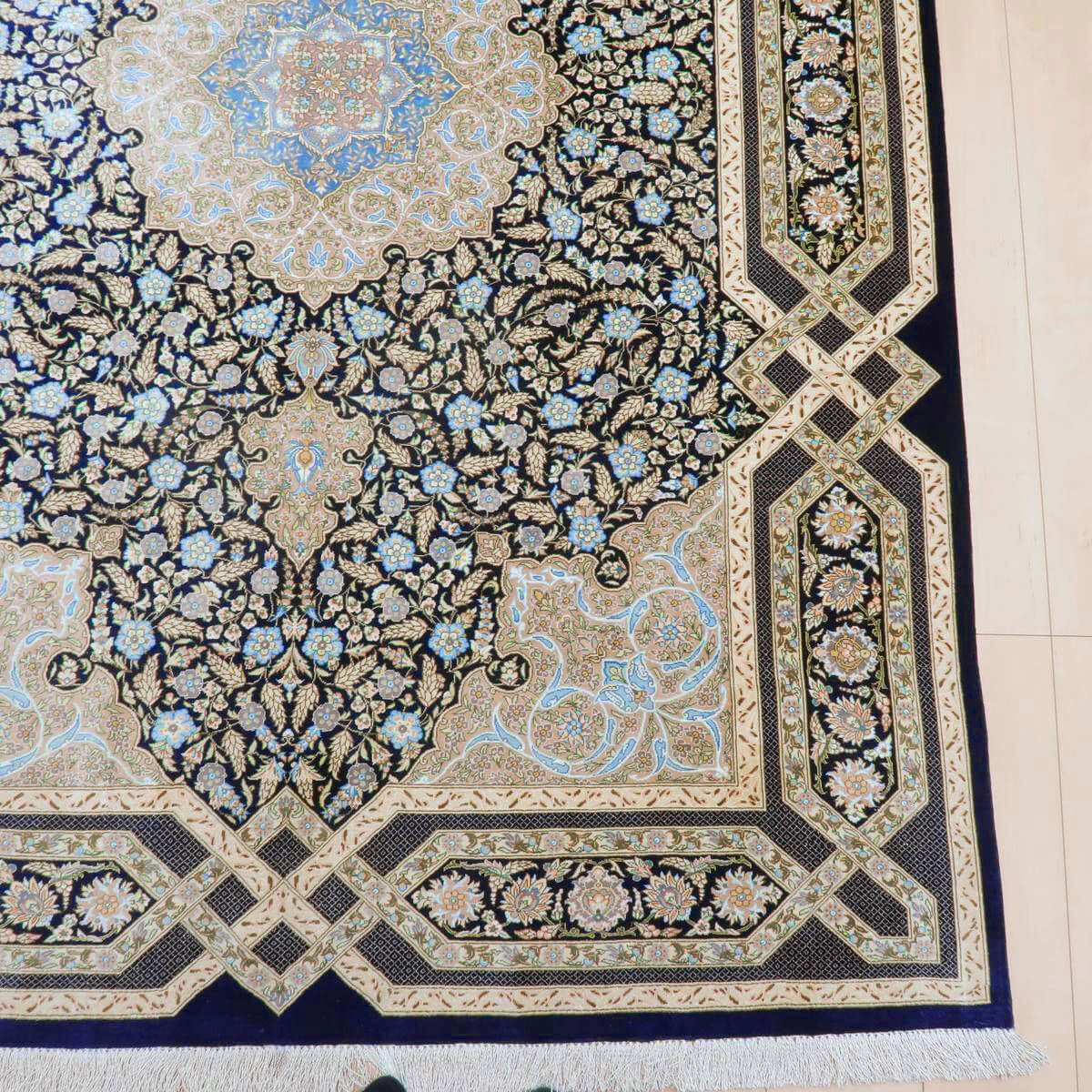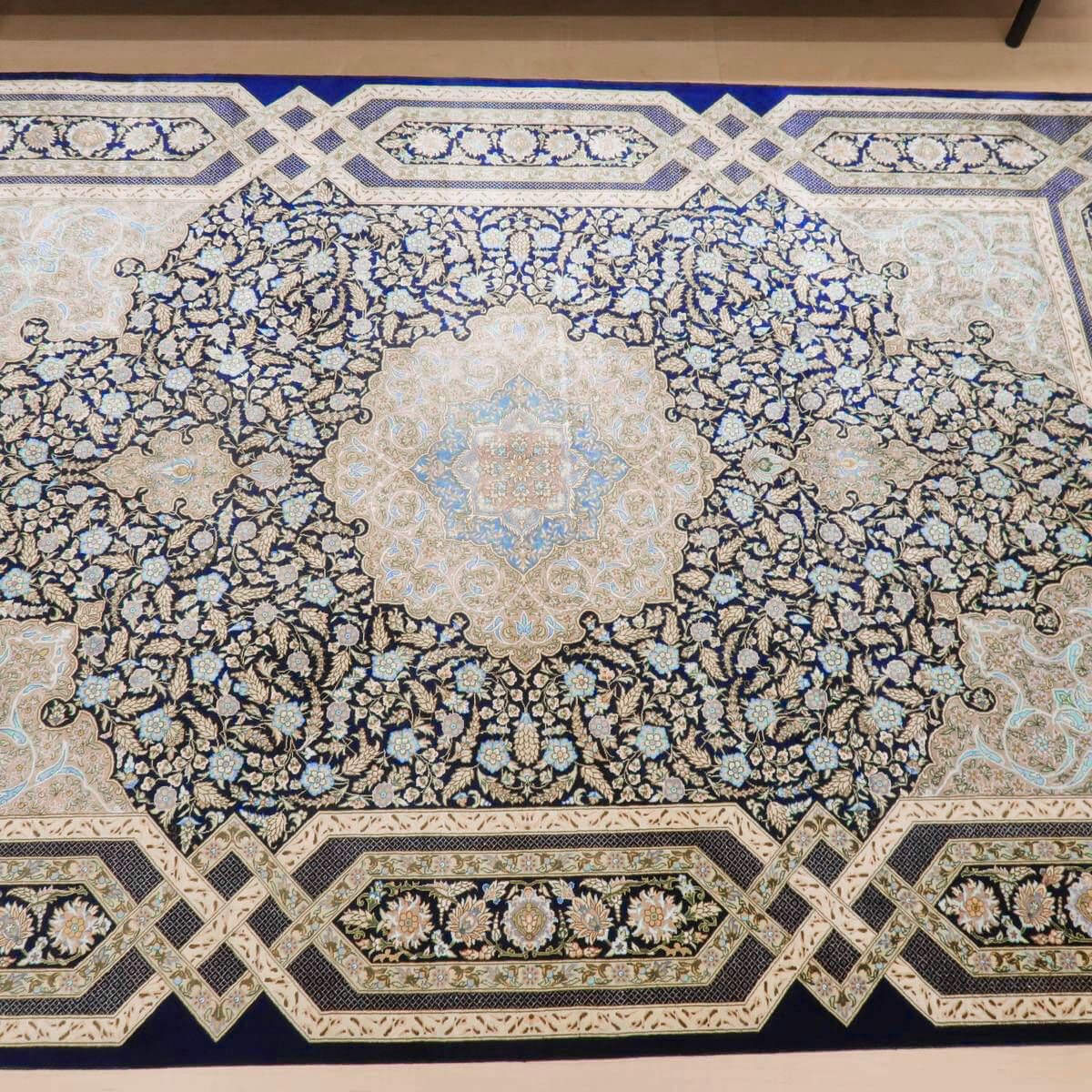 交わる直線のラインがインパクトのある美しいメダリオンコーナー・デザイン。冴えのある濃紺の地色の上にジャンパンゴールドと薄ベージュが輝くようなコントラスト。それをいかす様に、デザインは淡い青系など同系色の柔らかな配色としています。驚くような細かな織り目とビロードのような生地、肌に吸い付くようなシルクの艶やかな光沢感が豪華絢爛。まさに、「The ペルシャ絨毯」と言うべき最高峰のペルシャ絨毯は、もはや工芸品ではなく美術品としての価値となります。「バフテ イラン ゴム(クム) ダネシプール」のサイン入り。シルクの絨毯は毛足の光沢が見る向きによってまったく趣の異なる色合いになりますので、敷く際は向きを調整してください。手織りの為、上端で幅134センチ、下端の幅140センチと横幅に差異がございます。