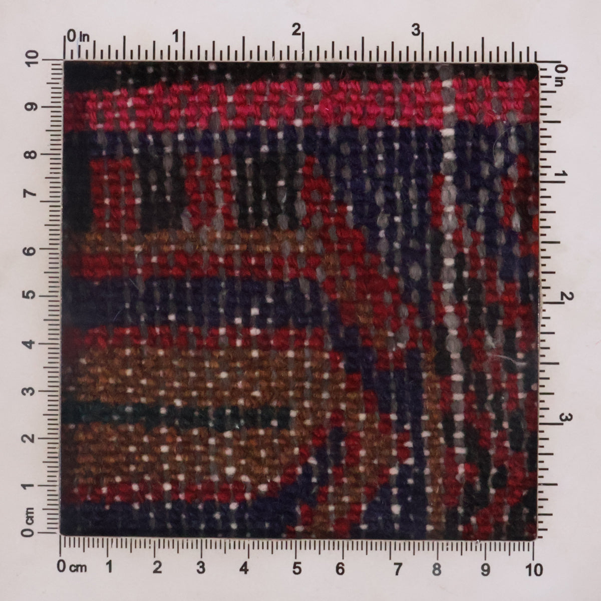 ・深みのあるレンガレッドをベースに、ブラックやネイビーがアクセントとして織り込まれています。